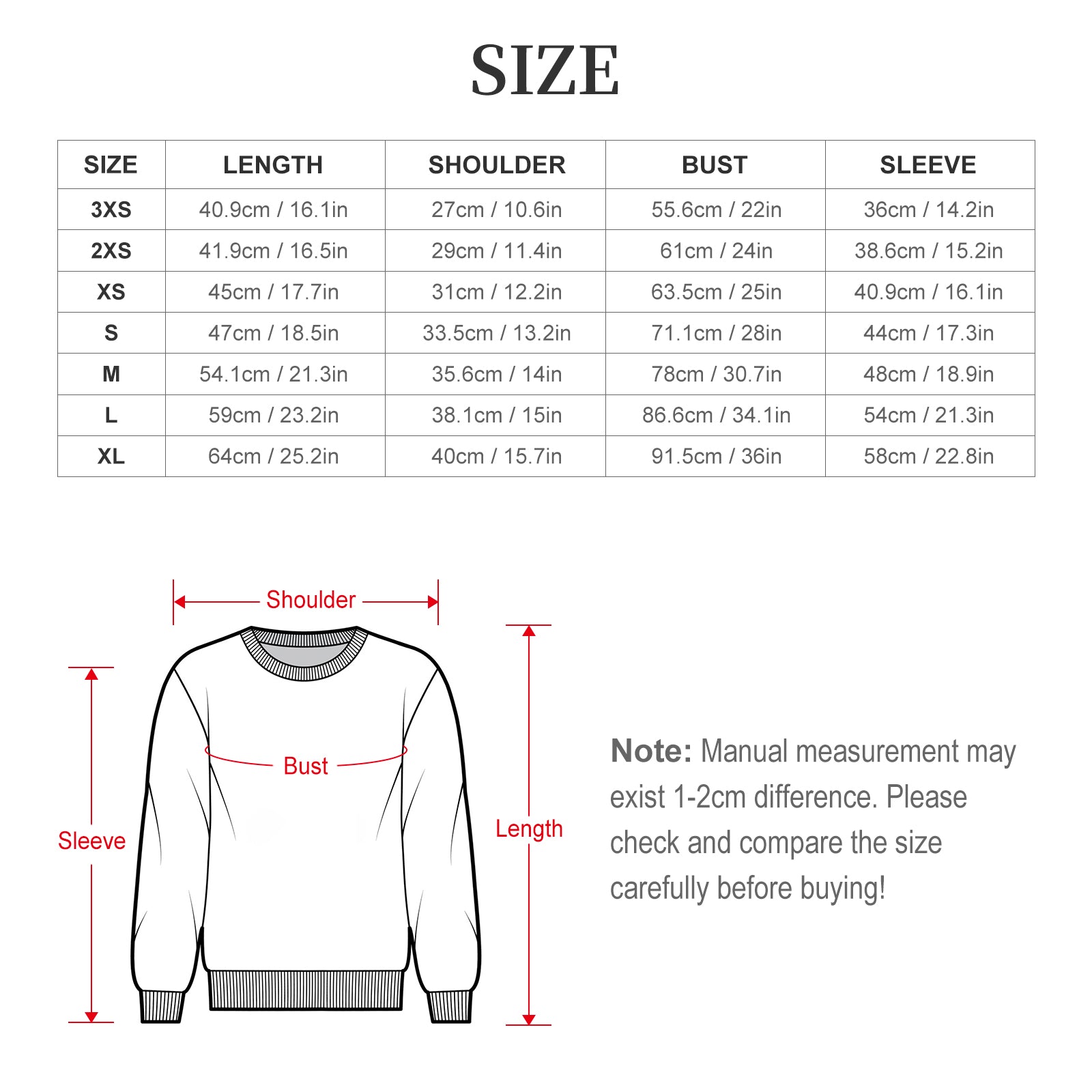 | Size | Length (cm/in) | 1/2 Shoulder (cm/in) | Chest (cm/in) | Sleeve Length (cm/in) |