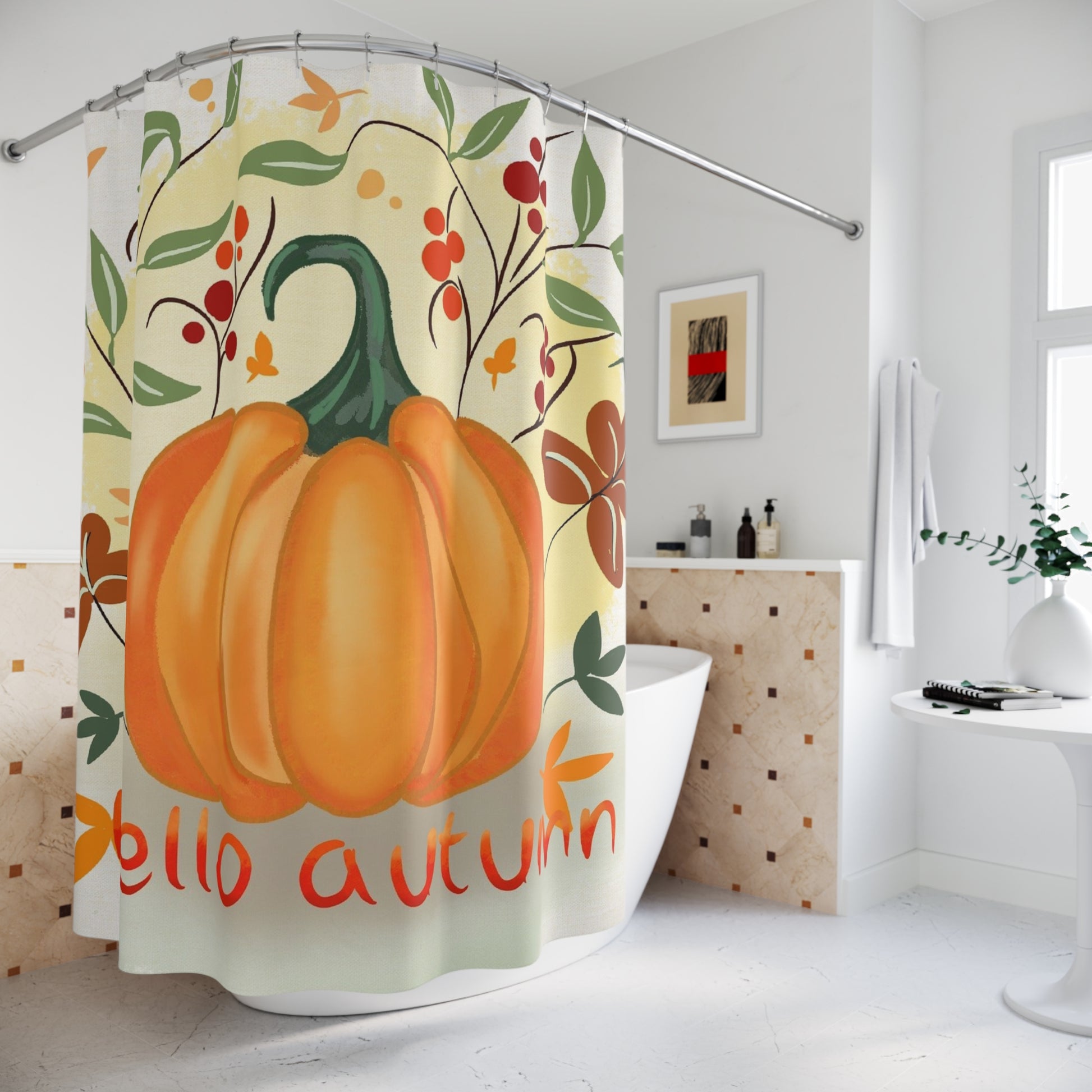 Transform your bathroom into a cozy oasis with this vibrant shower curtain. Featuring a charming pumpkin design surrounded by autumnal foliage, this product brings a warm and inviting atmosphere to your space. Perfect for embracing the fall season, it's an excellent addition for anyone looking to refresh their bathroom decor. Ideal for seasonal celebrations like Halloween and Thanksgiving, this shower curtain is a delightful choice for those who love to welcome autumn into their homes. Whether you're a fan of festive decor or simply want to add a splash of color, this shower curtain will fit seamlessly into your lifestyle, making every shower feel like a seasonal celebration.