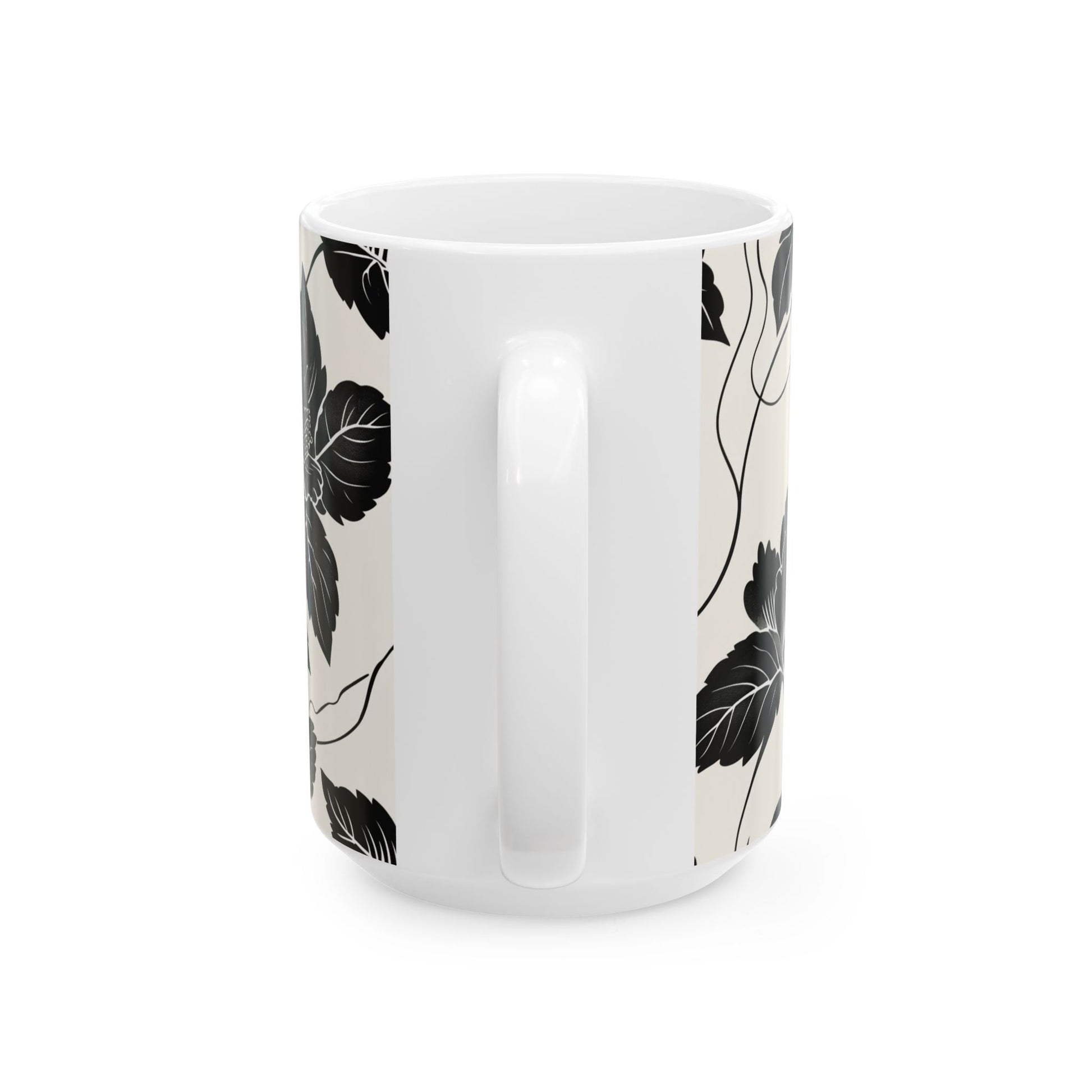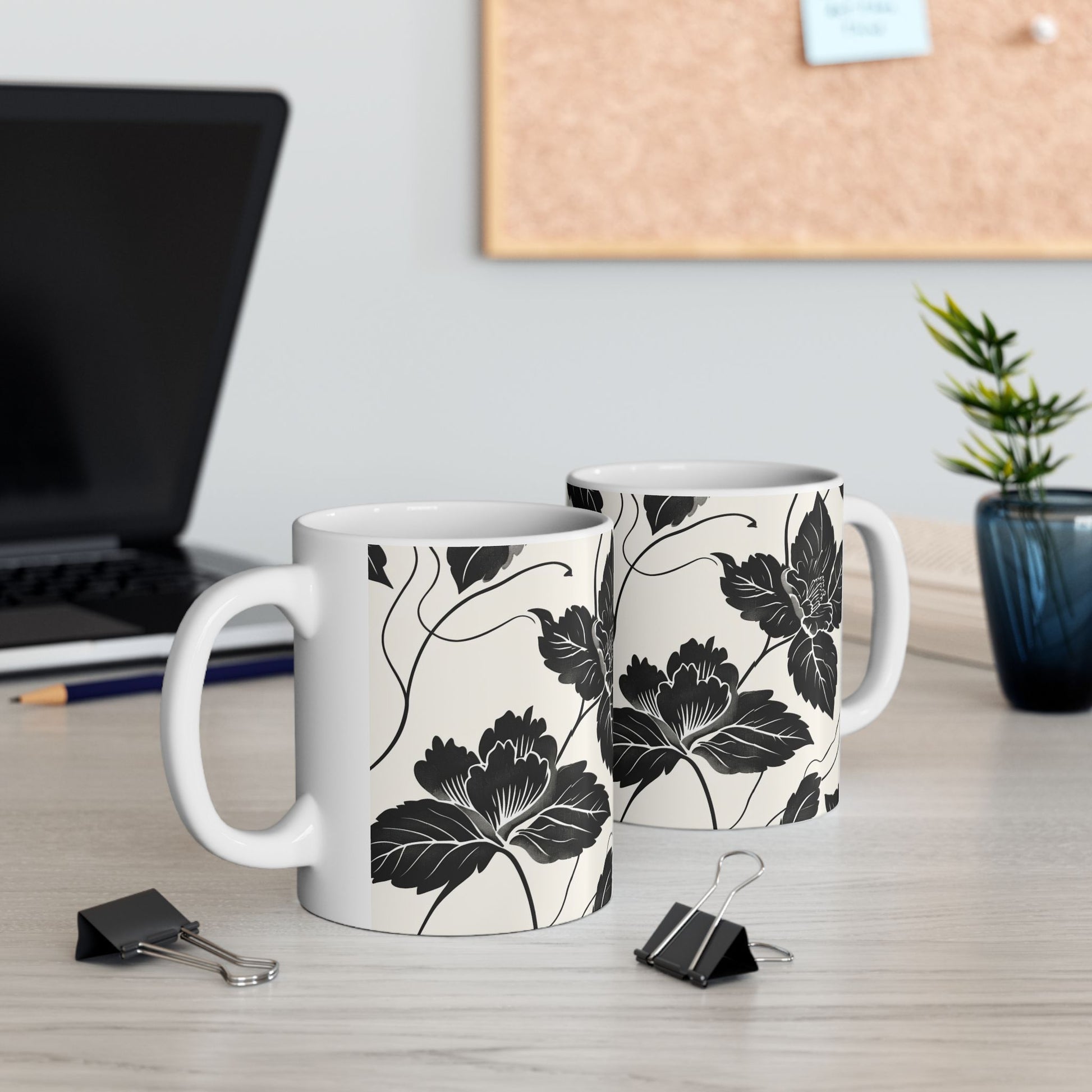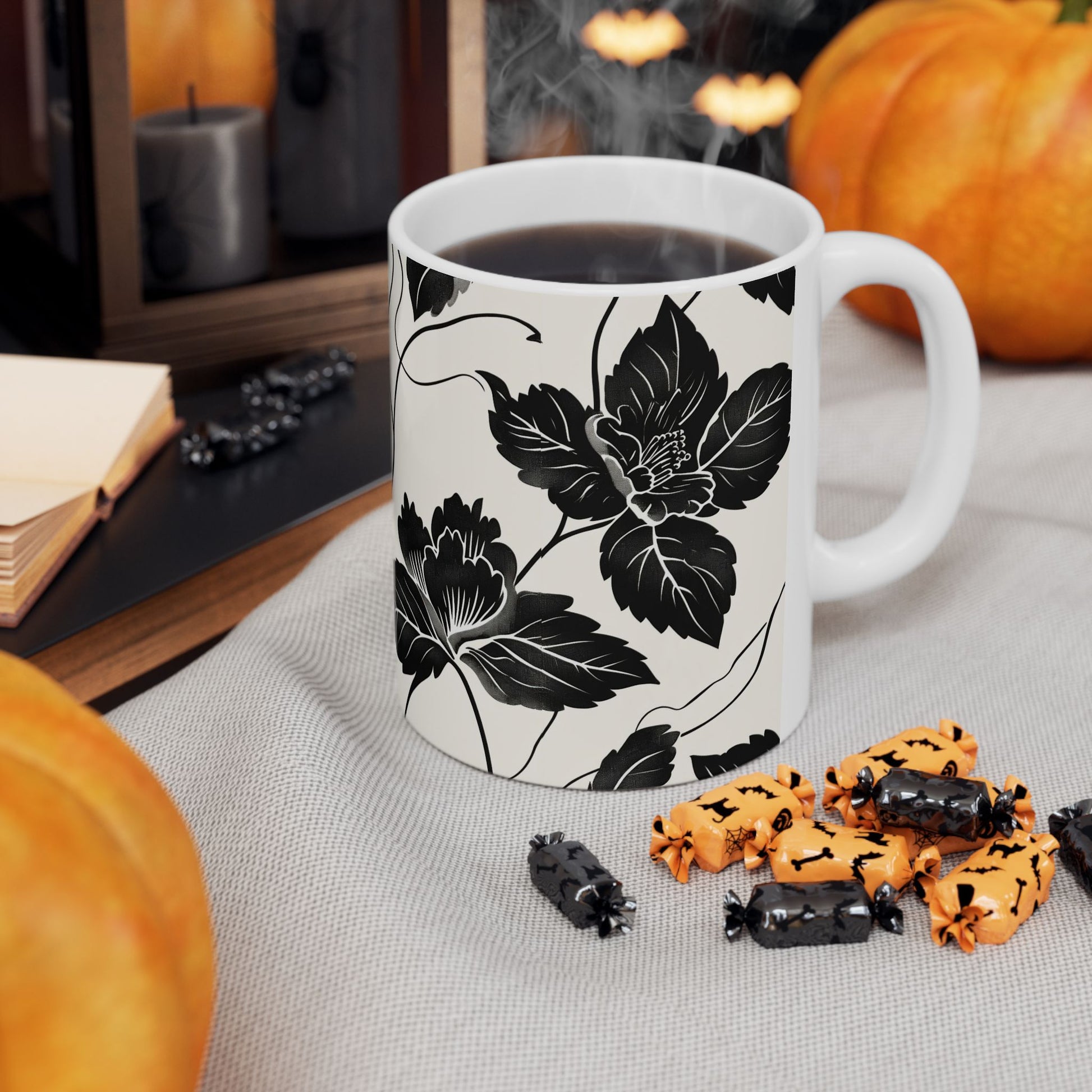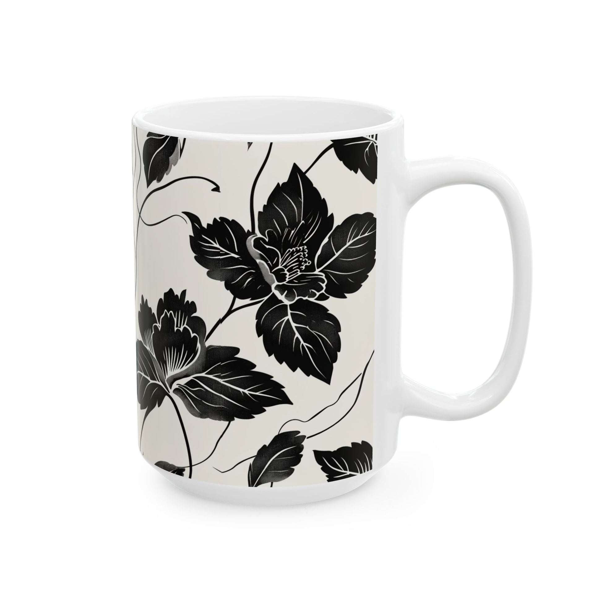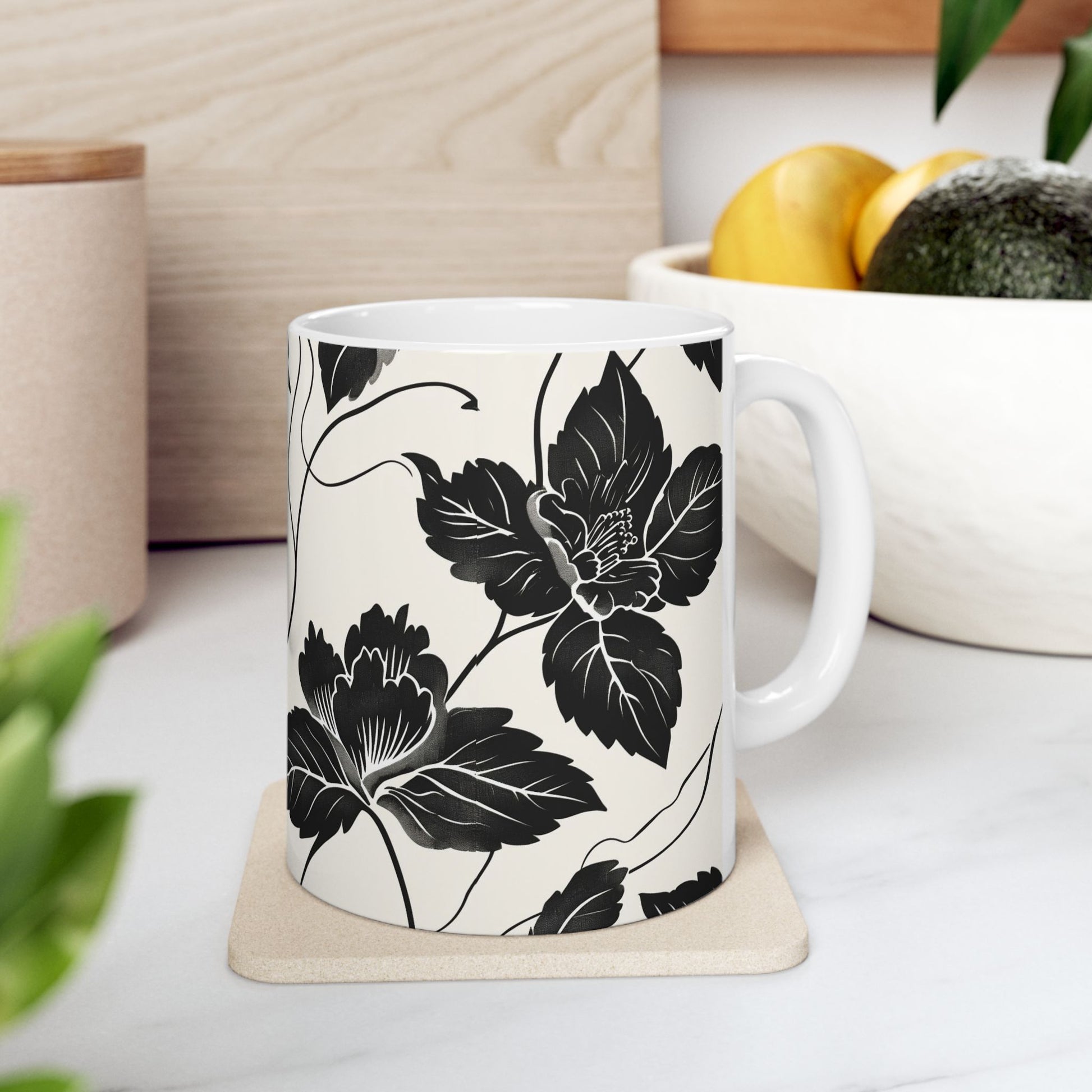 A ceramic mug that turns small rituals into quiet moments of beauty. Smooth, glossy white ceramic wraps around a hand-drawn black floral pattern—delicate vines and bold petals that read like ink on cream. It feels weighty and familiar in the hand, the C-handle sitting just right for slow sips. Whether it’s your first coffee at dawn or a late-night tea break, the contrast of deep monochrome art against a soft background brings an elegant, slightly vintage mood to the table. It slips easily into a shelf of collected pottery or stands out on a minimalist desk, adding calm, graphic charm to everyday routines and seasonal gatherings.