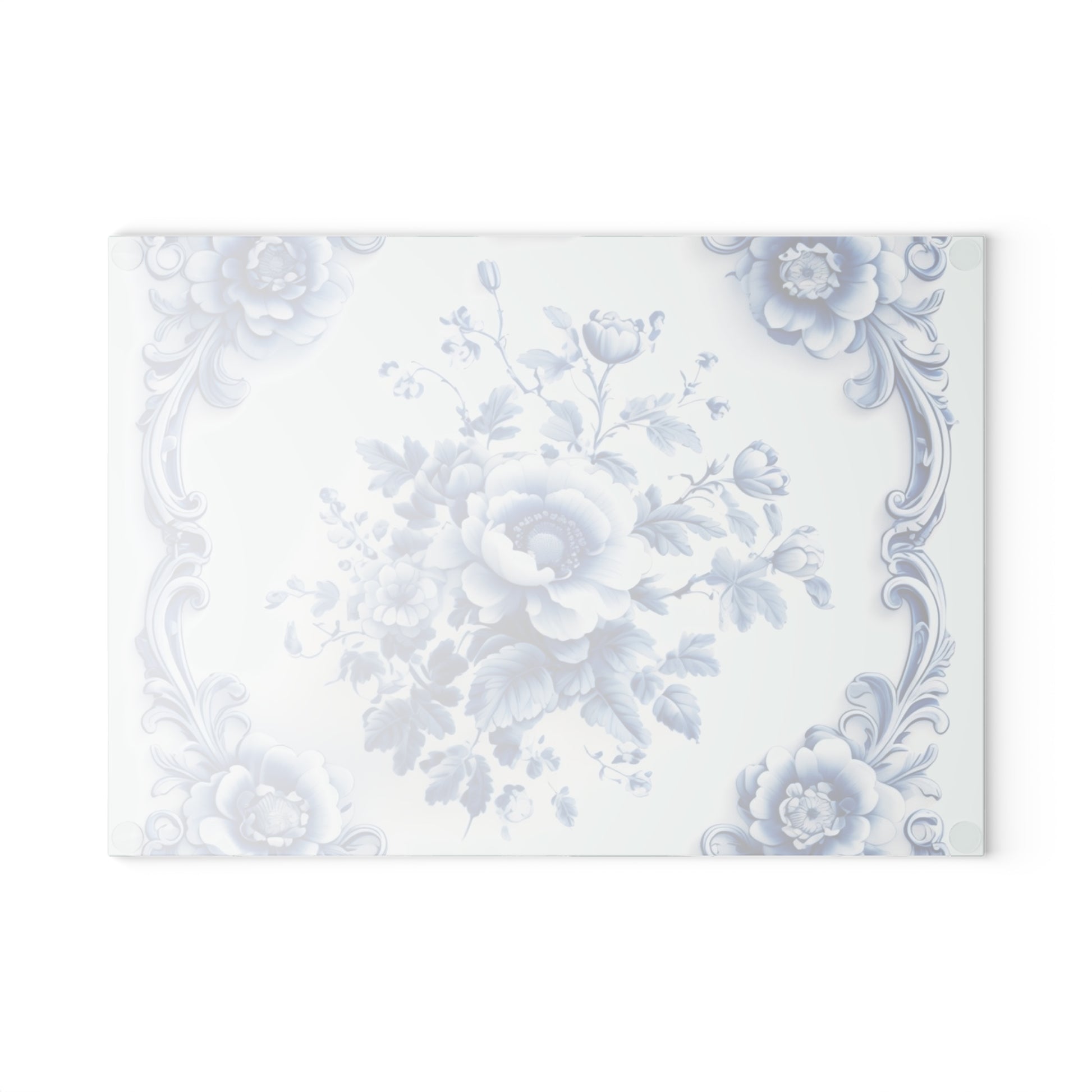This tempered glass cutting board brings soft, vintage charm to everyday kitchen tasks. A delicate blue floral motif, rendered in crisp, vibrant printing, sits against a pale background and feels like a cherished heirloom—without the maintenance. The textured tempered surface is hygienic and resists stains and odors better than wood or plastic. Four small rubber feet hold it steady on counters while you chop or use it as an elegant cheese board for guests. Available in two sizes to suit quick prep or larger spreads. Hand wash recommended to keep the colors vivid and the print flawless over time.