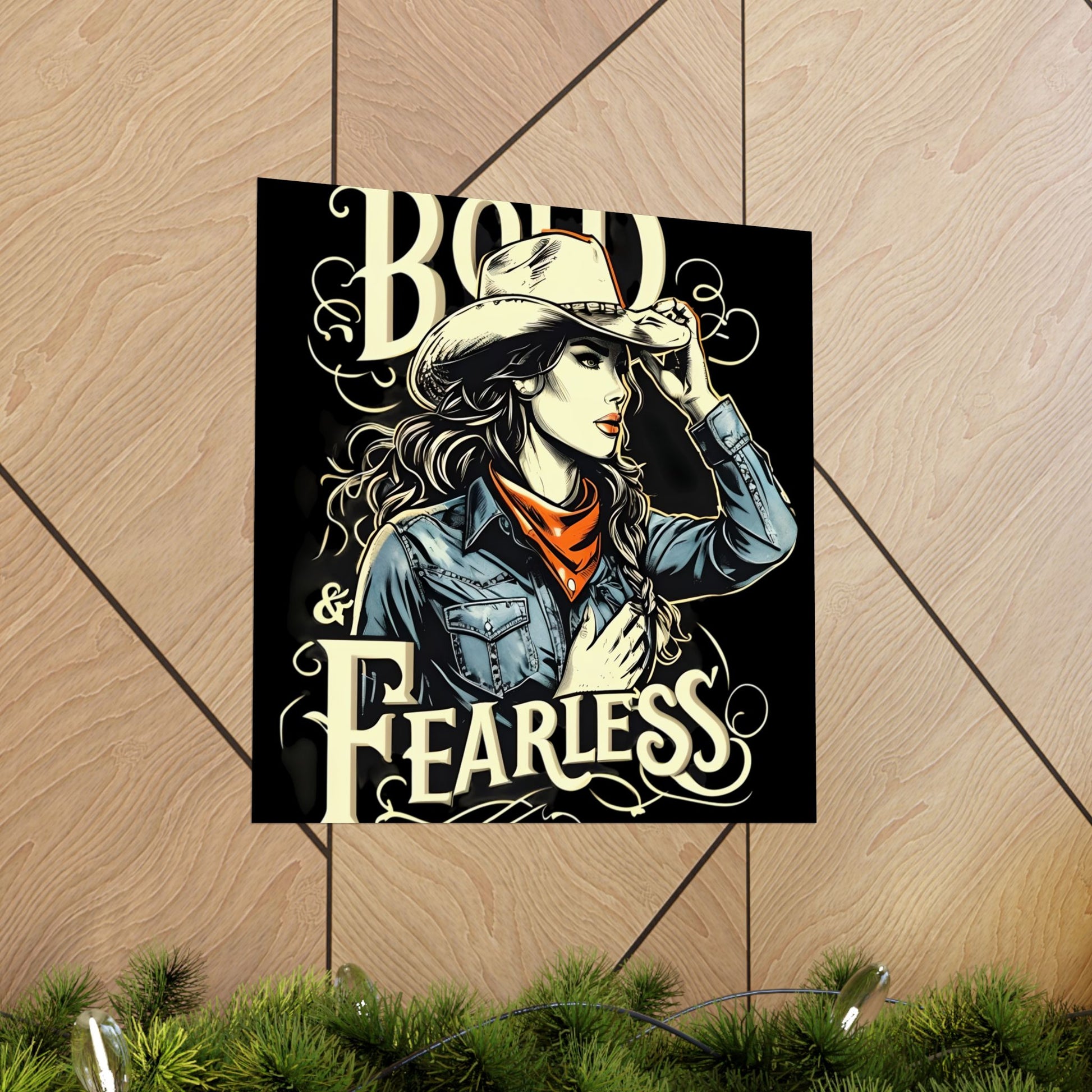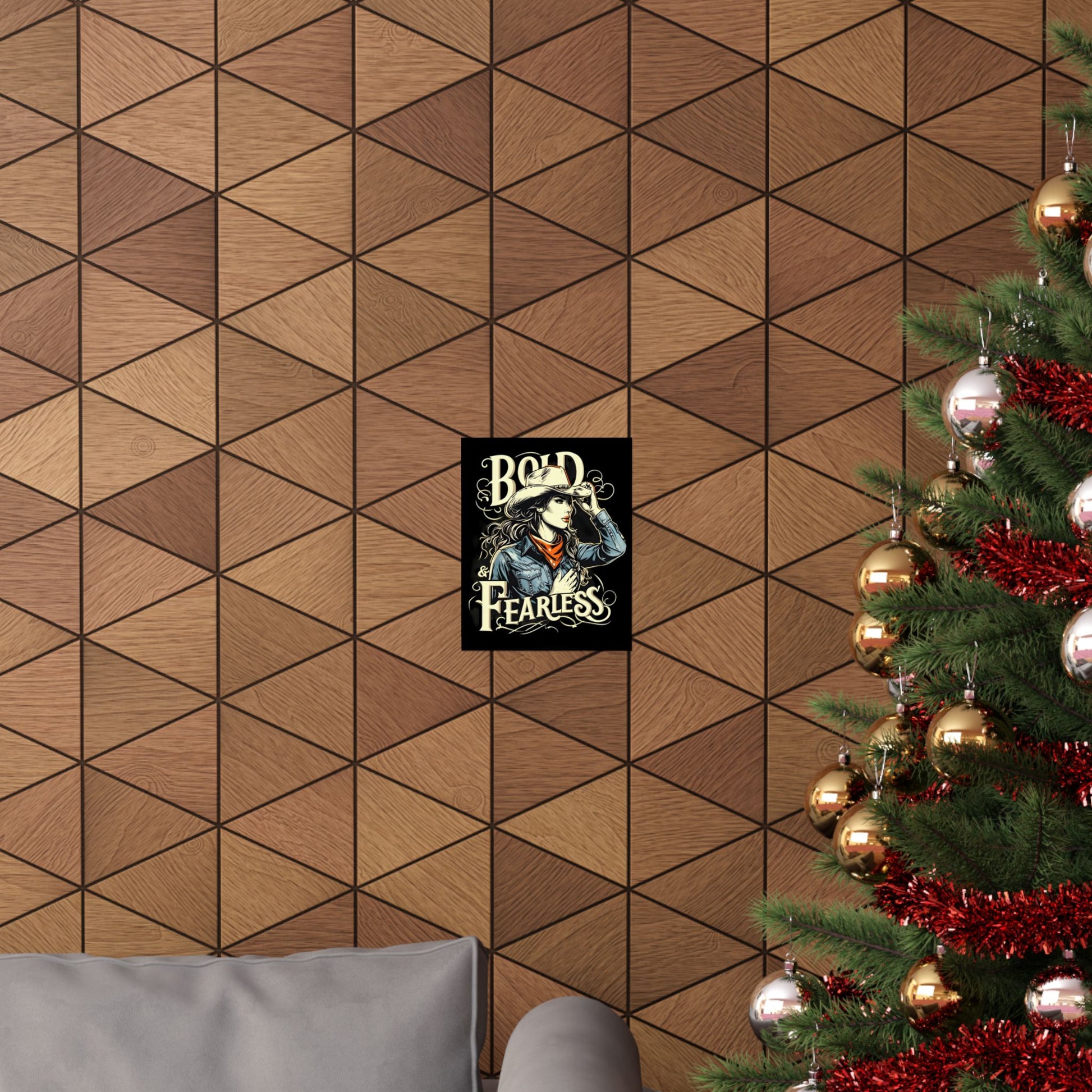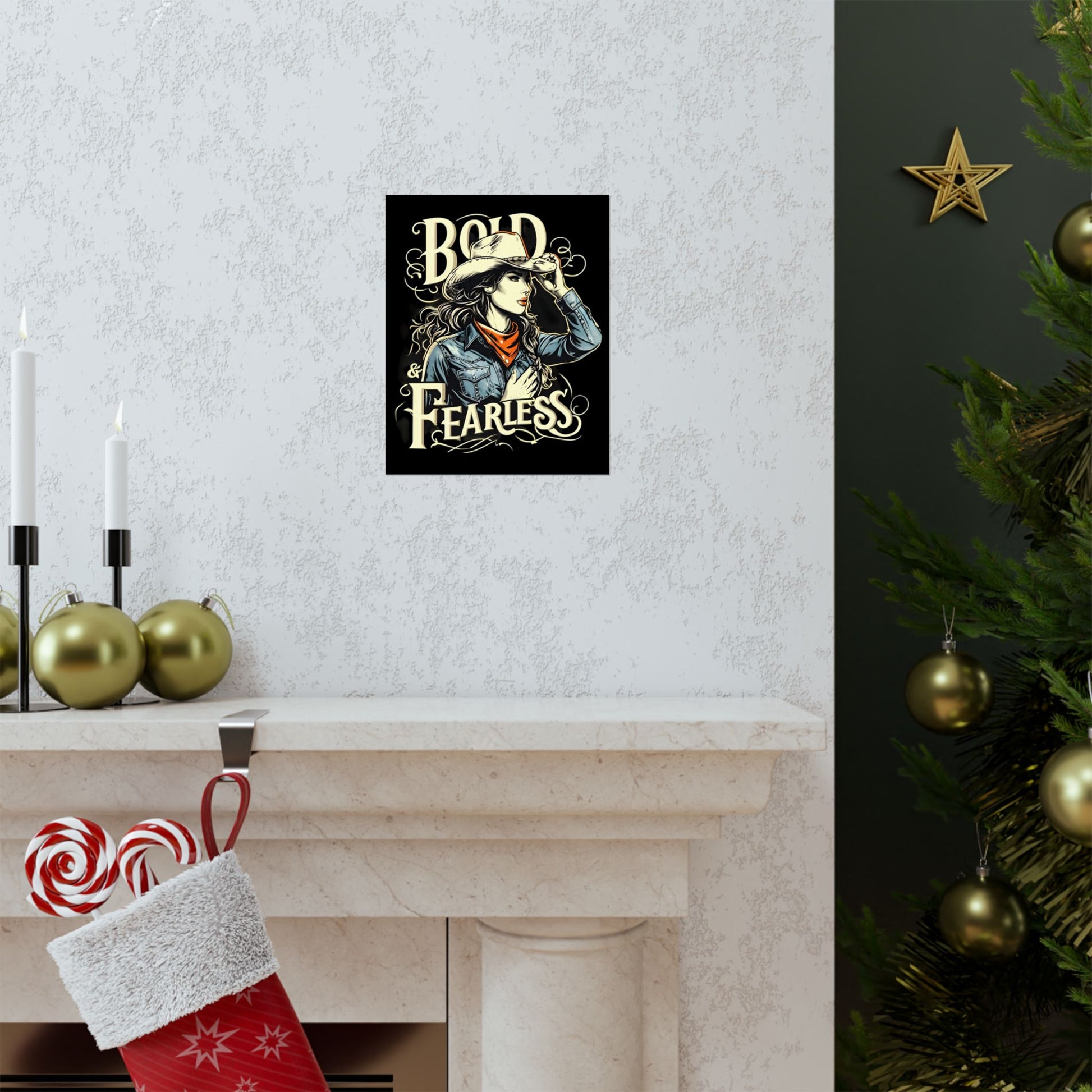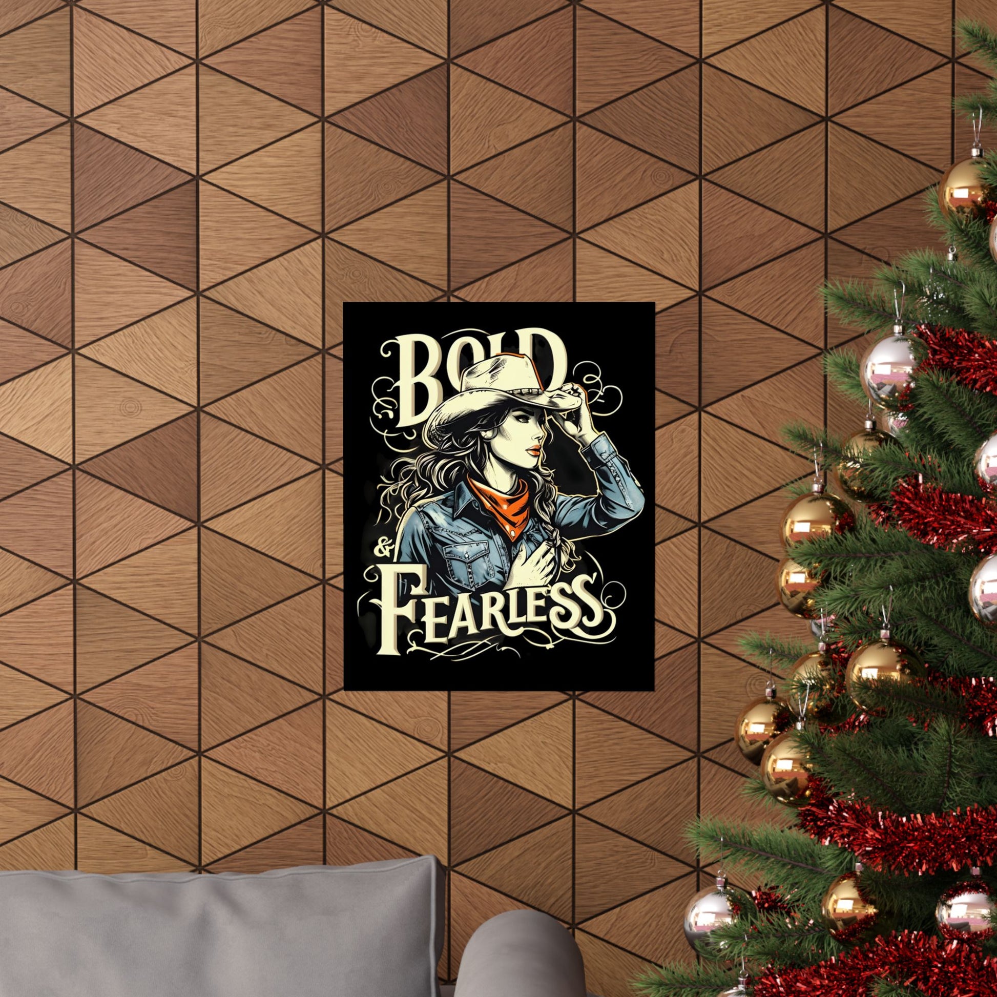 This matte vertical poster brings a bold, western spirit into indoor spaces. A daring cowgirl, hat tipped and gaze steady, anchors the design with vintage-inspired lettering that reads “Bold & Fearless.” The matte finish soaks up light for a soft, museum-quality look that emphasizes the deep blacks, warm creams, and the rust-orange bandana. Printed with archival giclée inks on museum-grade paper, the image stays vivid over time while the subtle texture of the paper gives it a handmade, collectible feel. Hang it in a living room, office, or studio to add character and a quiet confidence to the room’s vibe.