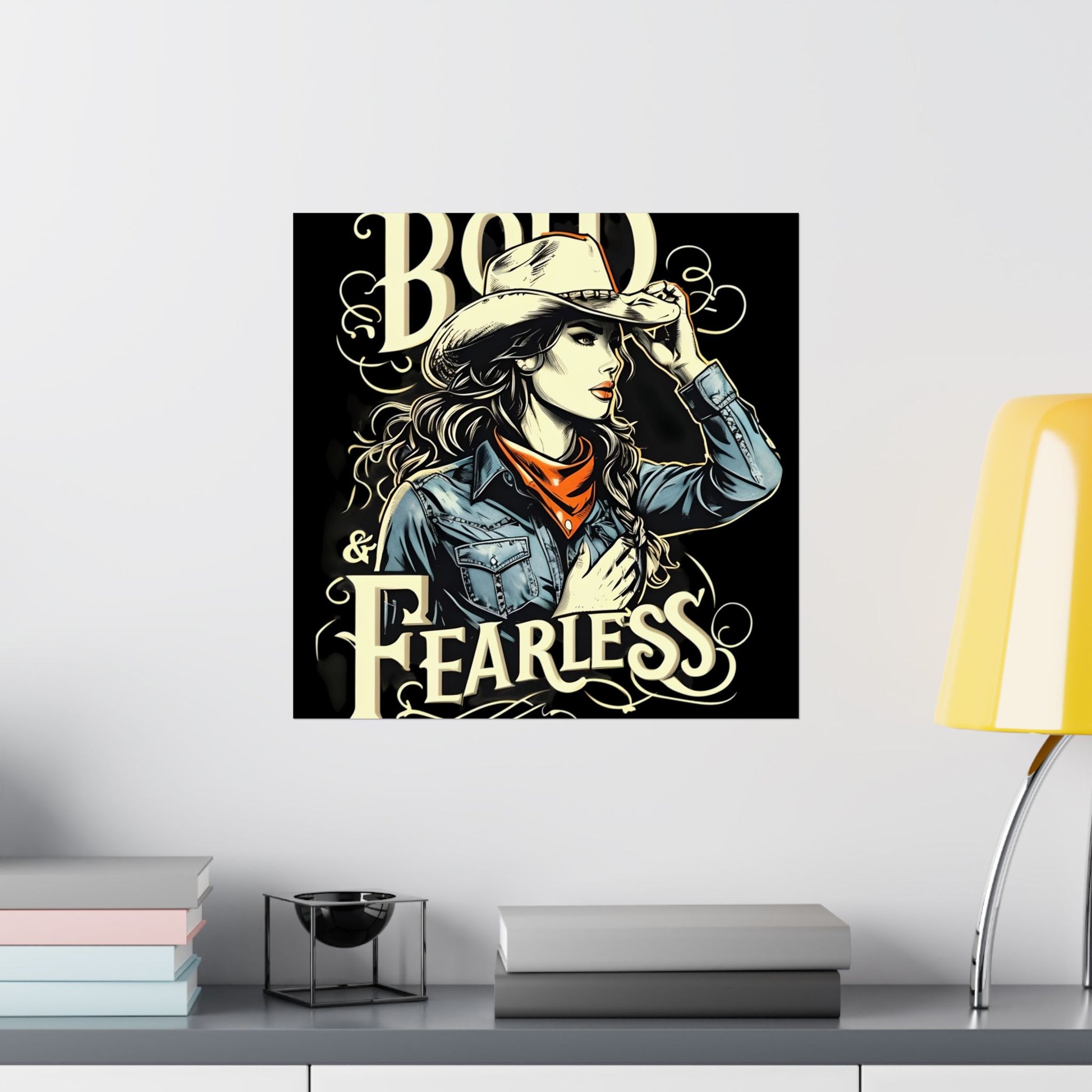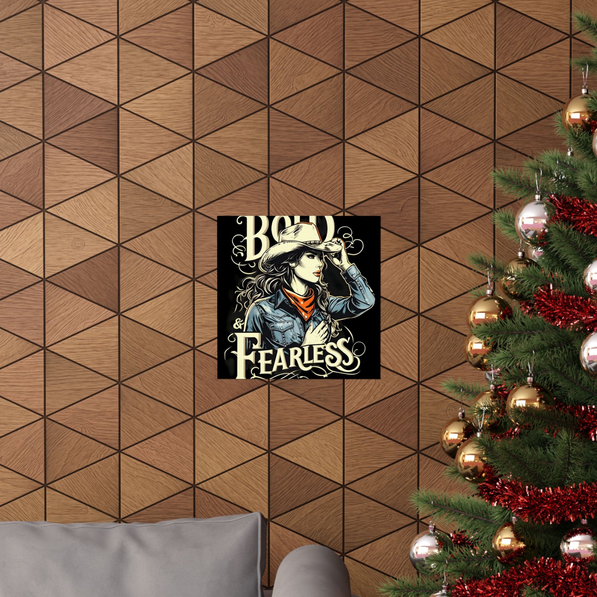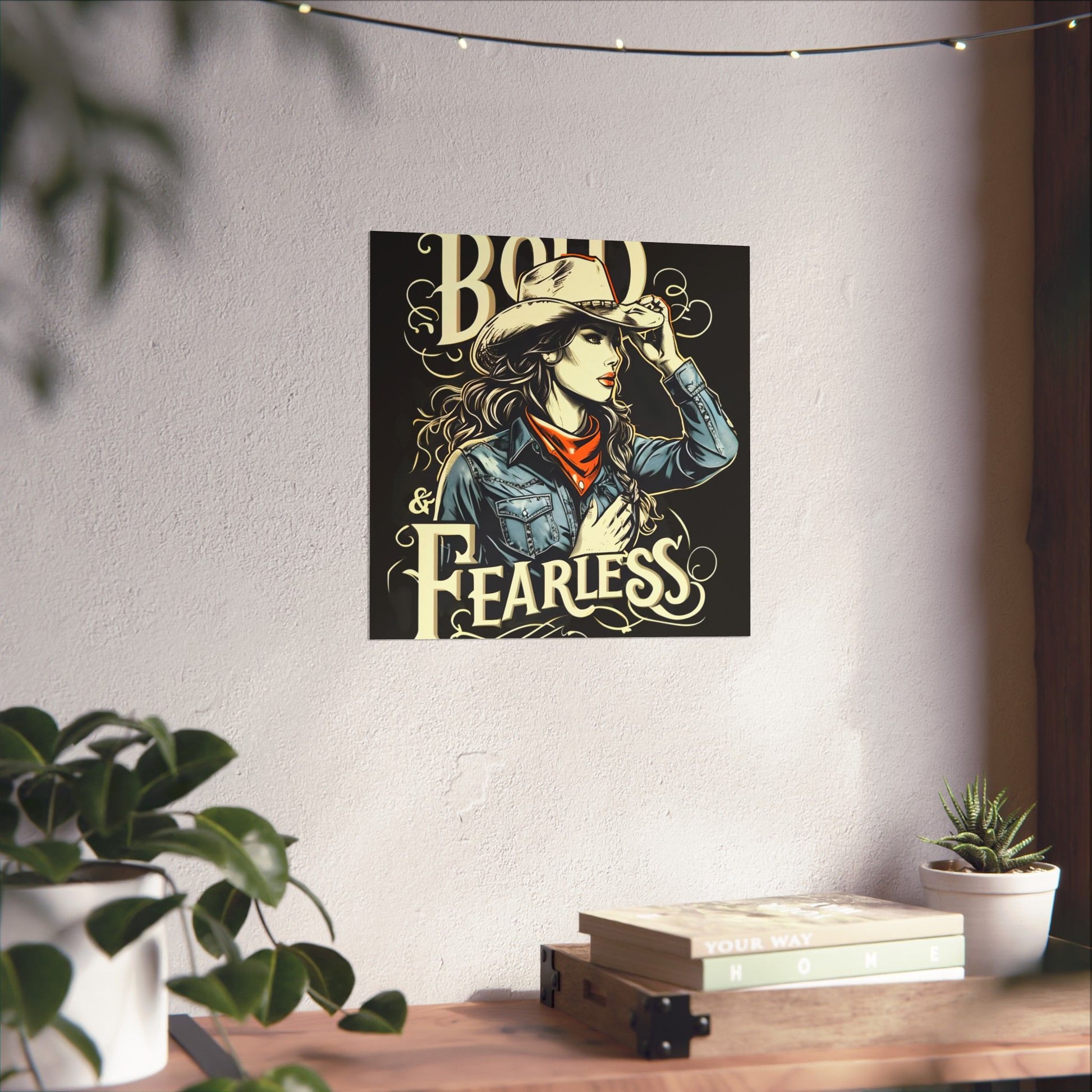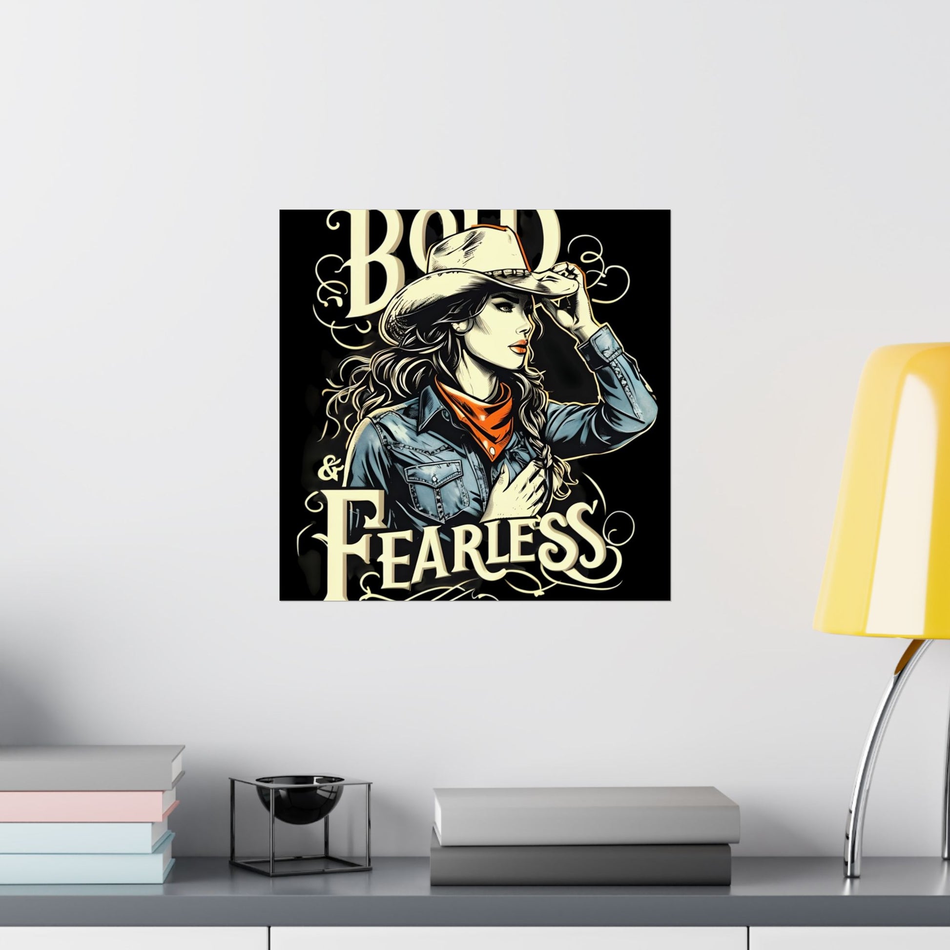 This matte vertical poster brings a bold, western spirit into indoor spaces. A daring cowgirl, hat tipped and gaze steady, anchors the design with vintage-inspired lettering that reads “Bold & Fearless.” The matte finish soaks up light for a soft, museum-quality look that emphasizes the deep blacks, warm creams, and the rust-orange bandana. Printed with archival giclée inks on museum-grade paper, the image stays vivid over time while the subtle texture of the paper gives it a handmade, collectible feel. Hang it in a living room, office, or studio to add character and a quiet confidence to the room’s vibe.
