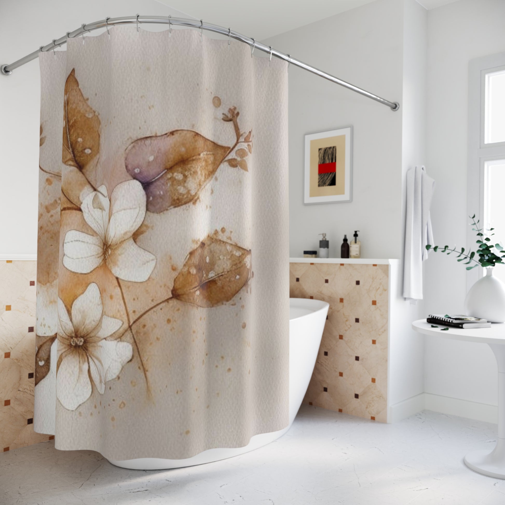 Soft, painterly florals drift across a warm, neutral background — like a watercolor caught in morning light. This shower curtain brings a calm, tactile layer to your bathroom: delicate magnolia-like blooms and faded leaves rendered in sepia and light mauve tones. It hangs with subtle movement, gently filtering bathroom light while protecting your space from splashes. Place it in a cozy powder room or a spa-inspired master bath to add quiet, botanical charm and a handcrafted, artful mood.