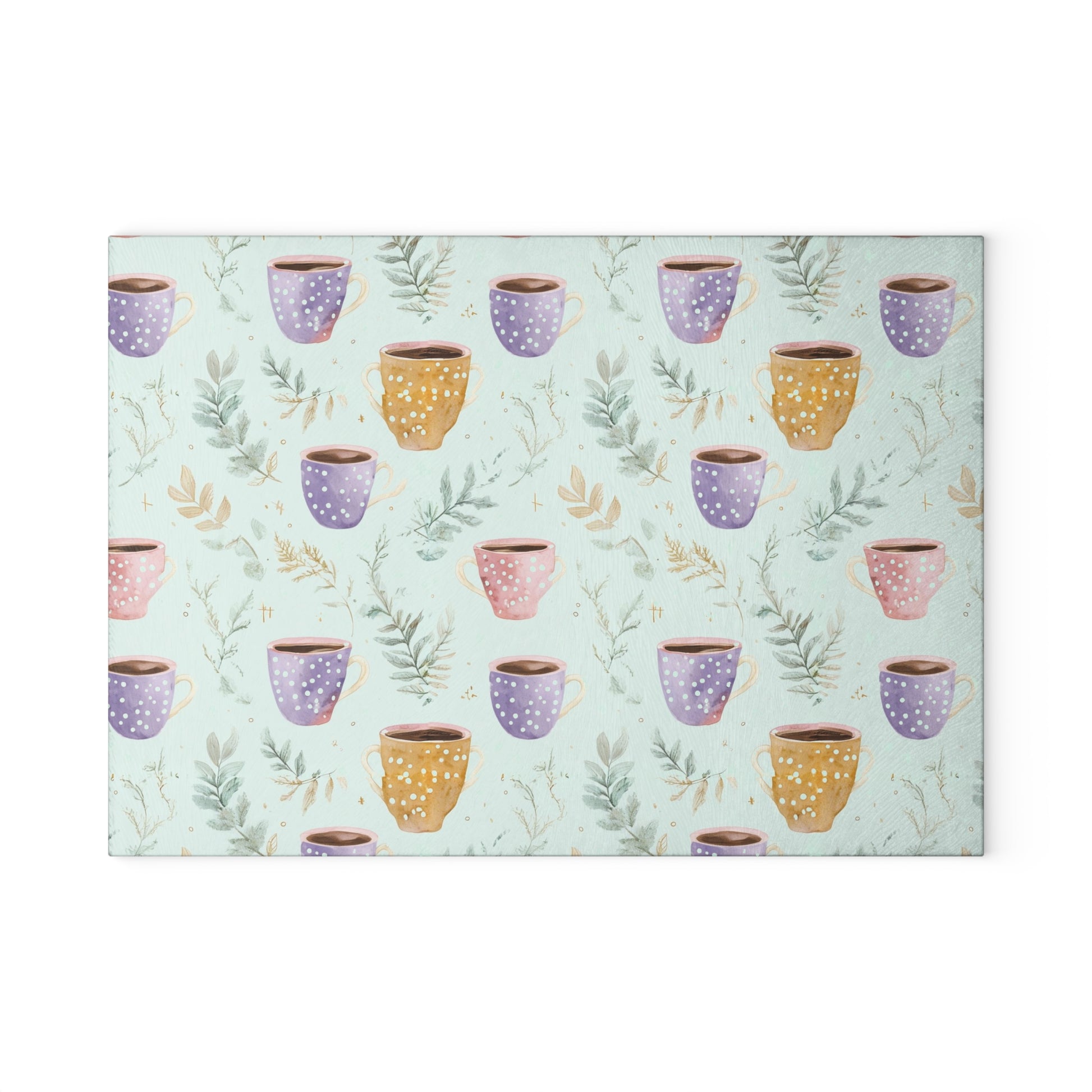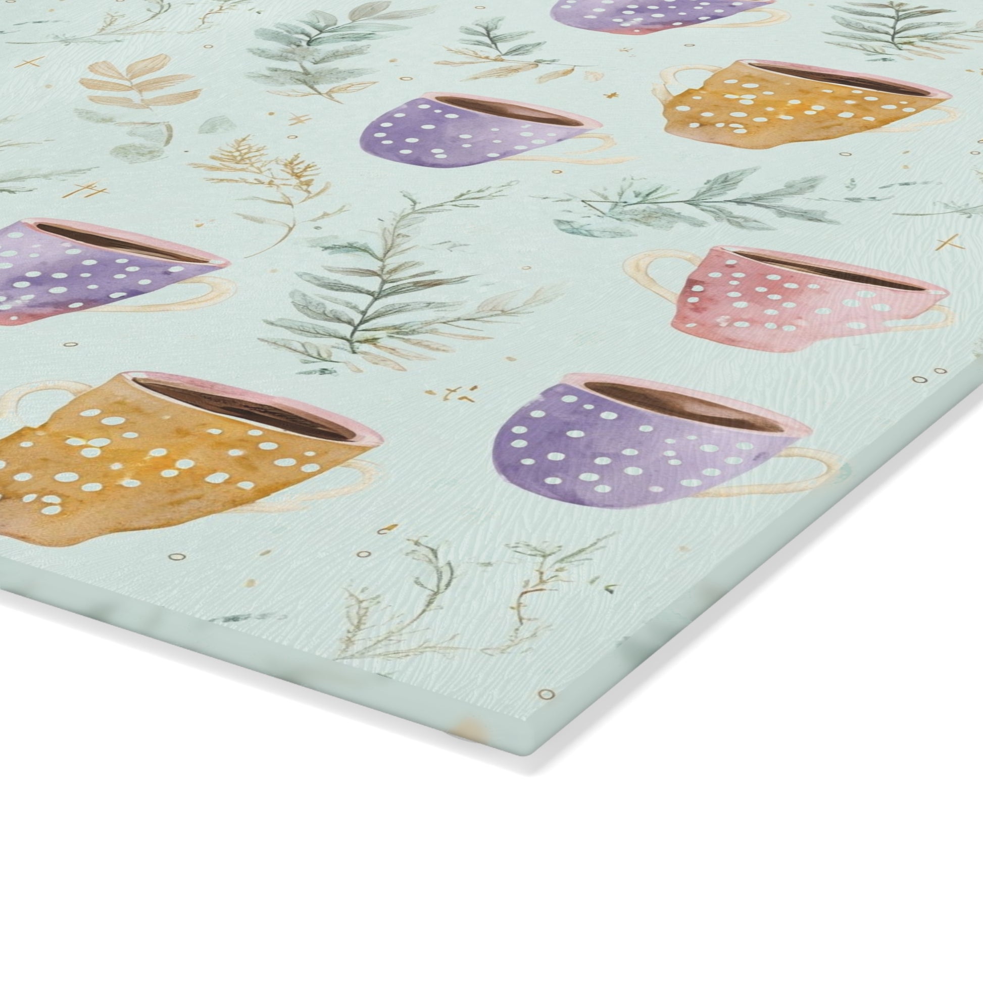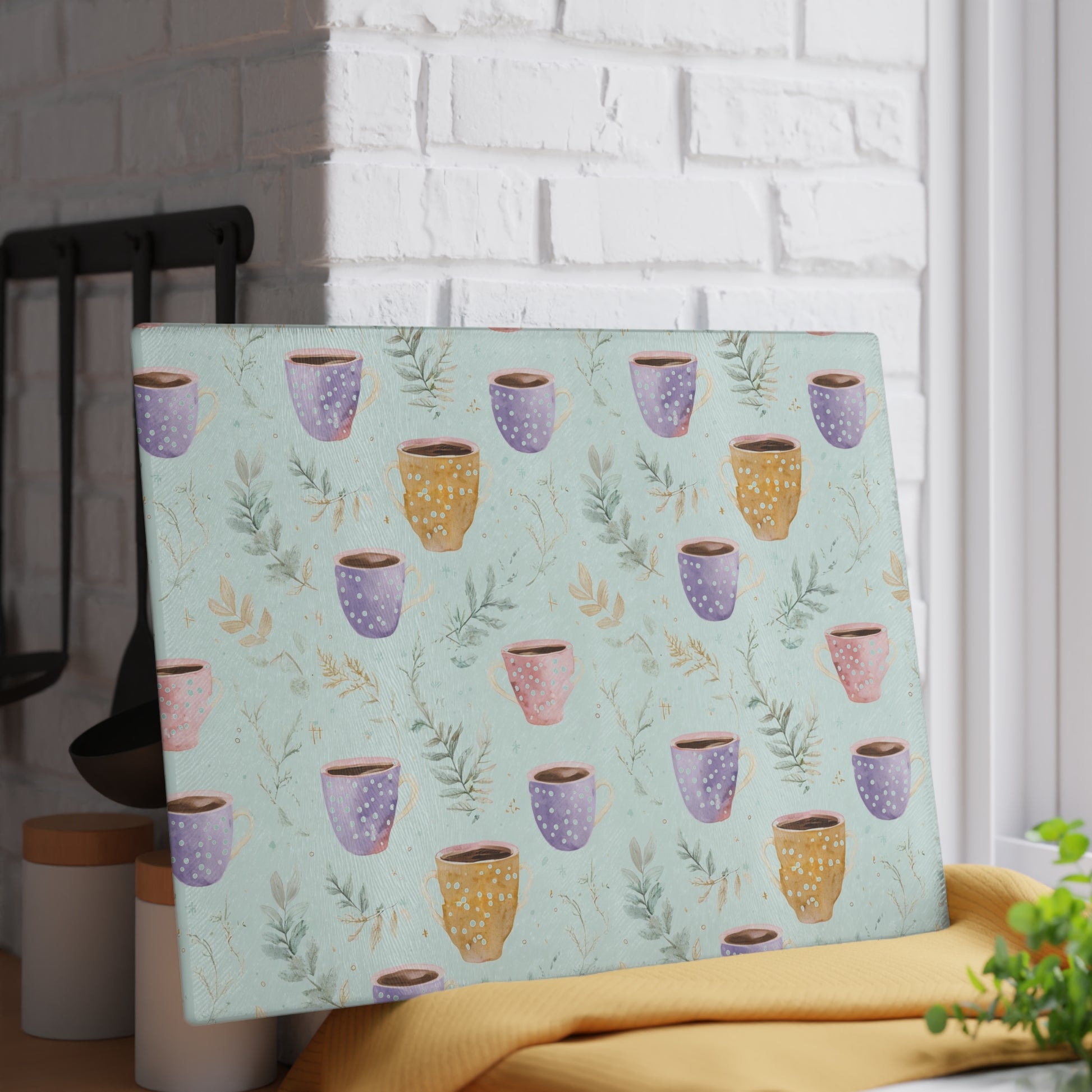 Bring a quiet, cozy moment into your kitchen with this tempered glass cutting board. Soft watercolor mugs and delicate sprigs float across a pale mint background, turning a practical prep surface into a little scene of calm. The textured, tempered glass resists stains and won’t warp or hold odors, so it stays fresh where you chop, slice, and serve. Small rubber feet keep it steady on countertops. It’s the kind of piece that makes weekday breakfasts feel gentler and invites a slower, brighter start to mornings or relaxed tea breaks with friends.