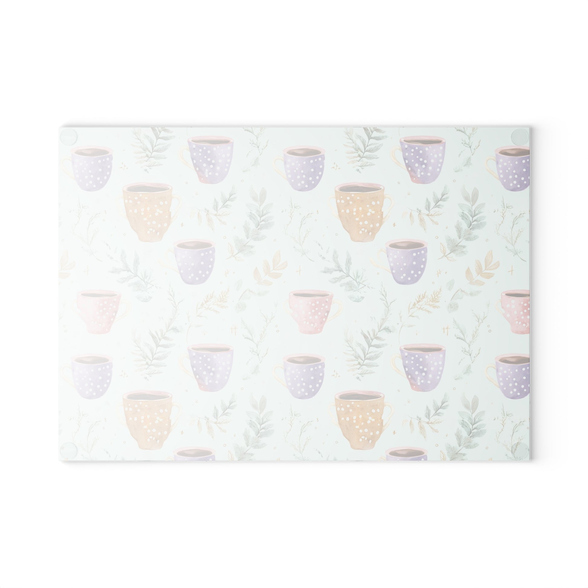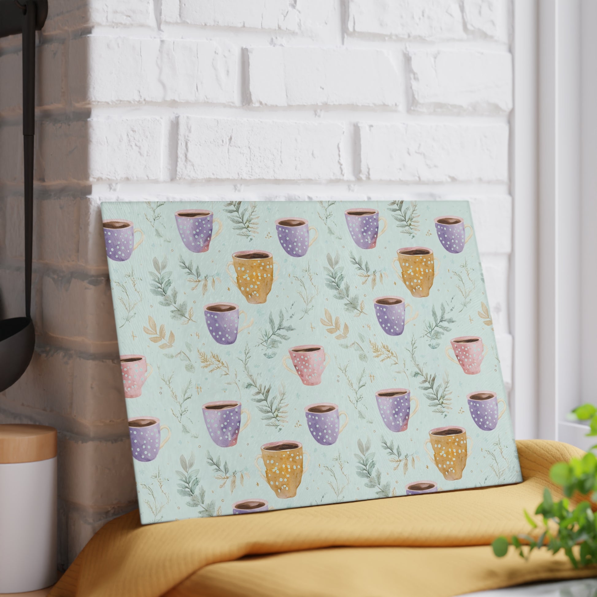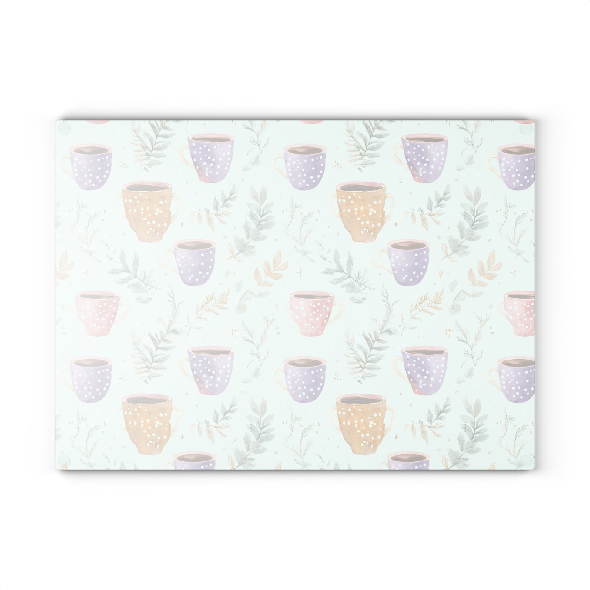 Bring a quiet, cozy moment into your kitchen with this tempered glass cutting board. Soft watercolor mugs and delicate sprigs float across a pale mint background, turning a practical prep surface into a little scene of calm. The textured, tempered glass resists stains and won’t warp or hold odors, so it stays fresh where you chop, slice, and serve. Small rubber feet keep it steady on countertops. It’s the kind of piece that makes weekday breakfasts feel gentler and invites a slower, brighter start to mornings or relaxed tea breaks with friends.