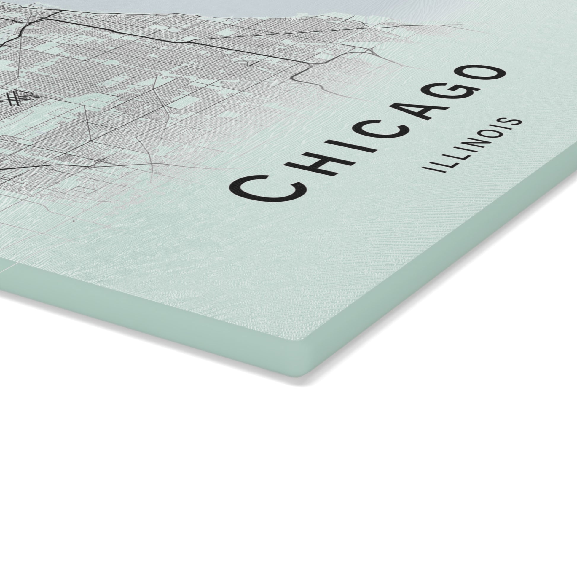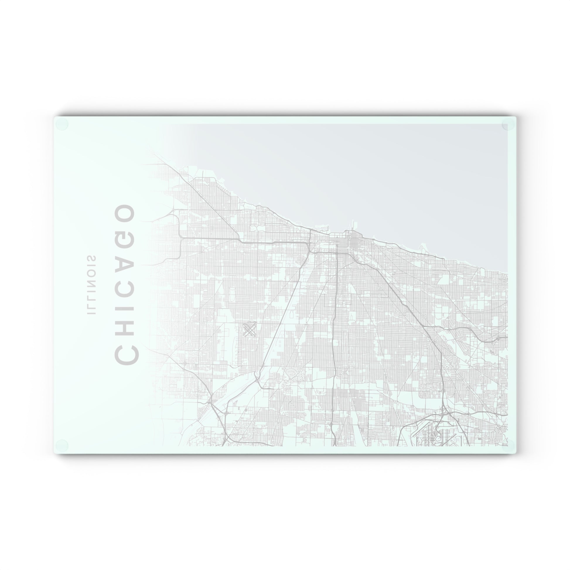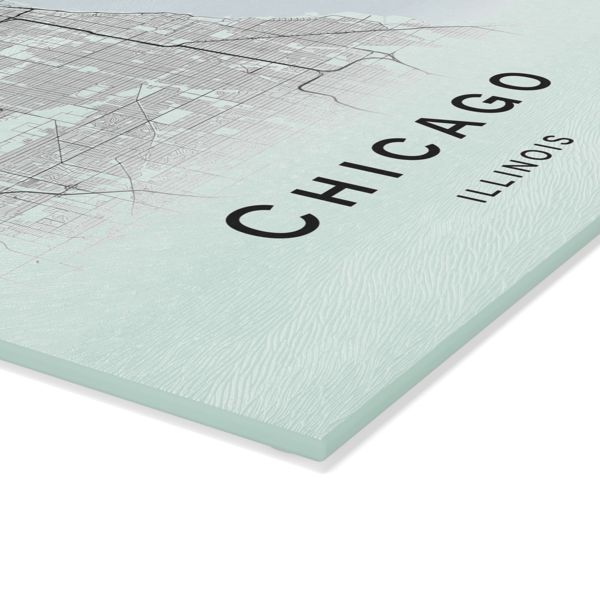 This tempered glass cutting board pairs city pride with practical kitchen use. A soft mint backdrop frames a delicate, detailed map of Chicago, printed with durable, scratch-resistant inks that keep the artwork vivid through everyday prep. The textured tempered glass surface is sanitary and easy to wipe clean, while four rubber feet hold the board steady on counters. Available in two sizes to fit cozy kitchens or larger countertops, it brings a modern, map-inspired accent to weeknight dinners, brunches, or hosting small get-togethers. Hand wash recommended to preserve the finish and keep the colors crisp.
