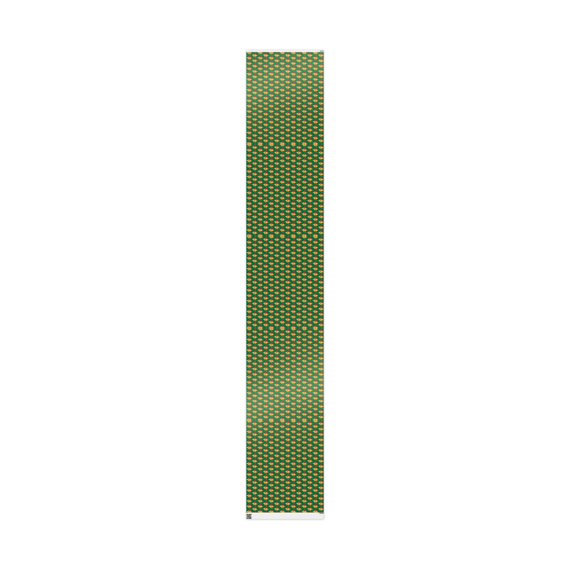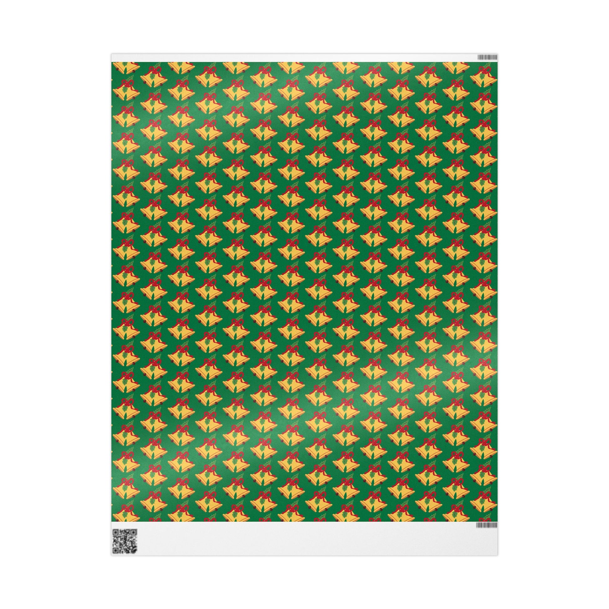 Celebrate seasonal rituals with this joyful holiday wrapping paper. The rich green background and repeating golden bell motif with holly and red ribbon create a warm, vintage-inspired look that elevates every present — from small tokens to long, narrow packages. Printed on 90 gsm fine art paper in high-definition, you can choose between a glossy sheen that makes colors pop or a soft matte for a more refined, tactile finish. The long rolls are designed to handle multiple gifts and special installations, and the single-sided print keeps the reverse clean for easy handling. Small white trim with a barcode/QR code appears at the edges as part of the production process.