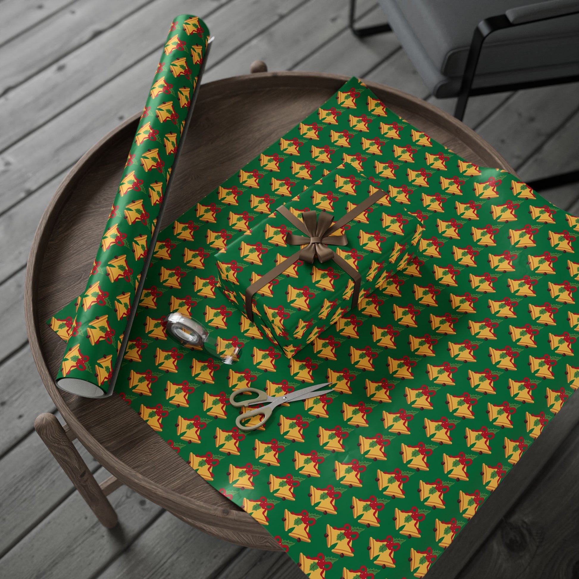 Christmas Bells Wrapping Paper Roll — Green Holly Holiday Gift Wrap