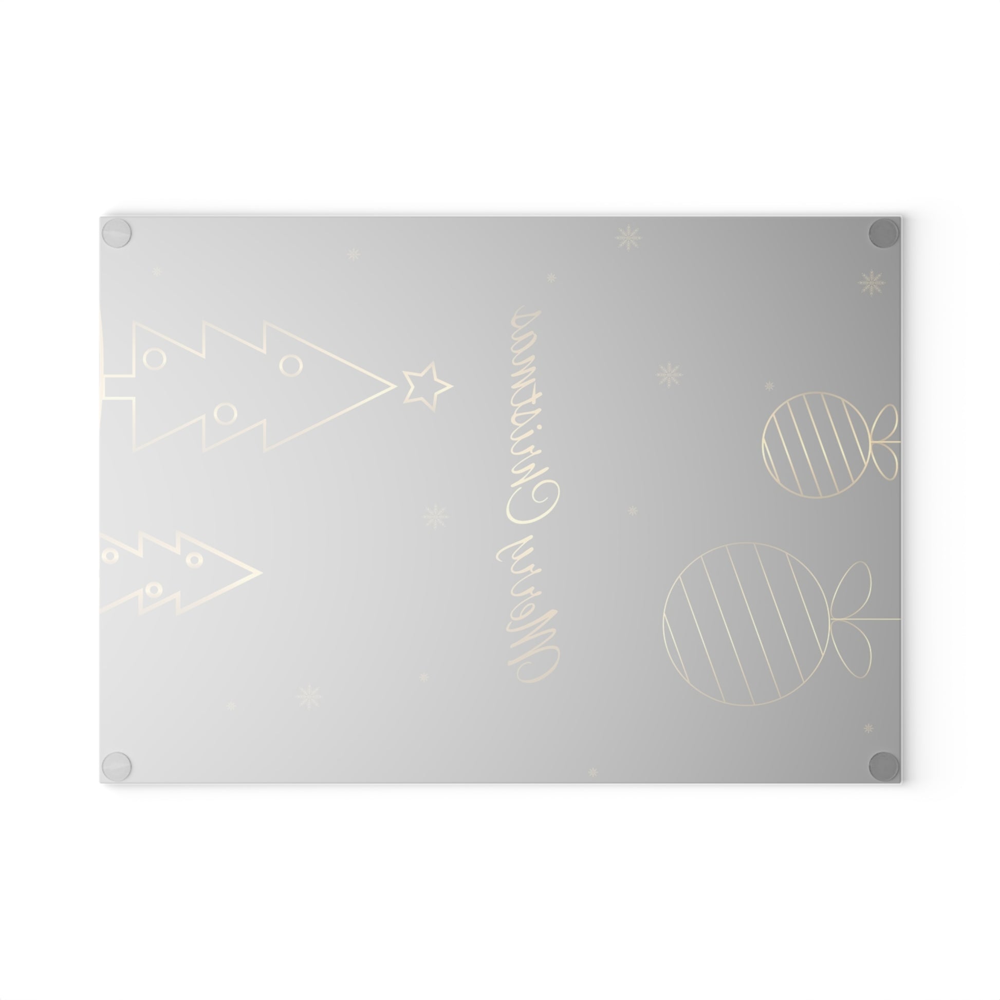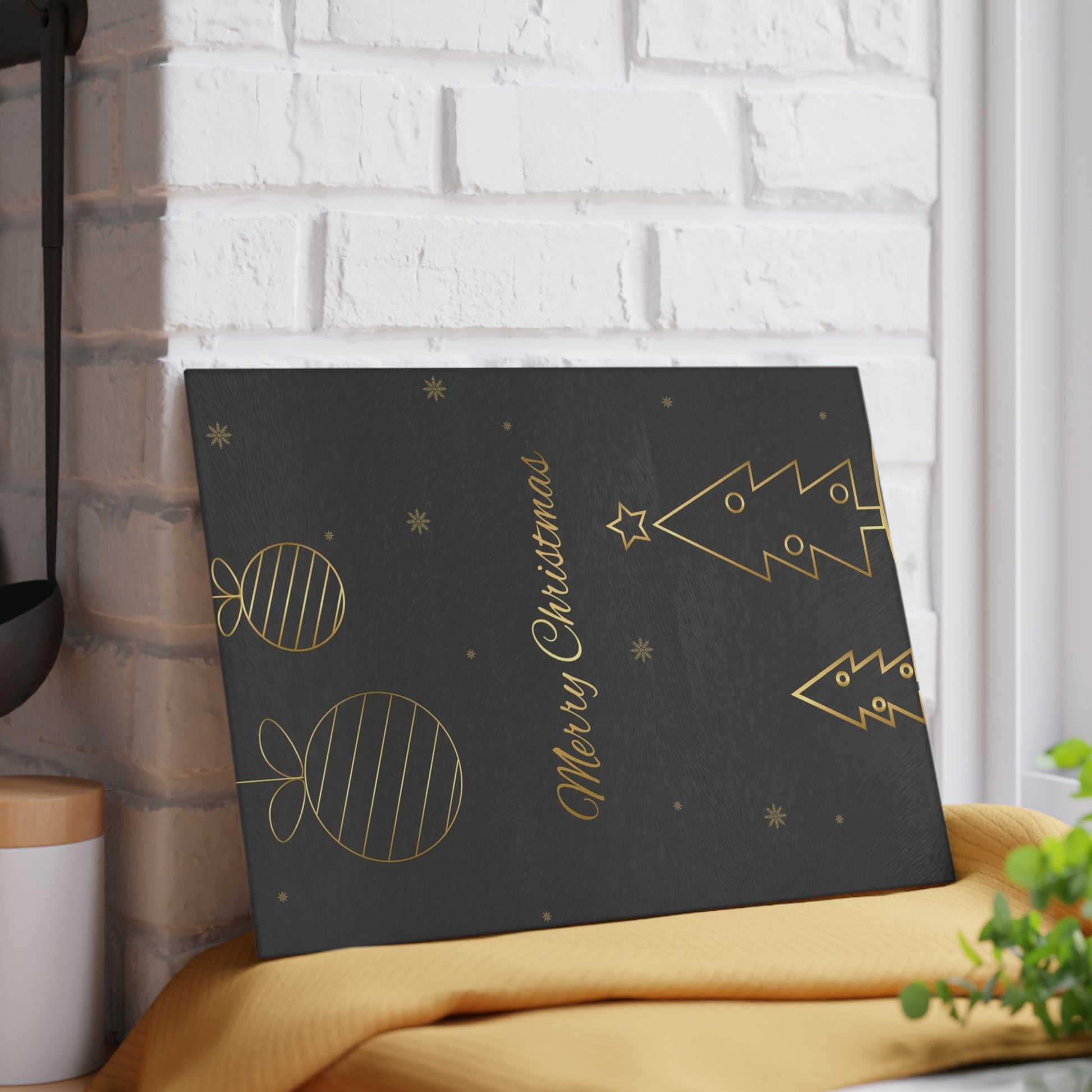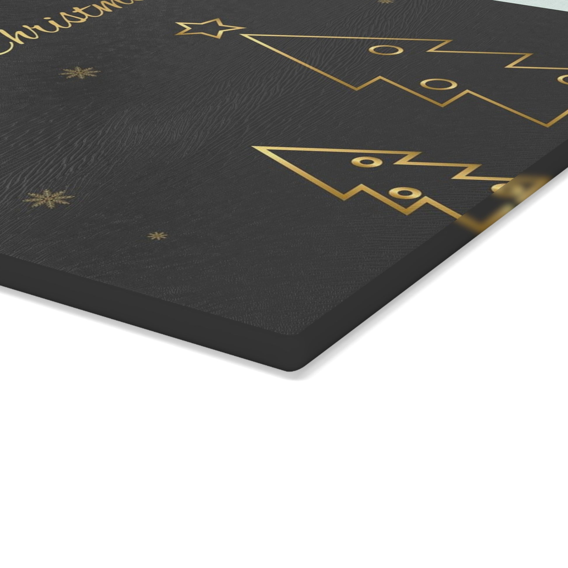 A sleek tempered glass cutting board that brings quiet holiday charm to your kitchen. The matte-black surface is decorated with thin gold line illustrations of Christmas trees, ornaments, and scattered stars, with a subtle “Merry Christmas” script running down the center. It feels cool and smooth under your hands, resists stains and odors, and the textured finish gives gentle grip for chopping. Four rubber feet keep the board steady on counters while you prep, and the durable printing is made to withstand regular use without scratching away. Available in two sizes to suit a small prep station or a fuller work surface — and recommended for hand washing to keep the finish vivid year after year. This piece reads modern and minimal, adding seasonal warmth without taking over the room.
