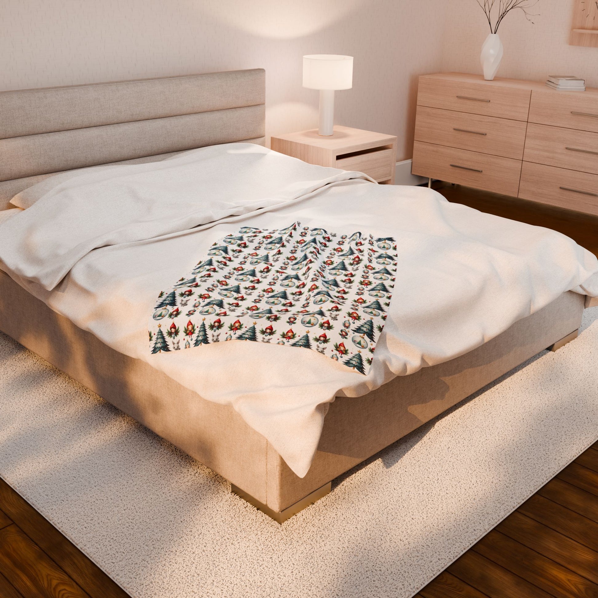 Wrap yourself in a cozy, whimsical scene of tiny gnomes and snowy pines. This velveteen plush blanket brings soft, medium-weight warmth and a playful, woodland holiday vibe to quiet evenings on the couch or a chilly morning by the window. The print is vibrant on one side against a clean, light background, making the pattern pop while the reverse stays smooth and soft against skin. It pairs with relaxed, hygge moments—reading by lamplight, movie nights, or layering over a favorite armchair to add instant seasonal charm.