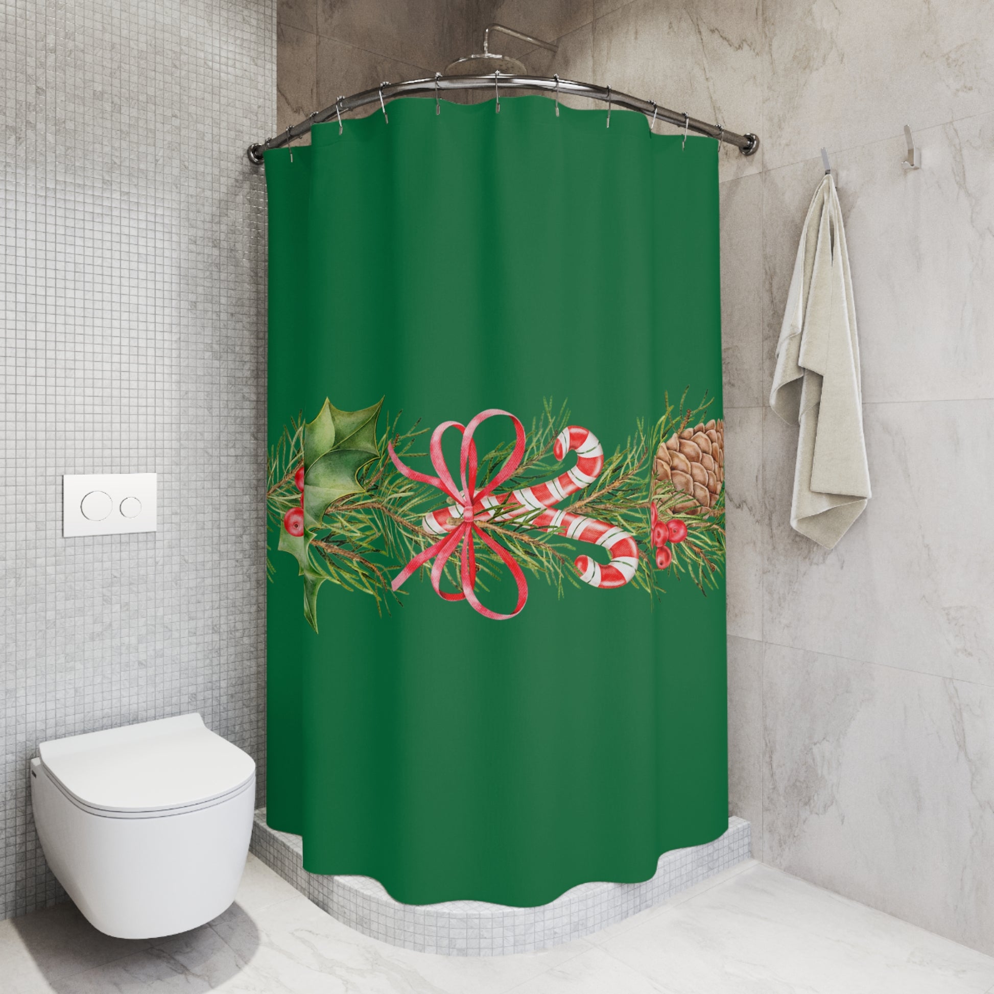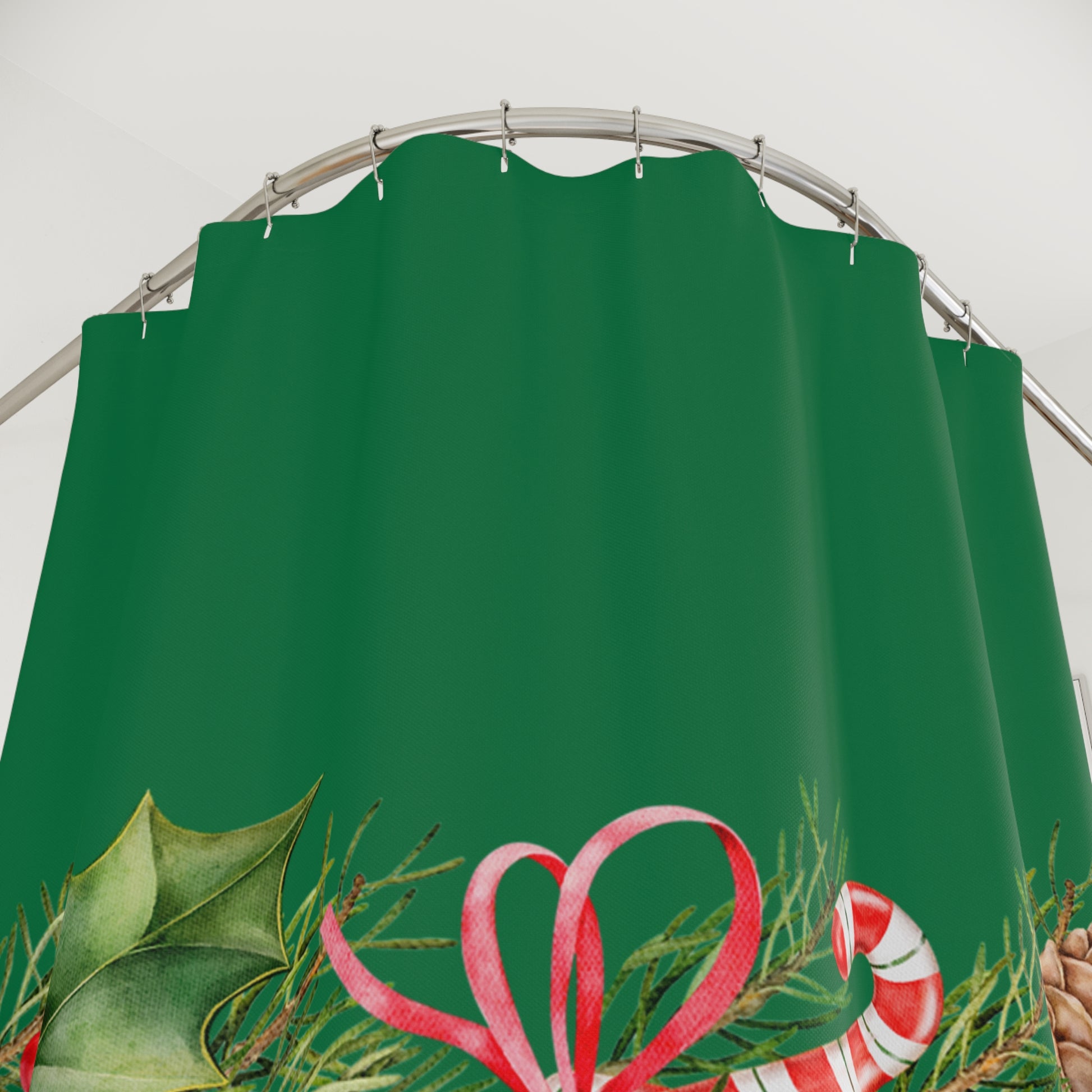 Christmas Green Shower Curtain — Holiday Pine, Candy Cane & Holly Garland Bathroom Decor