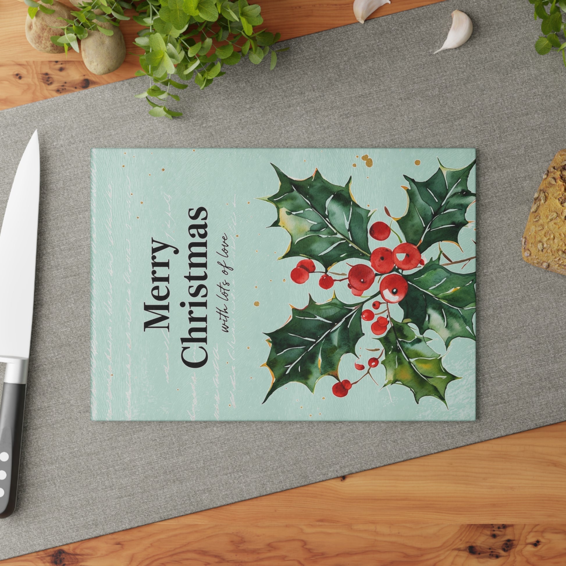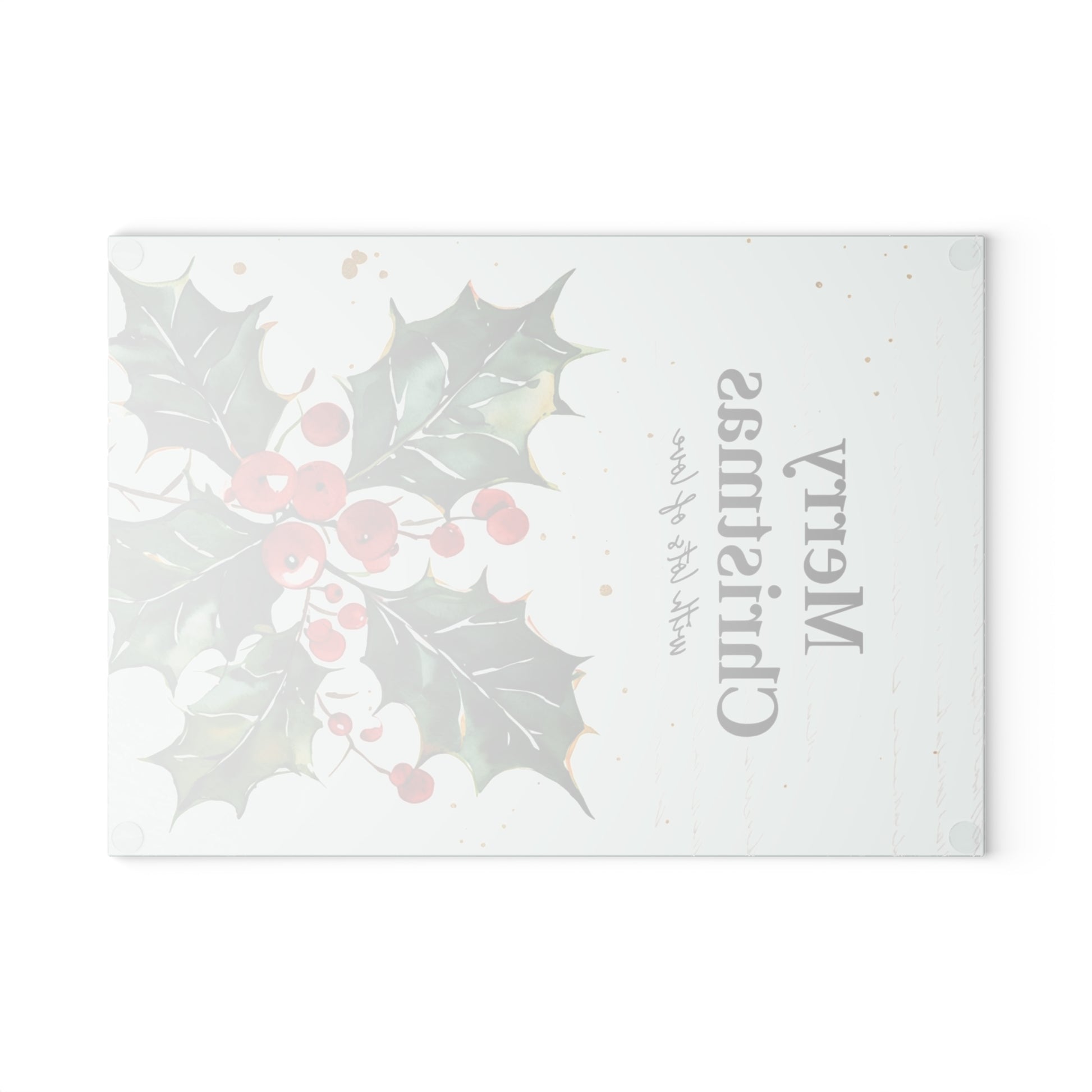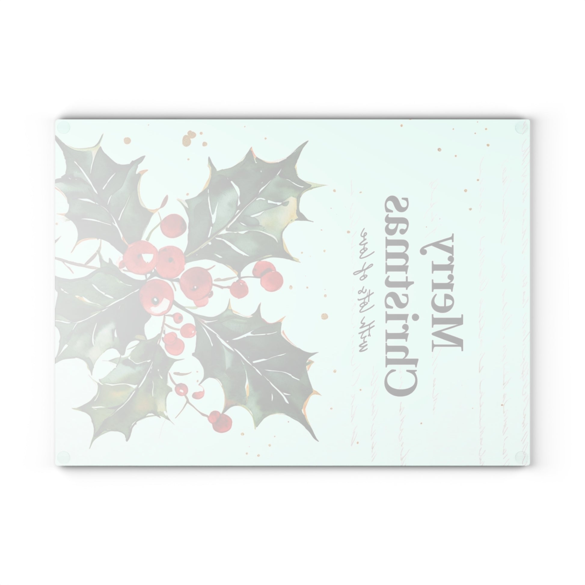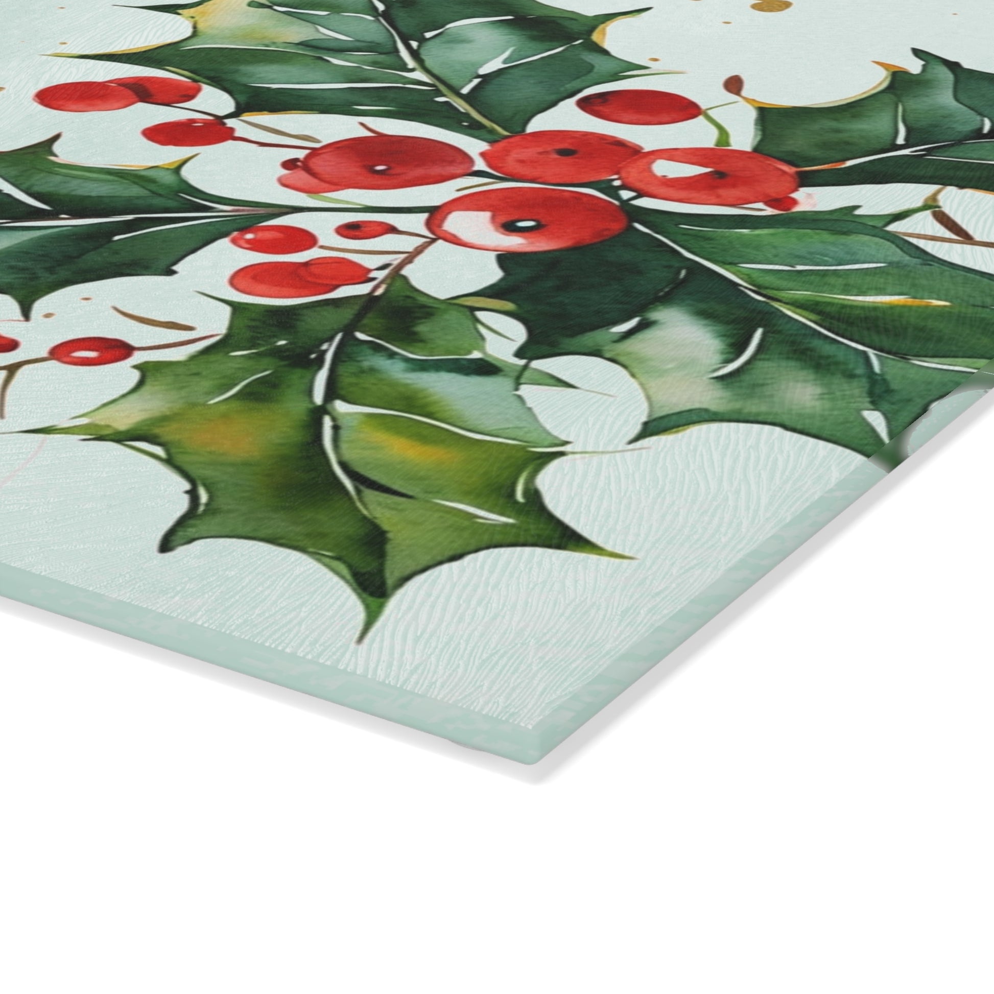 A festive tempered glass cutting board that brings holiday cheer to your kitchen. Hand-painted holly sprigs and bright red berries stand out against a soft mint background, while “Merry Christmas” lettering adds a warm, seasonal touch. The tempered glass surface resists stains and odors, and the printed art is made with a durable technique that won’t wear away with normal chopping. Four rubber feet keep the board steady on counters, and the textured finish helps prevent slipping while prepping. Available in two sizes to fit cozy kitchens or busy holiday meal prep sessions. Hand wash recommended to preserve the vivid colors and finish.