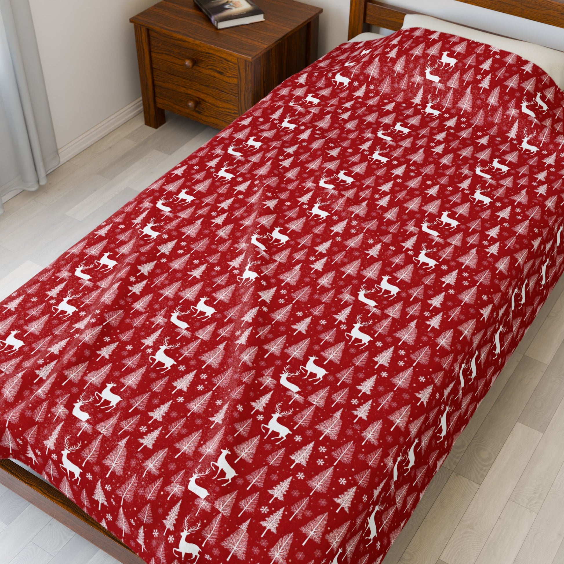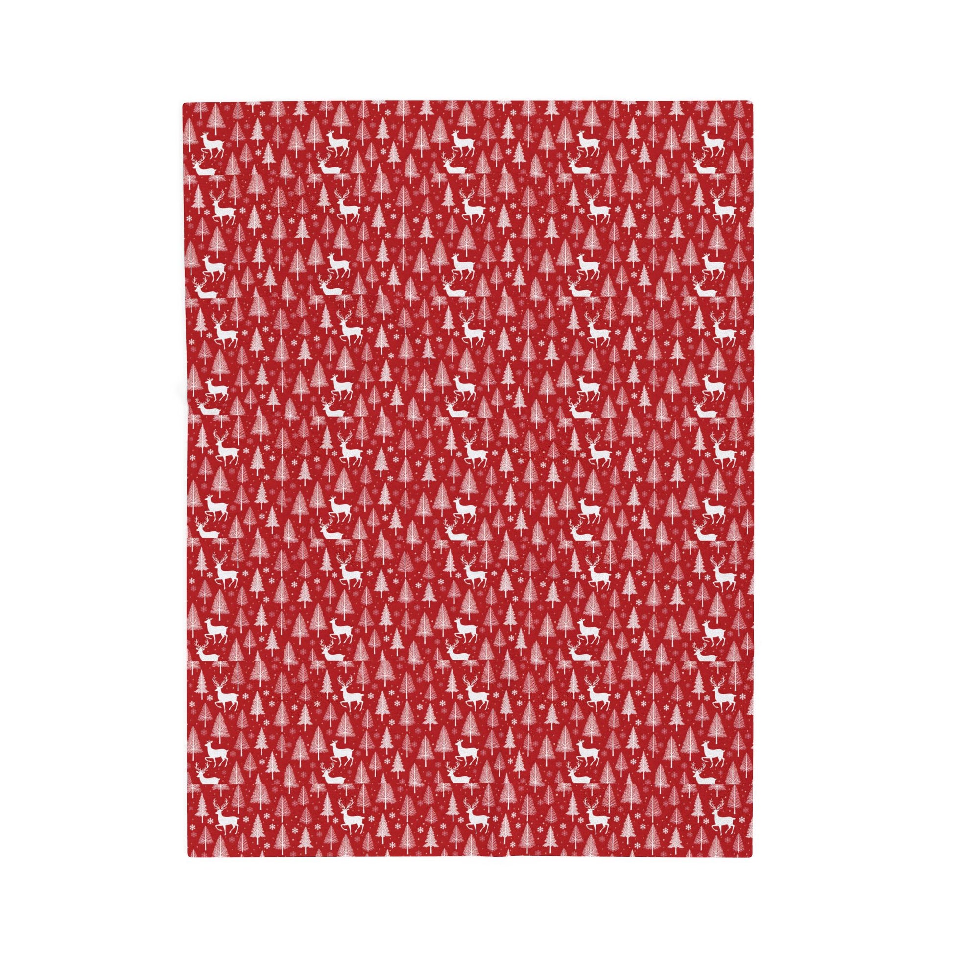 A luxuriously soft velveteen blanket woven with a cozy holiday motif. Deep crimson fields of tiny evergreen trees and playful reindeer create a warm, tucked-in feeling that invites you to curl up with a book, a mug, or someone you love. The plush face holds bright, detailed color while the reverse side stays soft and neutral — great for layering on a sofa or bringing extra warmth to a chilly bedroom. Durable double-needle stitching keeps the edges neat through repeated use and washes. Lightweight enough to drape, yet substantial enough to add real warmth on cold nights, this blanket blends festive charm with everyday comfort.