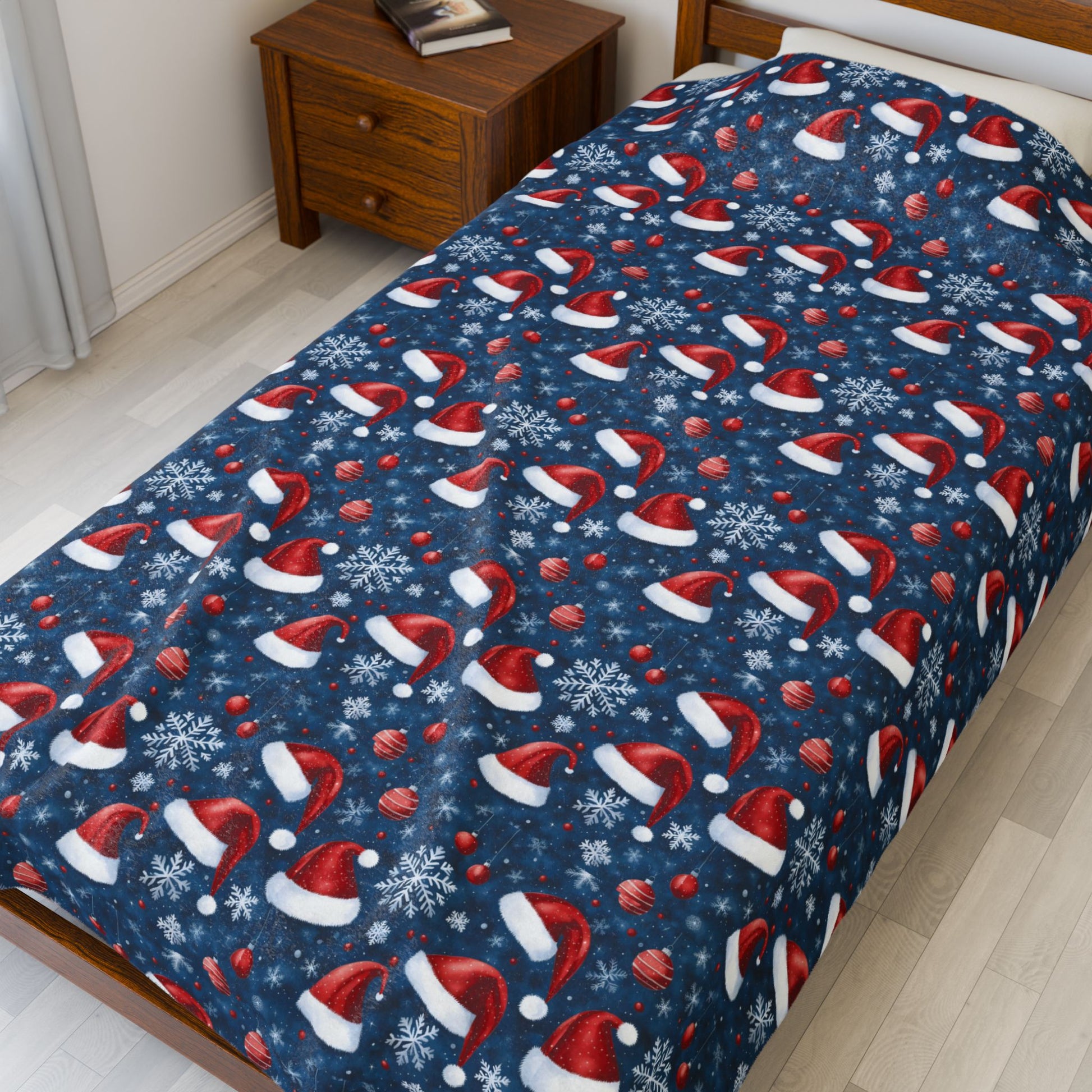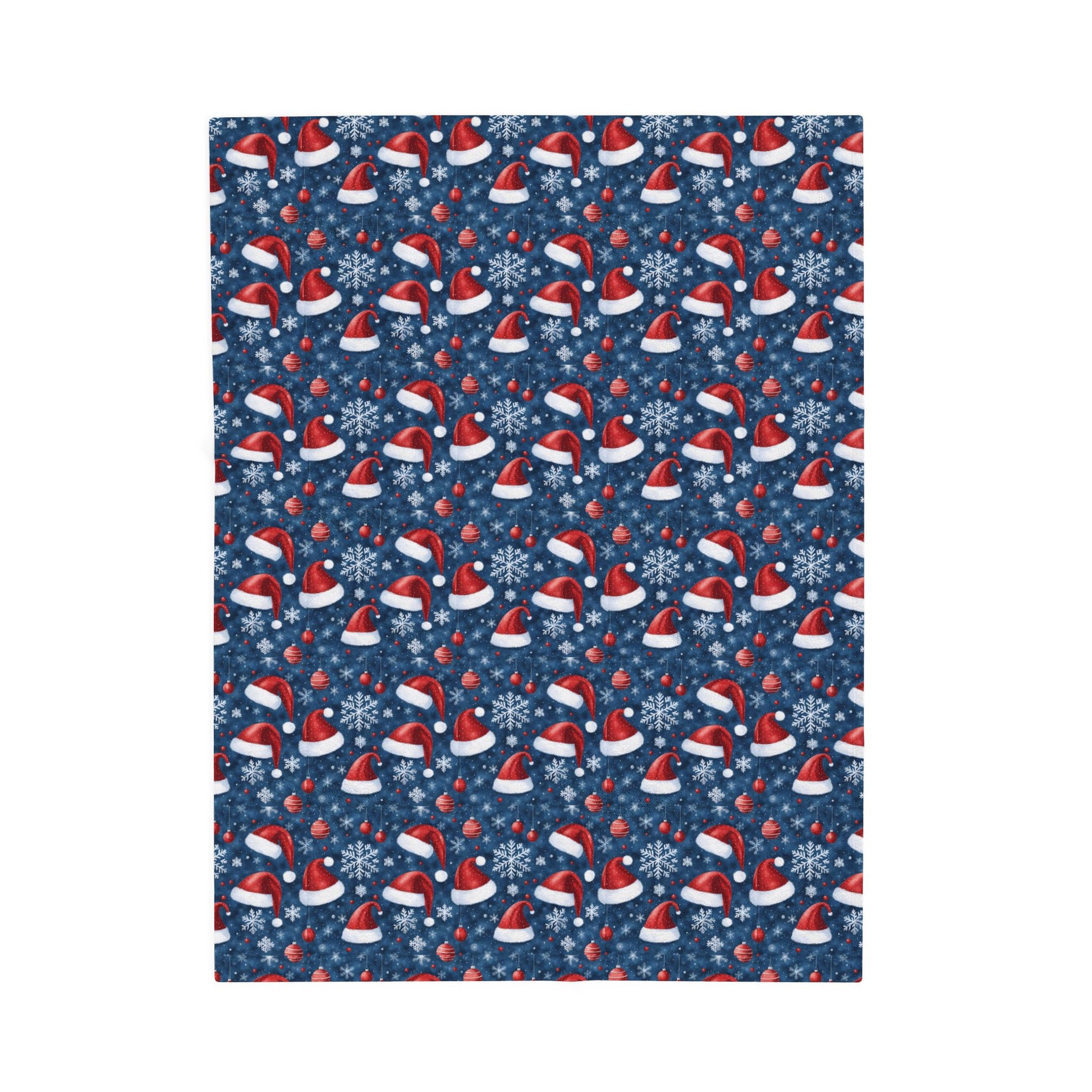 Wrap yourself in a velvety holiday embrace. This plush blanket brings a cozy, nostalgic warmth to quiet evenings by the tree or movie nights on the couch. The deep navy background sets off a festive scatter of Santa hats, snowflakes, and tiny holly—familiar symbols that make chilly nights feel like a return to childhood wonder. Soft against the skin and pleasantly substantial, it’s the kind of blanket you reach for when you want comfort that looks as joyful as it feels. Use it to layer over a sofa, drape across a reading chair, or tuck around shoulders while sipping something steaming—its cheerful pattern keeps the season glowing without shouting for attention.