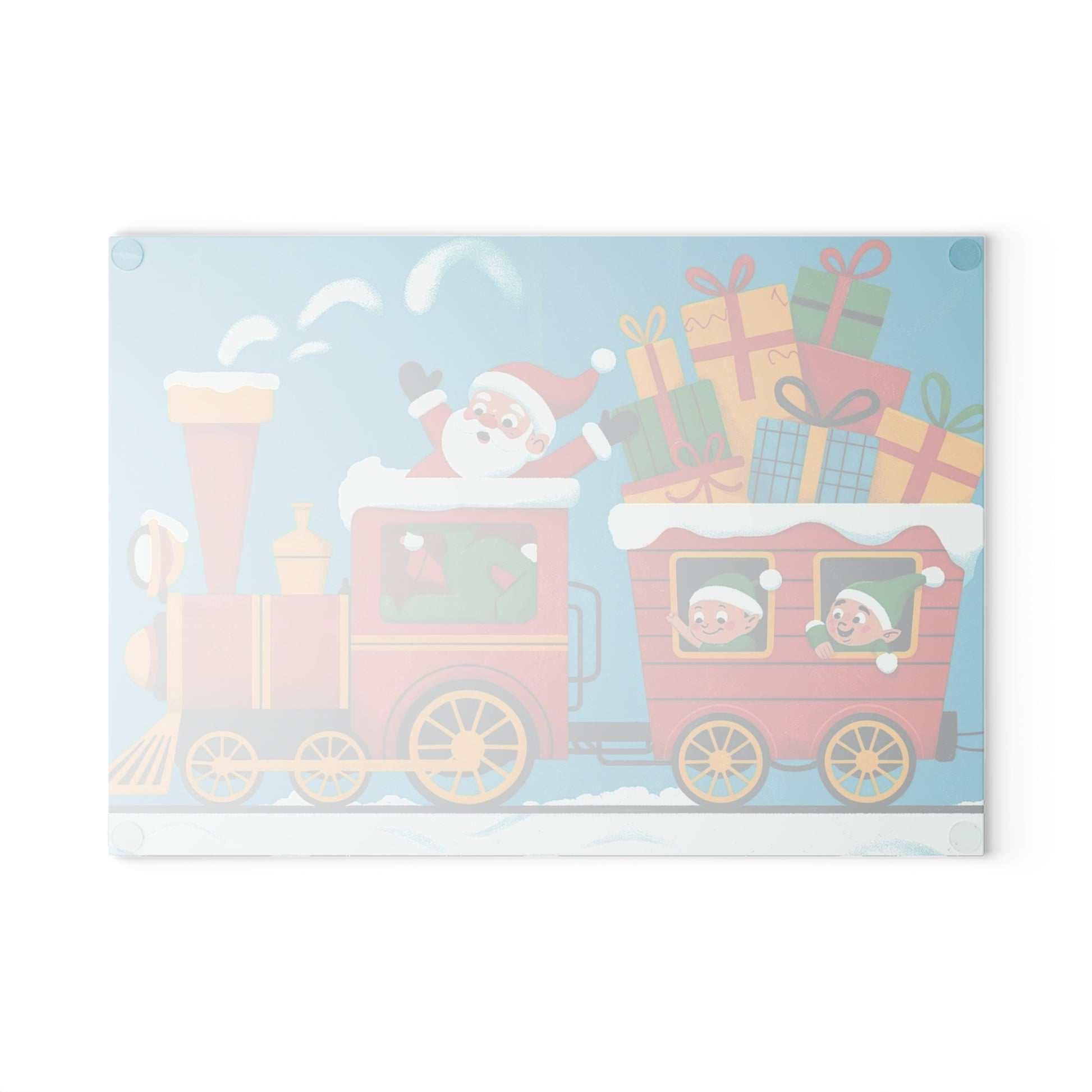 Bring a playful, festive note to holiday prep with this tempered glass cutting board. A bright holiday train—Santa waving from the engine and elves peeking from a gift-filled car—rolls across a cheerful blue background. The textured, tempered glass surface resists stains and won’t harbor odors like plastic, while the durable printing stays vivid even with regular use. Four rubber feet hold the board steady on counters so you can chop, slice, or use it as a serving surface with confidence. Available in two sizes to suit cramped kitchen corners or larger holiday spreads. Hand wash recommended to keep colors crisp and the finish pristine.