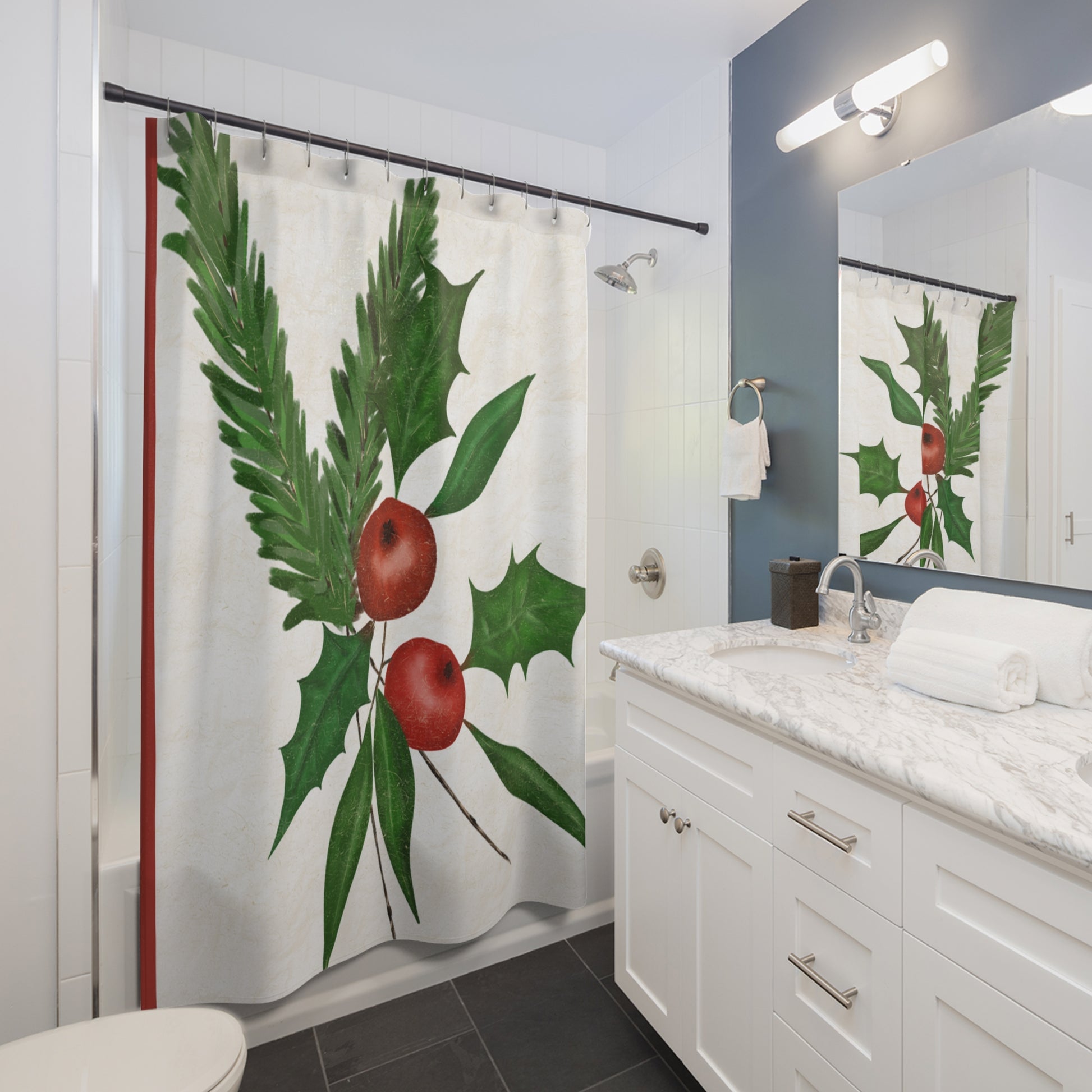 Christmas Shower Curtain with Holly and Berries, Festive Bathroom Decor for Holiday Hosting, Winter Home Decoration, Seasonal Gift Idea