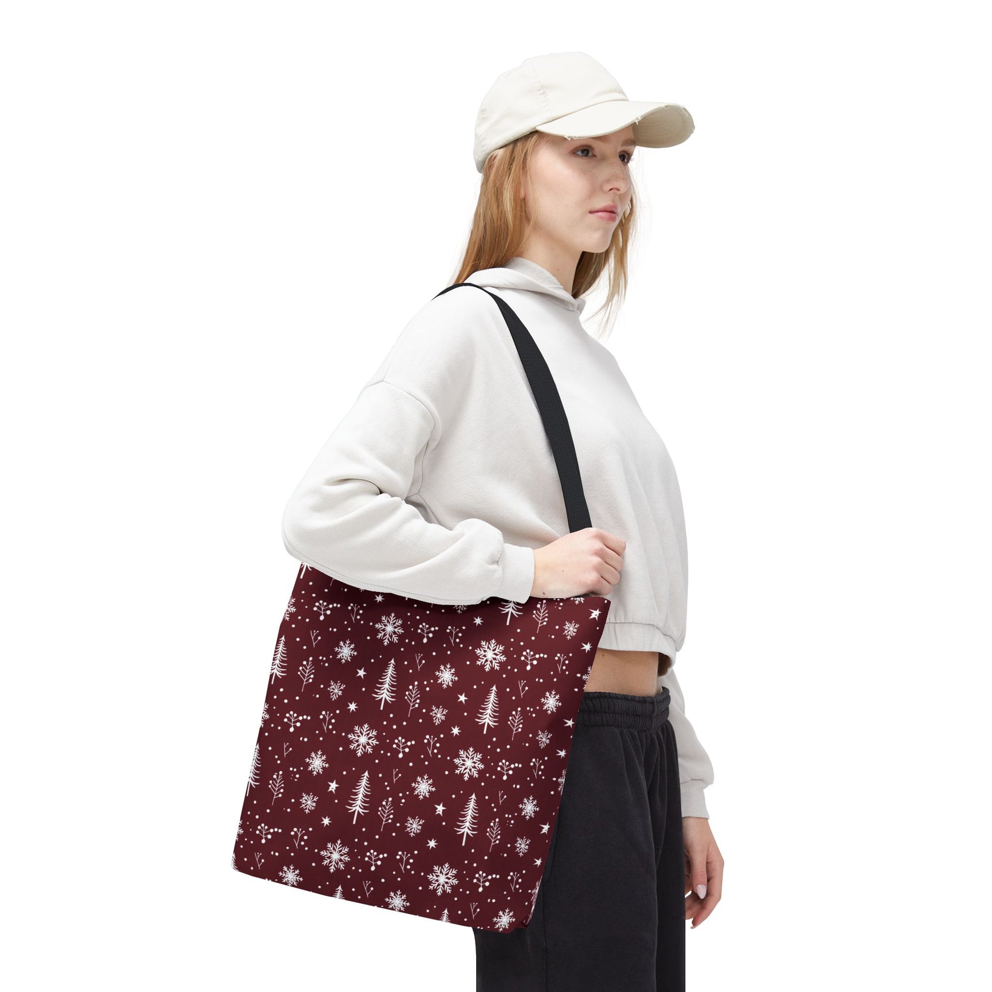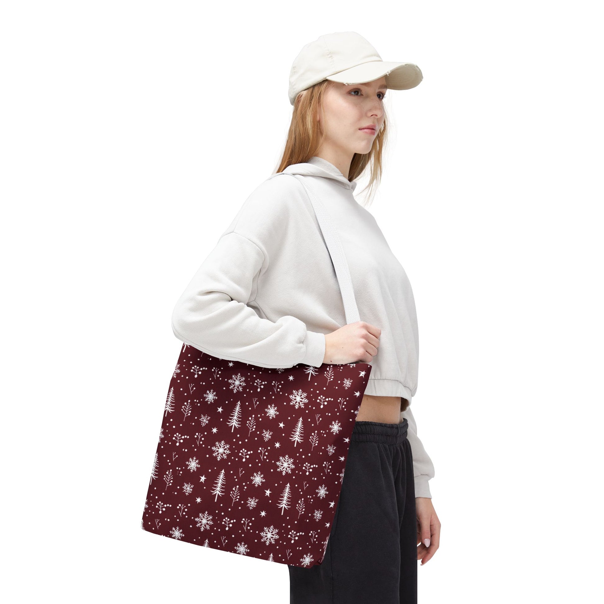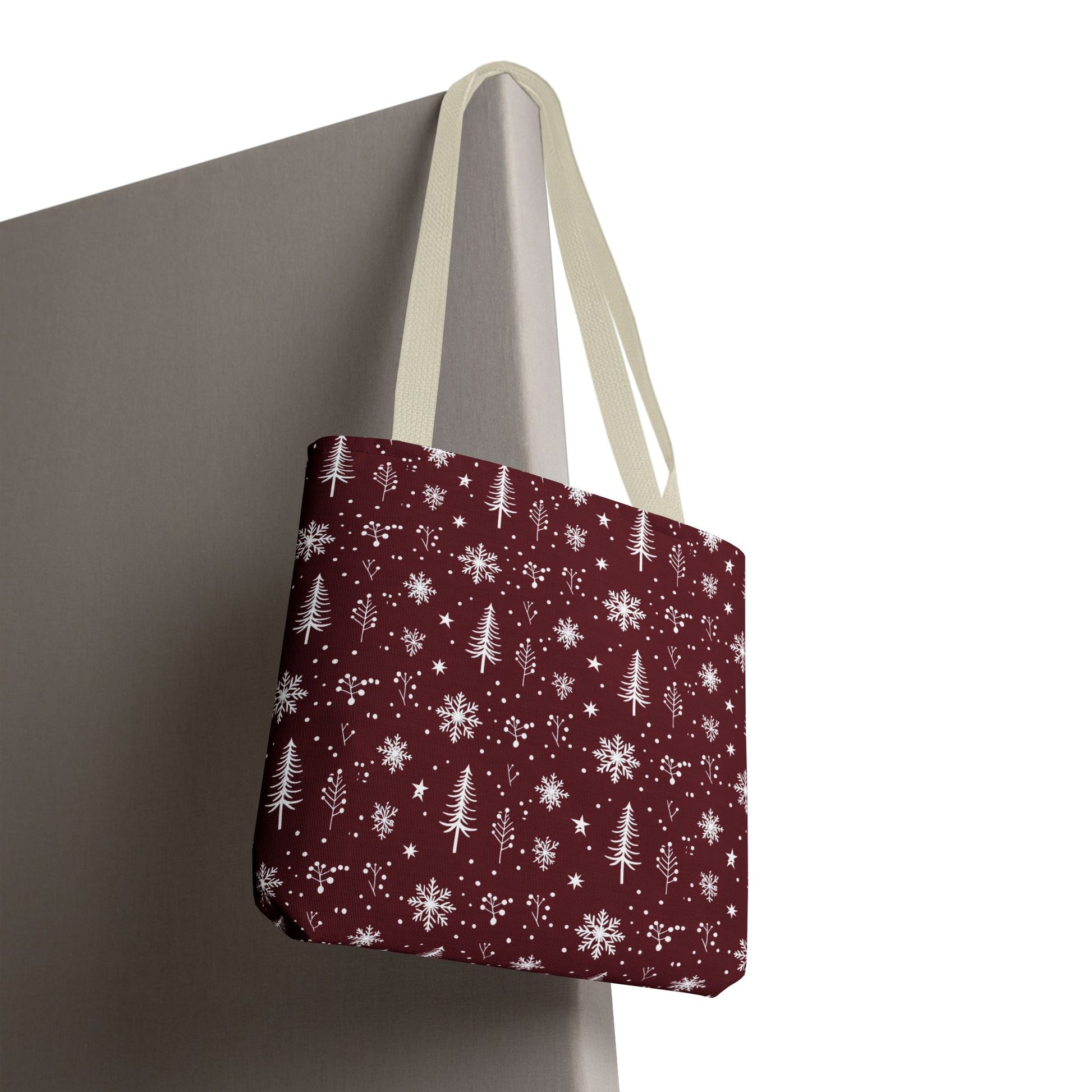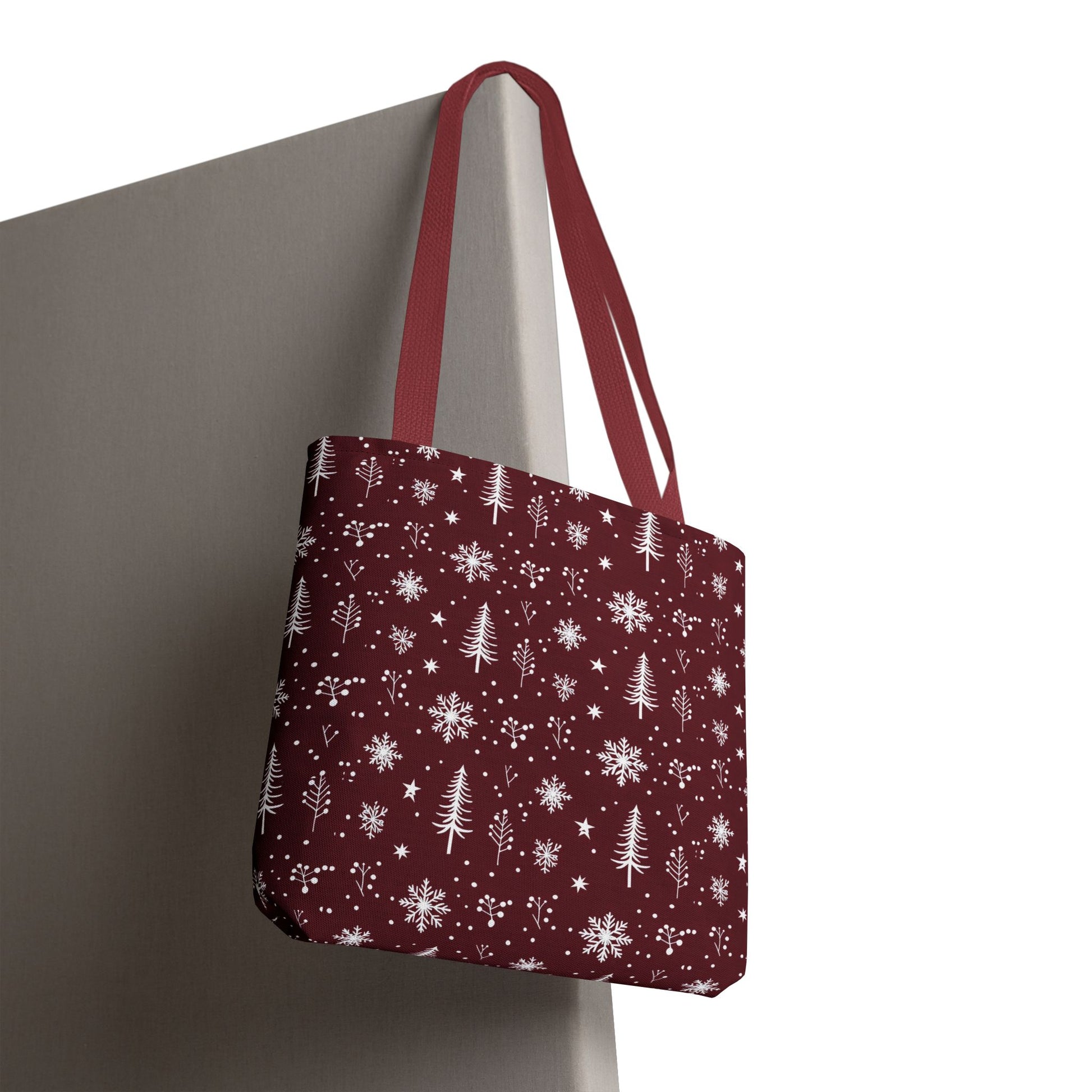 A cozy, all-over print tote woven from durable polyester with a deep cranberry background scattered with delicate white snowflakes and stylized fir silhouettes. The roomy boxed-corner design gives everyday carrying extra depth for books, market finds, or a sweater and thermos. Black cotton handles and reinforced stitching make it feel sturdy on the shoulder, while the laminated interior keeps light moisture at bay. Wear it on crisp walks to the farmers’ market, carry it through holiday gatherings, or tuck it in the trunk for last-minute tree farm runs — it adds a seasonal, hand-crafted vibe without being flashy.