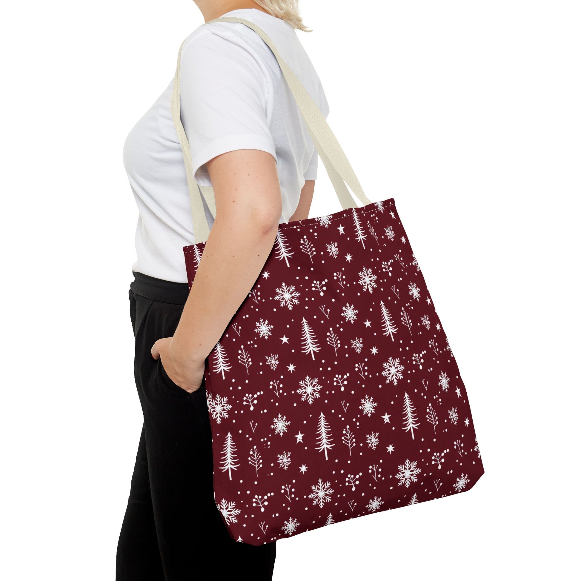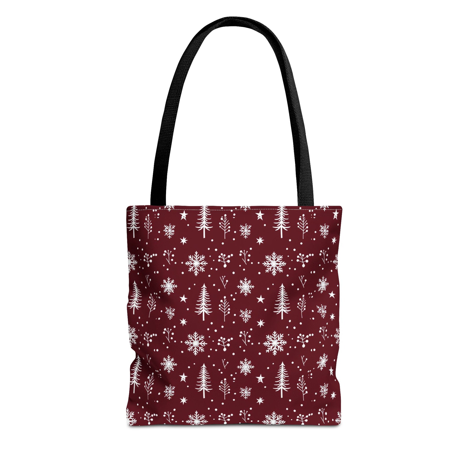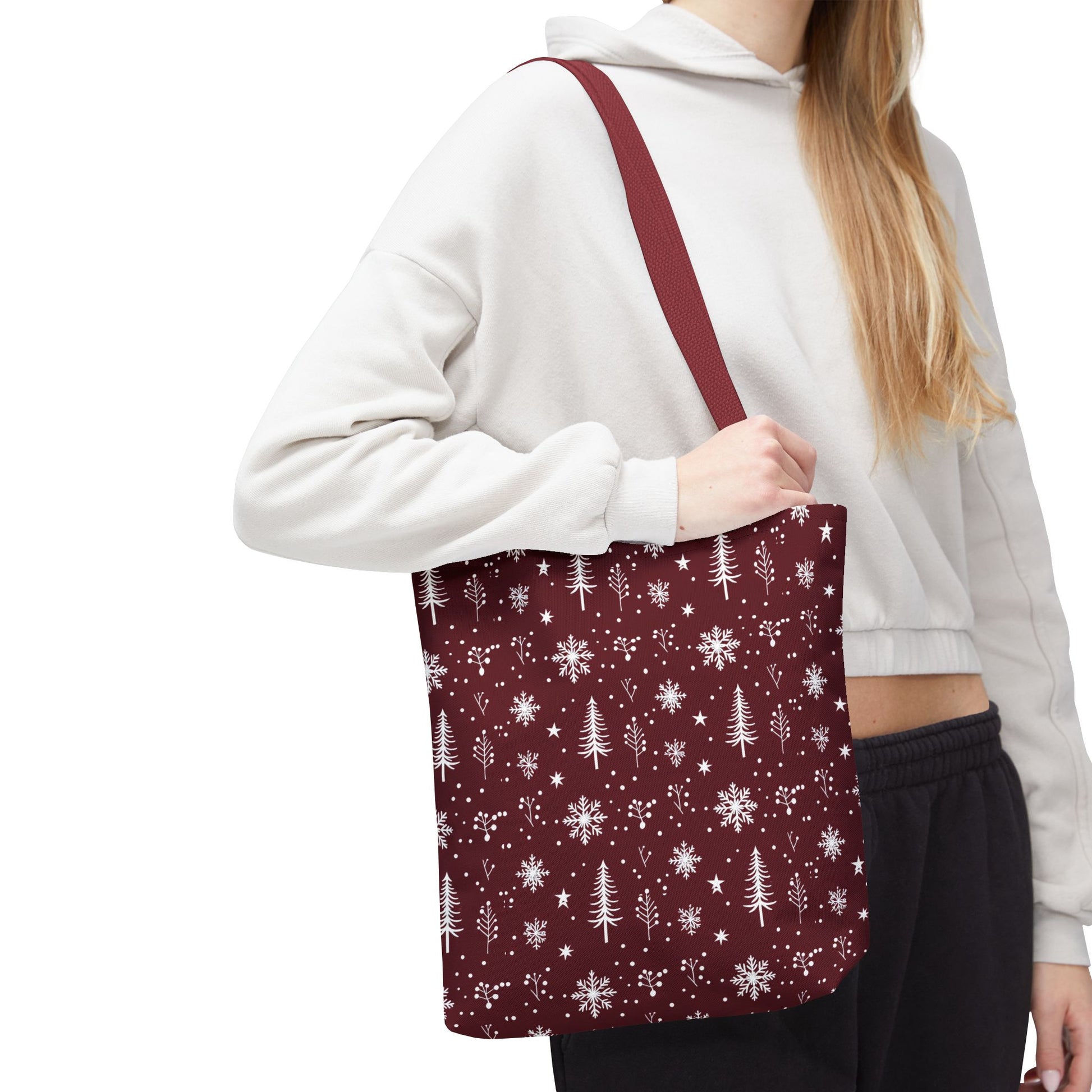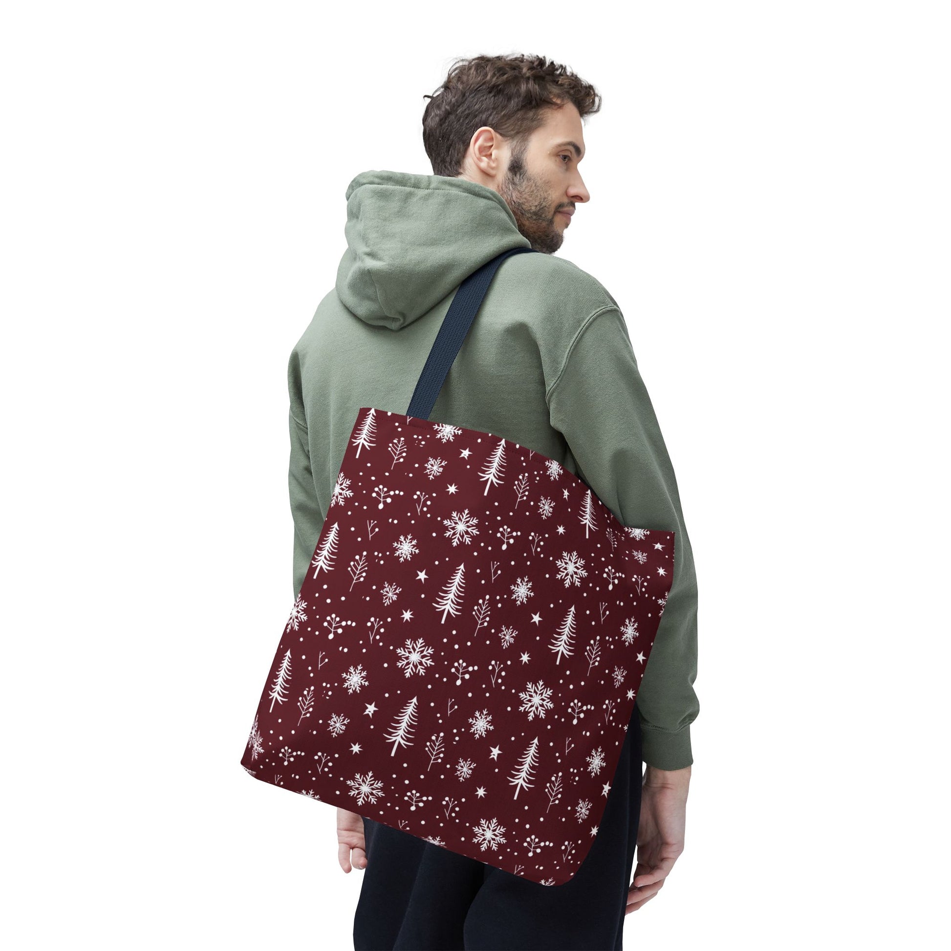 A cozy, all-over print tote woven from durable polyester with a deep cranberry background scattered with delicate white snowflakes and stylized fir silhouettes. The roomy boxed-corner design gives everyday carrying extra depth for books, market finds, or a sweater and thermos. Black cotton handles and reinforced stitching make it feel sturdy on the shoulder, while the laminated interior keeps light moisture at bay. Wear it on crisp walks to the farmers’ market, carry it through holiday gatherings, or tuck it in the trunk for last-minute tree farm runs — it adds a seasonal, hand-crafted vibe without being flashy.