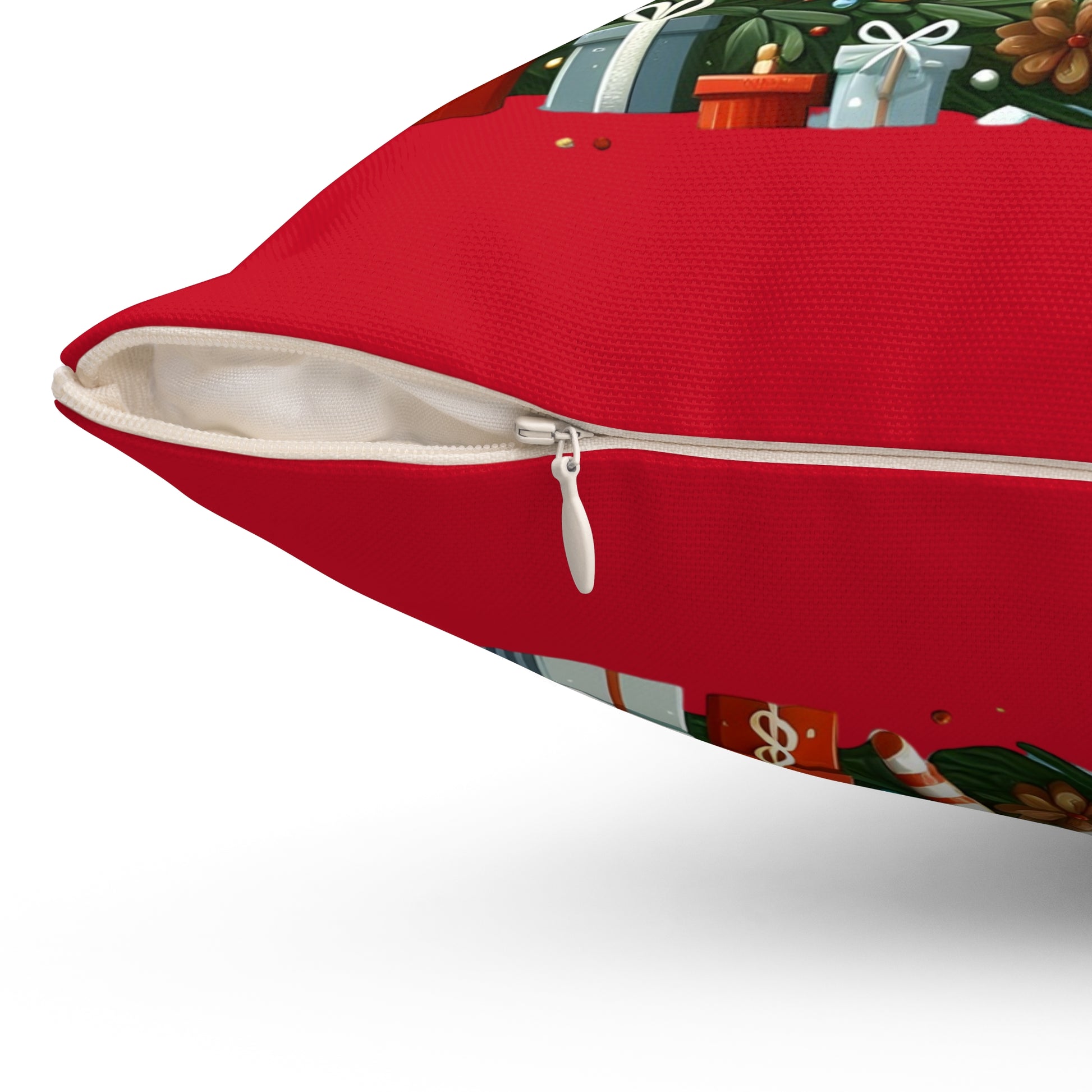 A festive square pillow that brings whimsical holiday spirit to sofas and cozy corners. The double-sided print features a lush evergreen wreath shaped into a decorative letter Z, woven with candy canes, red baubles, holly leaves, and tiny wrapped gifts against a warm red backdrop sprinkled with snowflakes. Soft spun polyester keeps the cover smooth and wrinkle-free; the recycled polyester insert ships separately, slightly oversized so the finished cushion looks plump and inviting. Tuck it into your living room, reading nook, or guest bedroom to add a handcrafted, cheerful accent for winter gatherings and seasonal decor swaps.