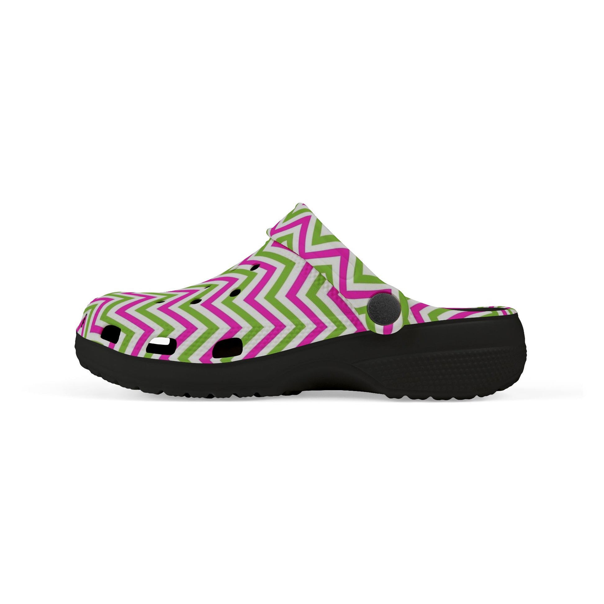 These vibrant Kid's EVA Foam Clogs are perfect for the little ones who love to express their style while staying comfortable. Featuring a lively zigzag pattern in cheerful pink and green hues, they add a fun touch to any outfit. Lightweight and flexible, these clogs are designed for all-day wear, whether at home, in the playground, or on family outings. Ideal for kids who enjoy playful accessories, each pair comes with charming clog accessory charms to personalize their footwear. Perfect for birthdays, summer vacations, and everyday adventures, these clogs make a delightful gift for kids who love to stay stylish and comfortable.