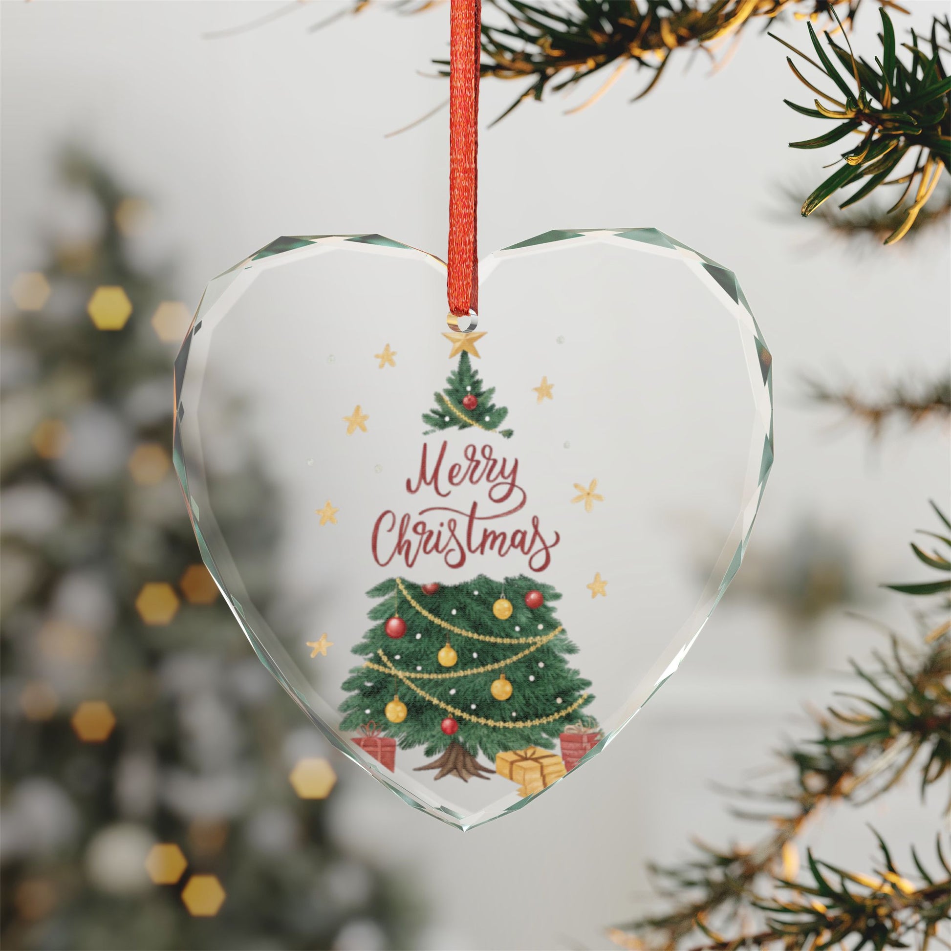 Product features - 100% crystal glass with faceted edge for light-catching sparkle - One-sided printed Christmas tree and “Merry Christmas” text (visible faintly from back) - Available in heart or round shape - Comes ready with a red ribbon for hanging - Adult-only item; blank base product sourced from China