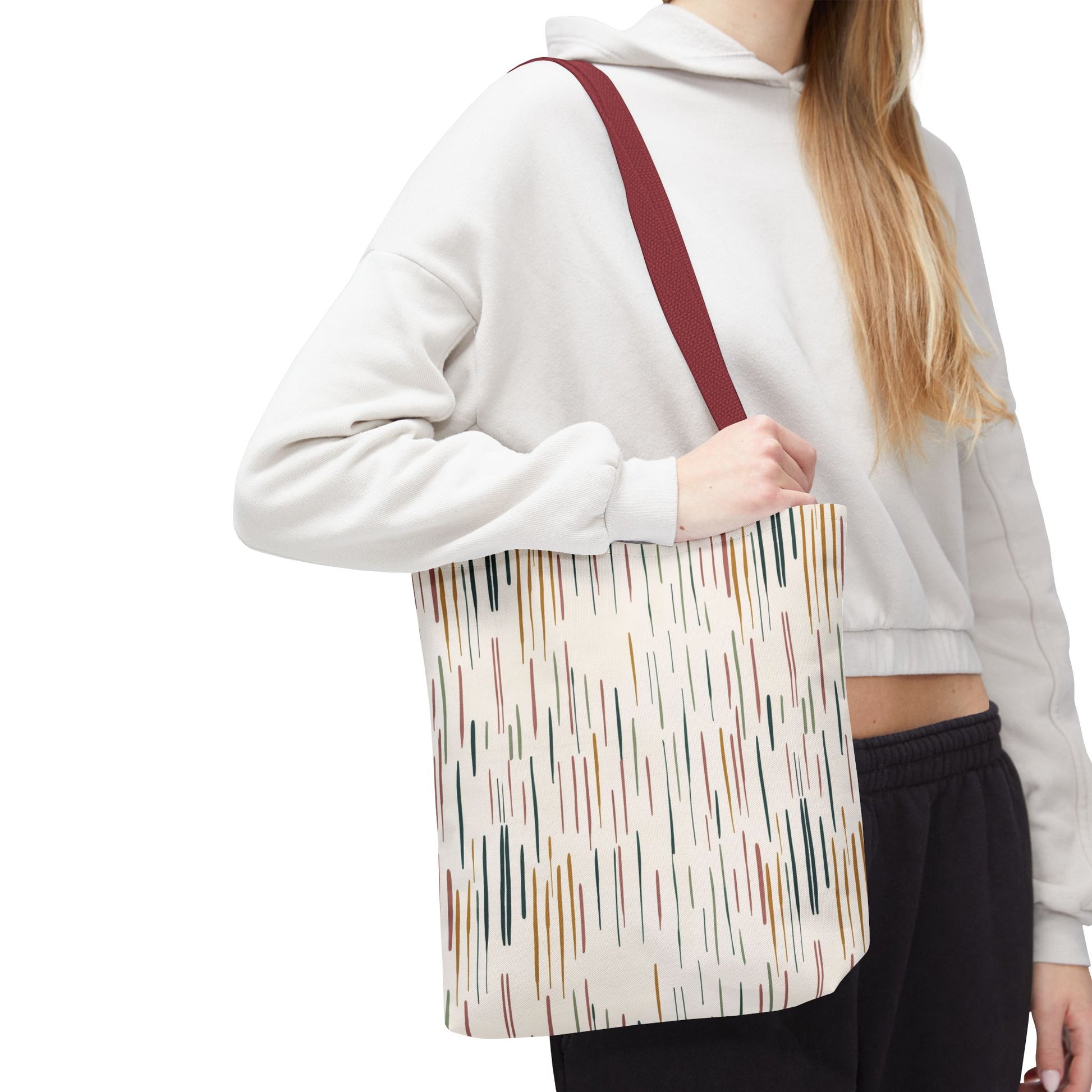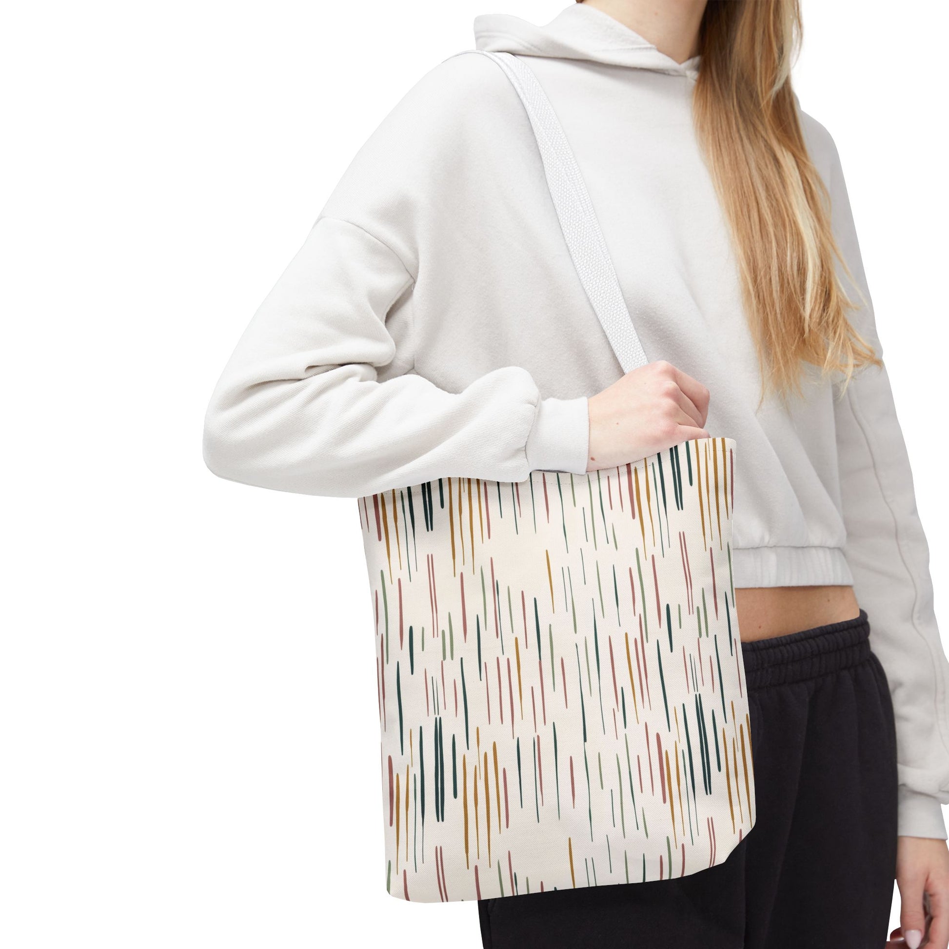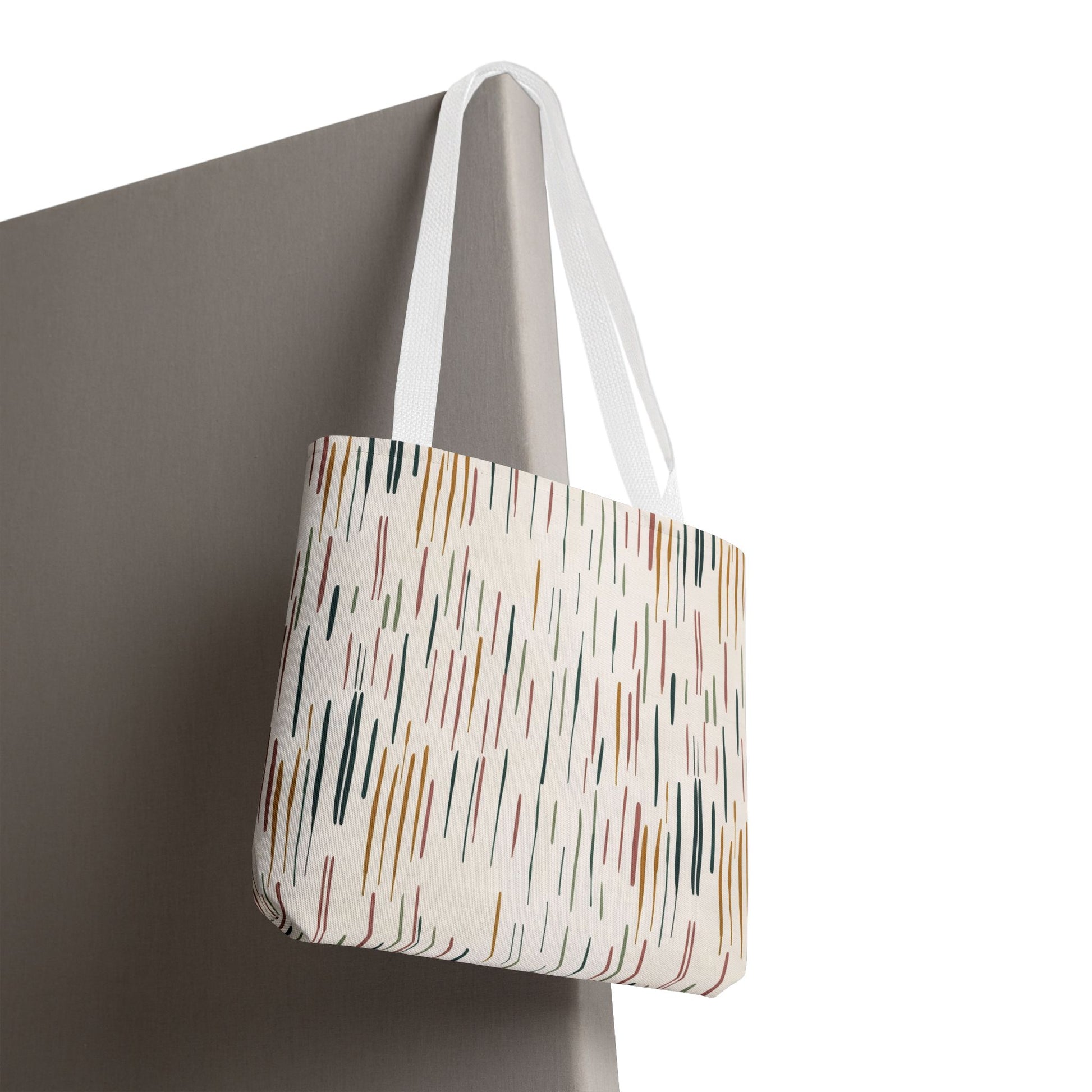 Light, artful, and quietly modern — this tote brings a soft, painterly rhythm to everyday carry. Thin, multicolored strokes float across a warm ivory field, giving the bag a hand-crafted, watercolor feel that complements neutral wardrobes and curated market hauls. The roomy boxed-corner silhouette holds groceries, a laptop sleeve, or weekend finds while the reinforced handles stand up to daily use. It’s the kind of tote you reach for when you want something subtle yet expressive — an easy, wearable accent for days at the farmers’ market, coffee shop catch-ups, or museum afternoons.