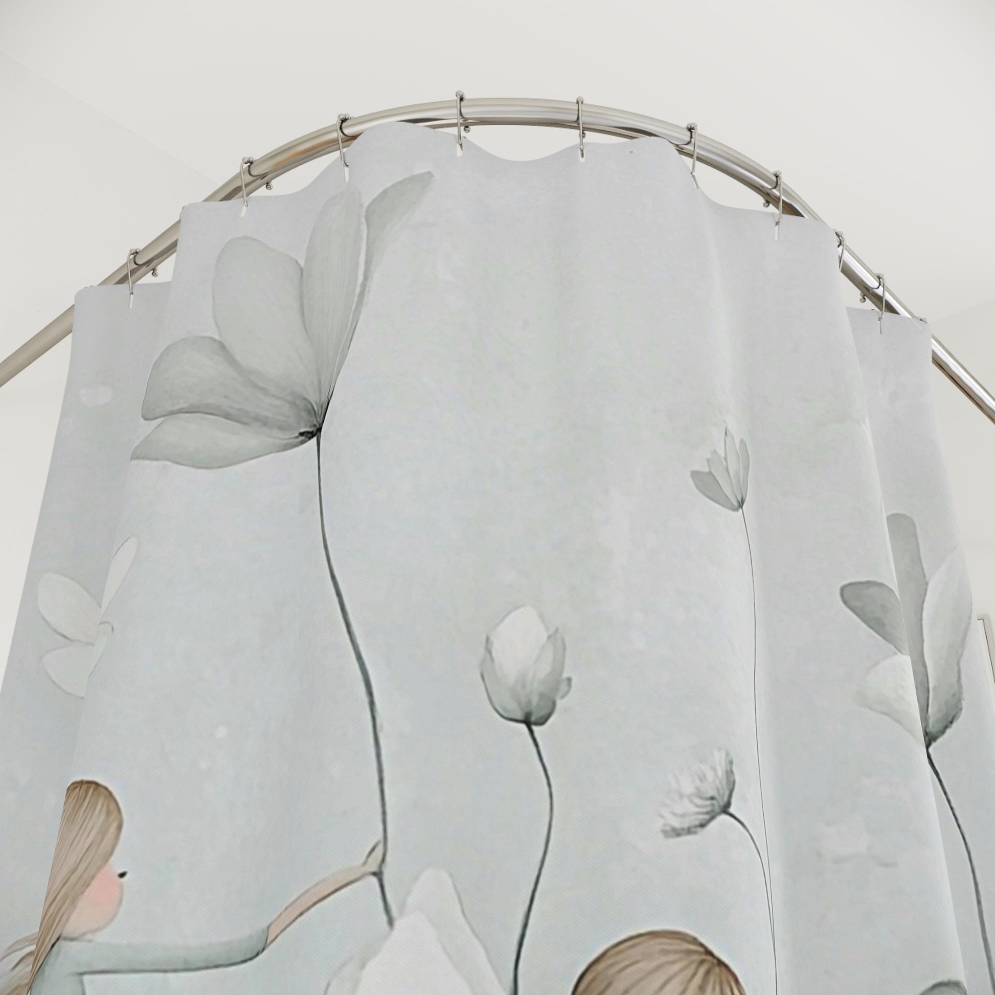 Soft, muted watercolor figures dance across a misty meadow — three little girls in flowing dresses reaching for oversized blooms. This polyester shower curtain brings a gentle, storybook calm to a bathroom, turning a daily routine into a quiet, whimsical moment. The single-sided print keeps the illustration crisp and detailed while the durable fabric dries quickly and holds its shape. Lightweight and ethereal in tone, it layers easily with neutral towels and natural textures to create a serene, childlike corner of the home.