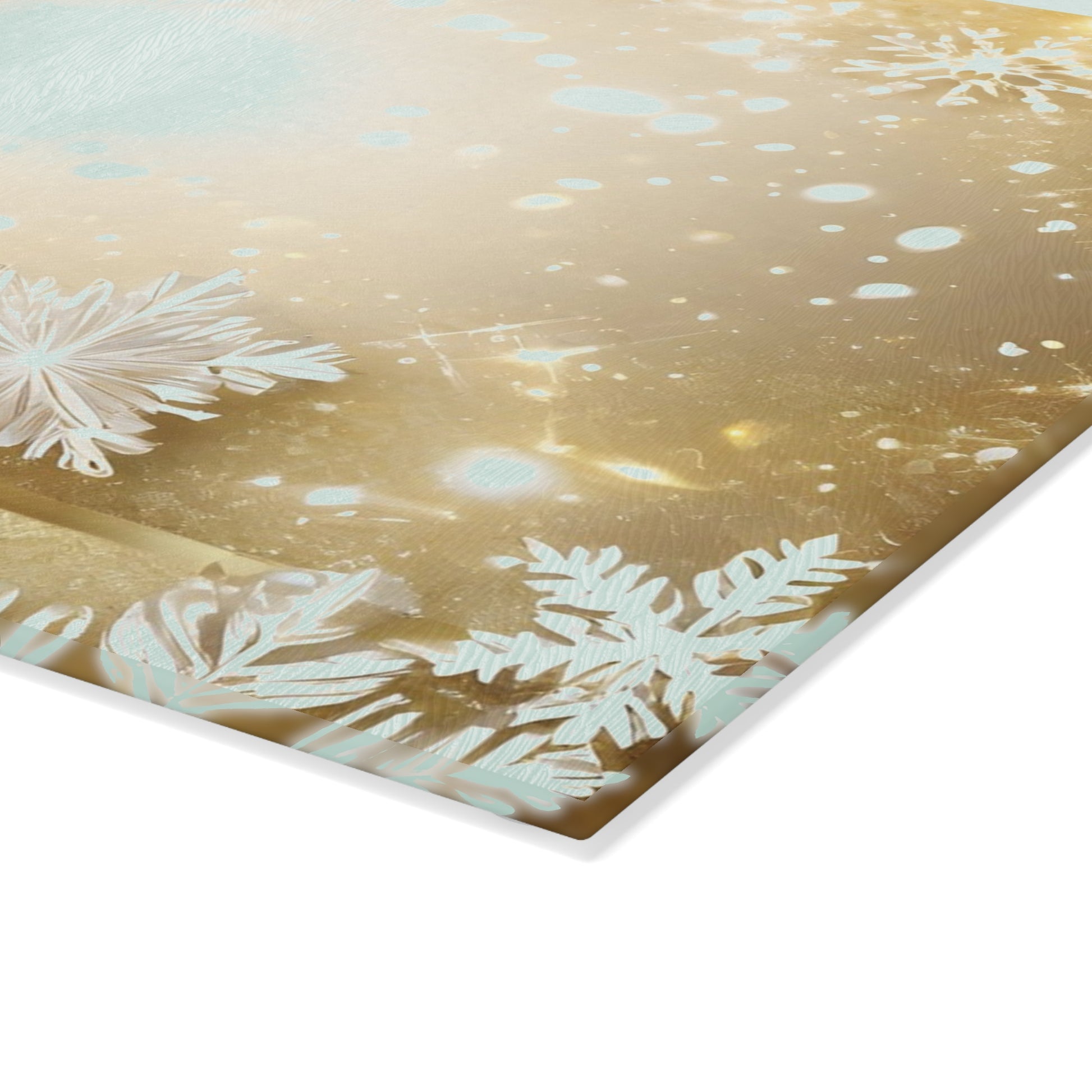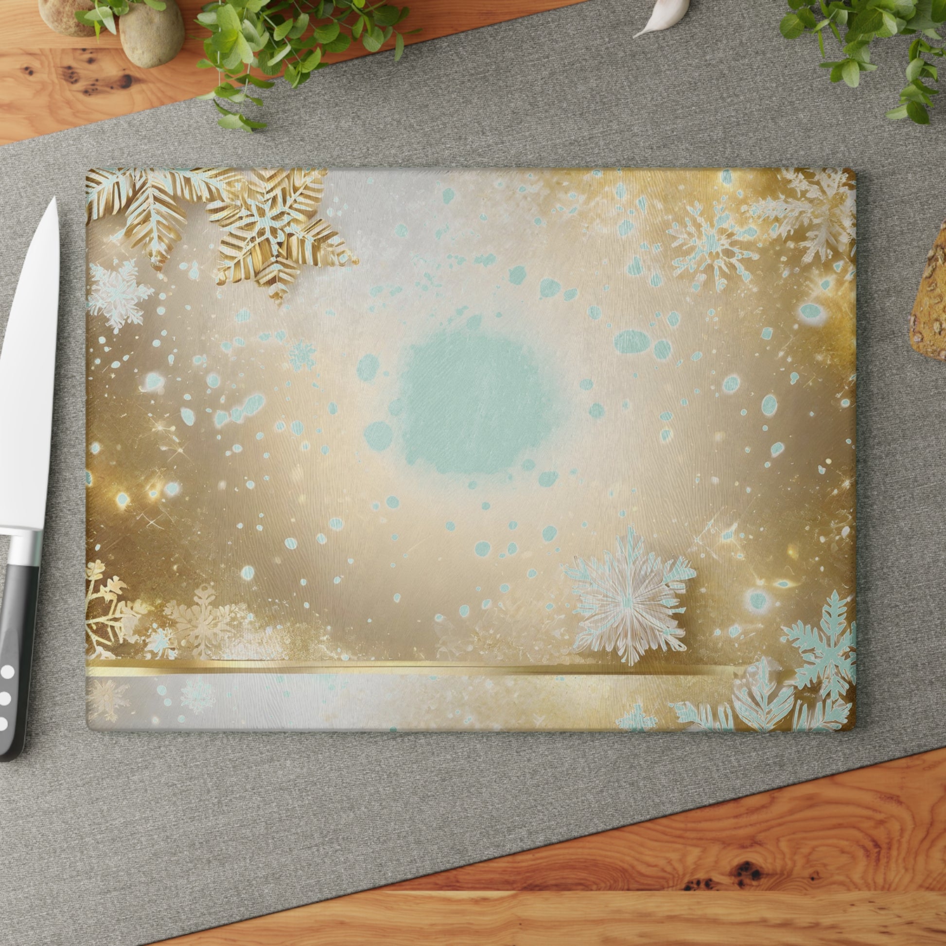 Bring a touch of winter wonder to everyday kitchen tasks with this tempered glass cutting board. Soft gold and ivory tones drift across the surface like falling snowflakes and warm light, creating a subtly festive scene that stays vivid thanks to a durable printing method that resists scratches. The textured glass gives a hygienic, easy-to-clean prep area while four rubber feet keep the board steady on counters. Small enough for quick chopping, large enough for serving a cheese plate, it slips easily into holiday gatherings and quiet, cozy mornings alike.