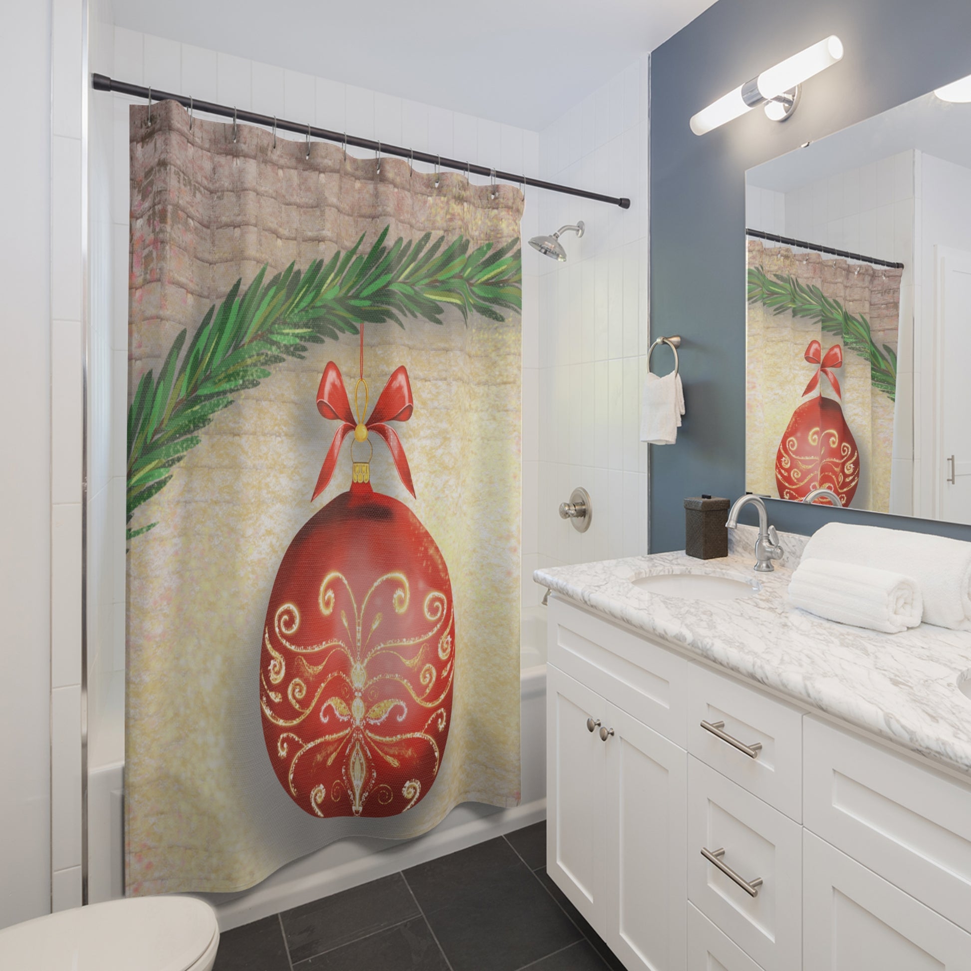 Festive Holiday Shower Curtain with Red Ornament and Pine Wreath, Christmas Bathroom Decor, Holiday Home Accessory, Gift Idea, [...]