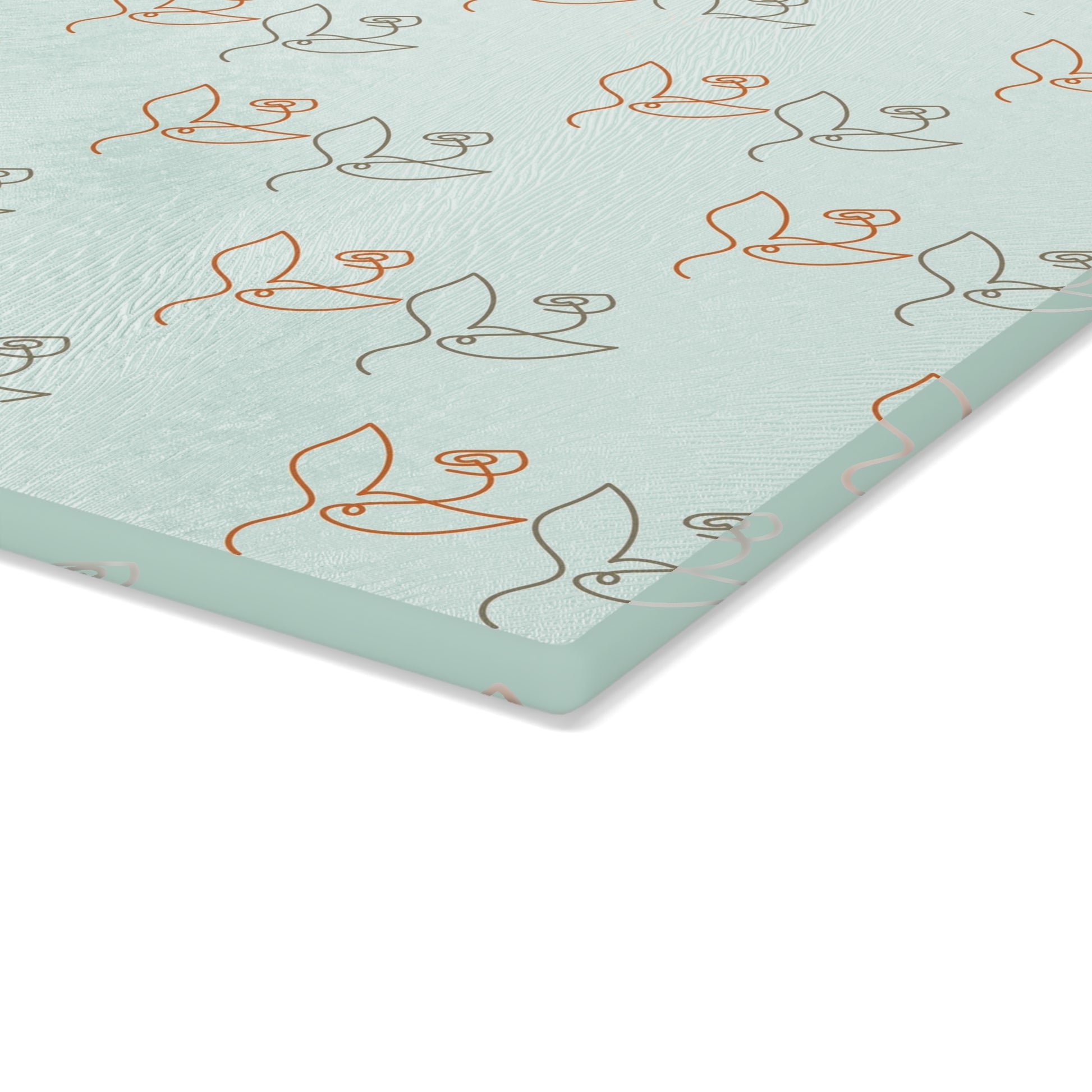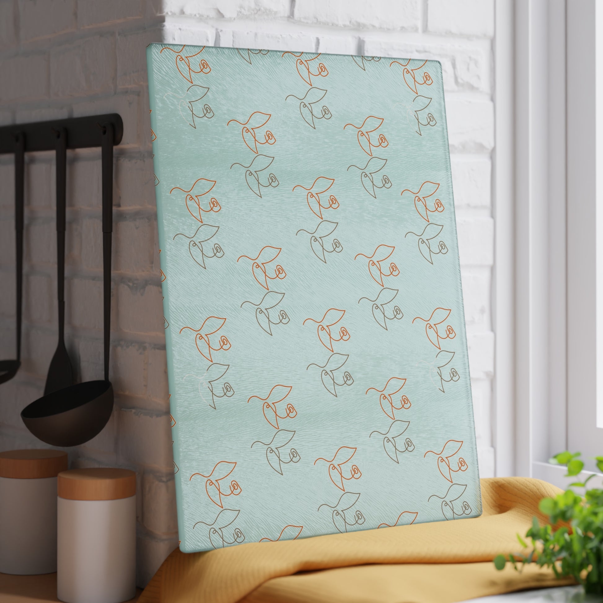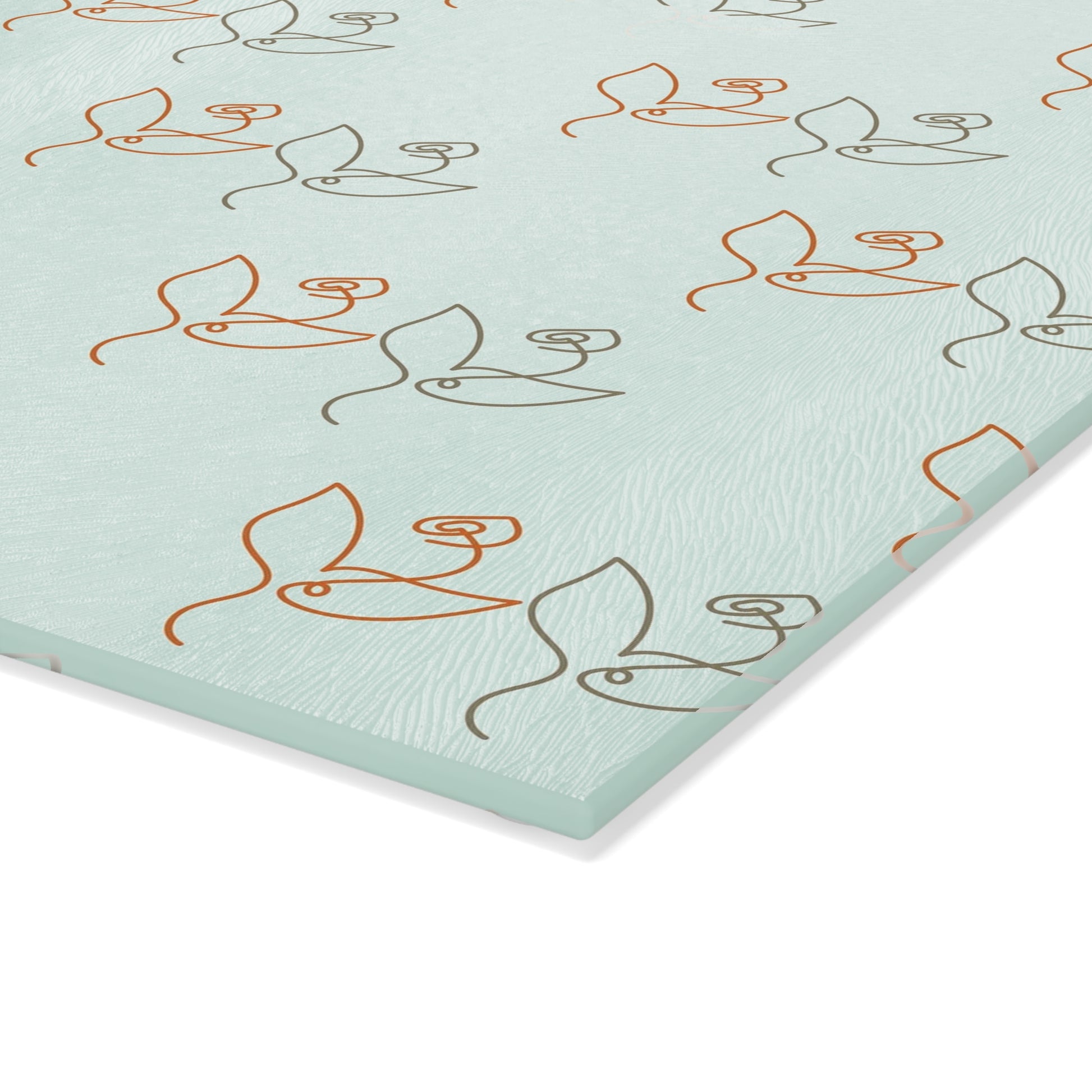 Thin, cool glass meets soft botanical lines. This tempered glass cutting board carries a delicate, hand-drawn floral repeat in muted rose and slate on a pale background —light, airy, and quietly modern. The textured glass surface holds up to prep work while the printed design stays vibrant thanks to a durable decoration process that resists scratching. Rubber feet keep the board steady on countertops. It slips easily under a bowl of lemons, beside a stovetop herb bunch, or out onto a small brunch spread, adding a subtle, styled moment to everyday kitchen tasks. Recommended to hand-wash to keep that crisp color and smooth finish looking fresh.