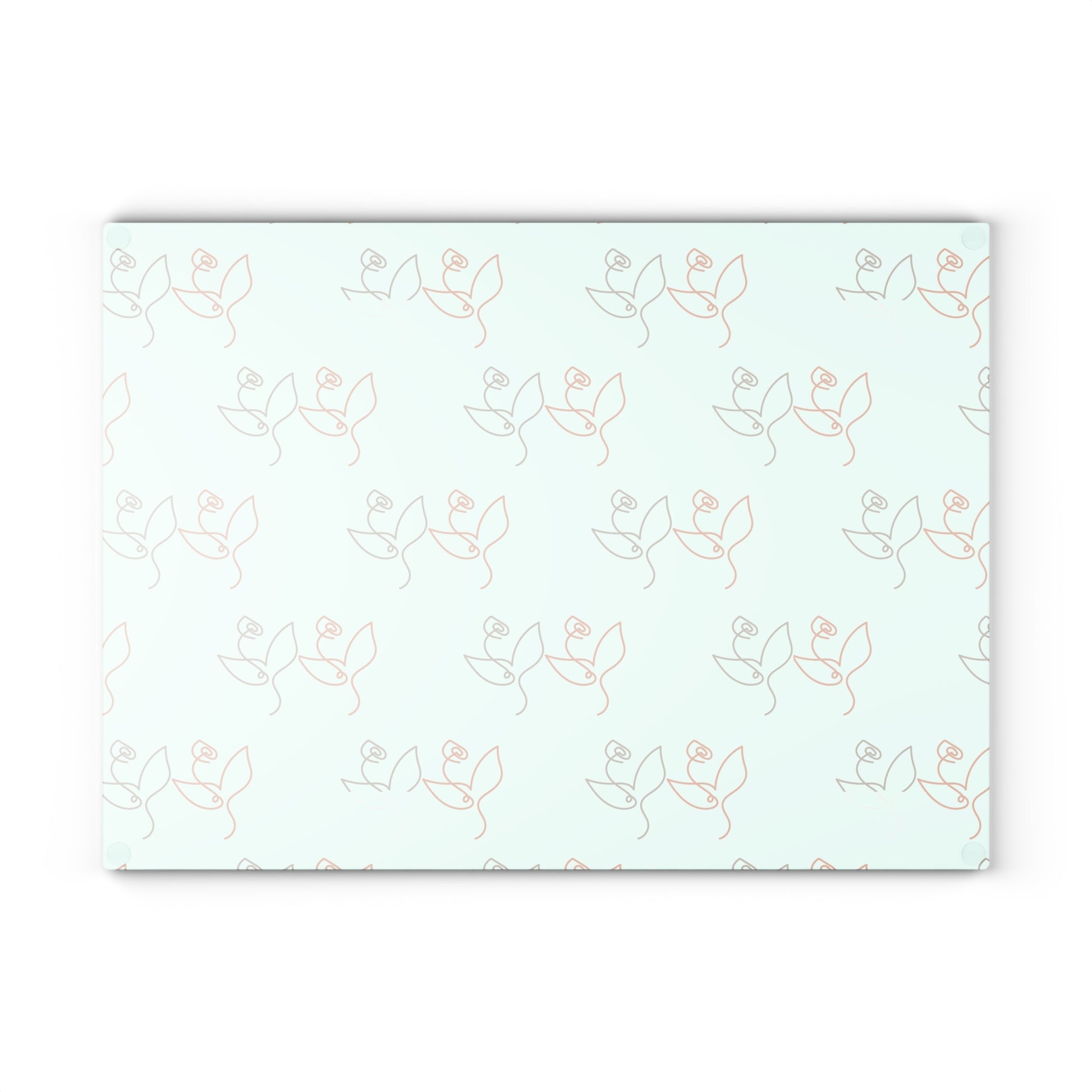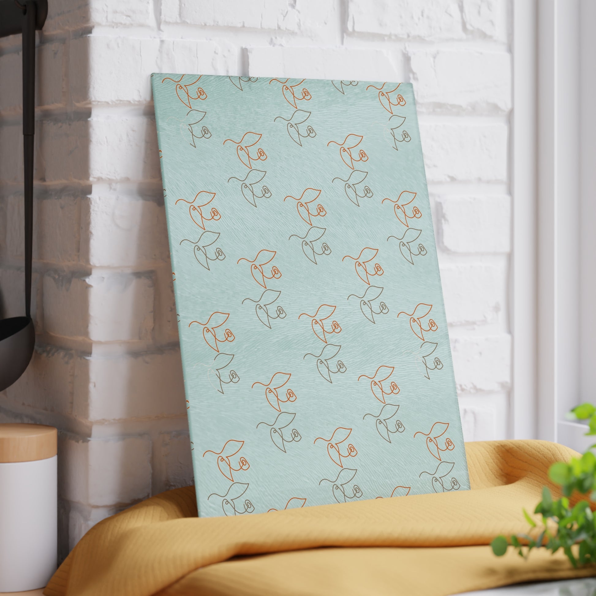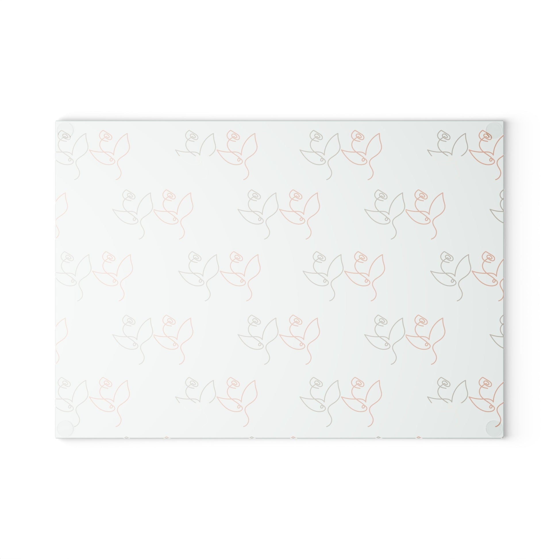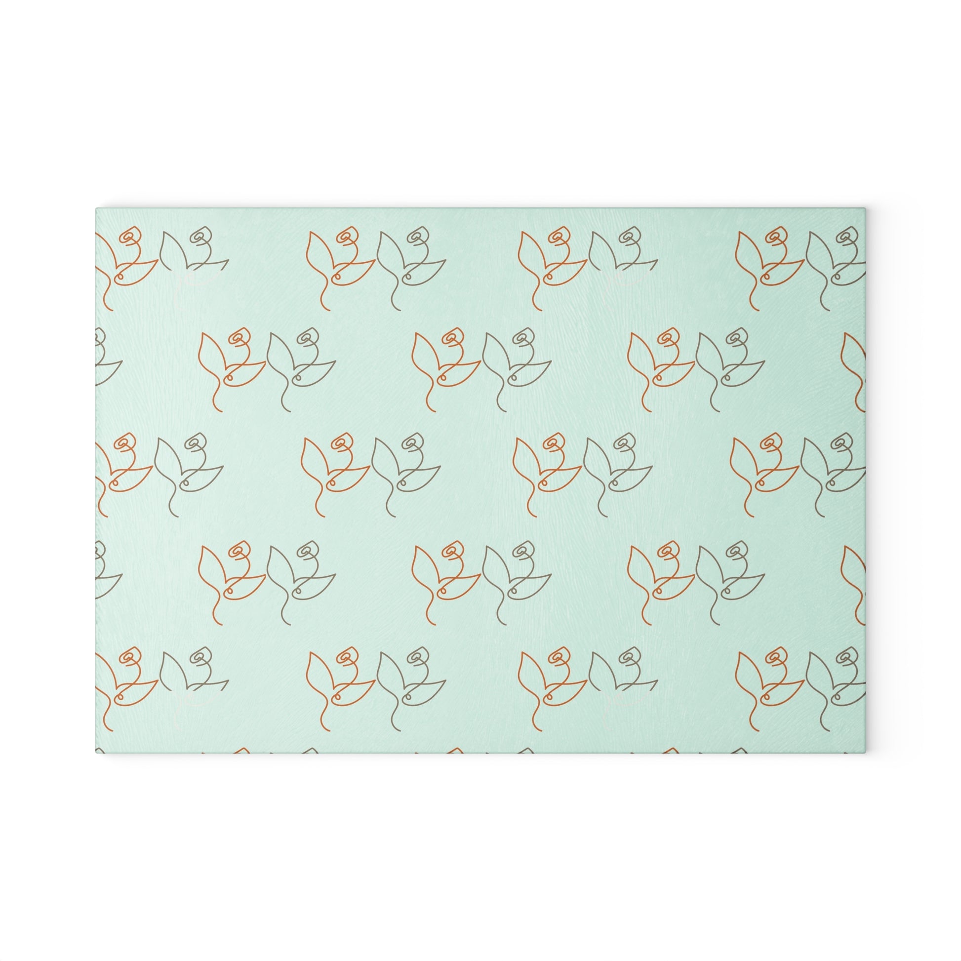 Thin, cool glass meets soft botanical lines. This tempered glass cutting board carries a delicate, hand-drawn floral repeat in muted rose and slate on a pale background —light, airy, and quietly modern. The textured glass surface holds up to prep work while the printed design stays vibrant thanks to a durable decoration process that resists scratching. Rubber feet keep the board steady on countertops. It slips easily under a bowl of lemons, beside a stovetop herb bunch, or out onto a small brunch spread, adding a subtle, styled moment to everyday kitchen tasks. Recommended to hand-wash to keep that crisp color and smooth finish looking fresh.
