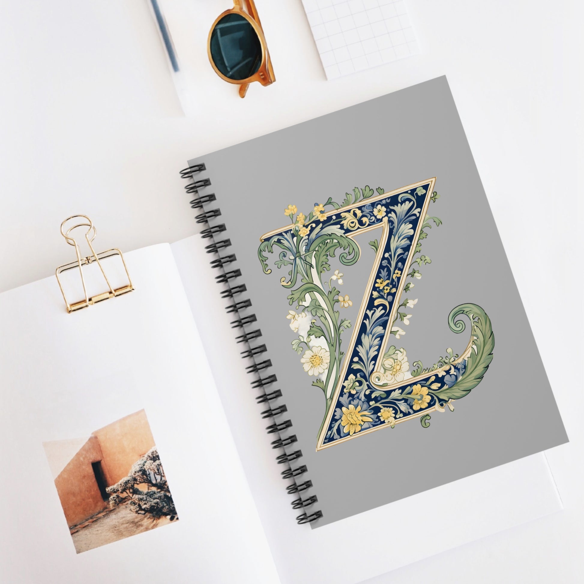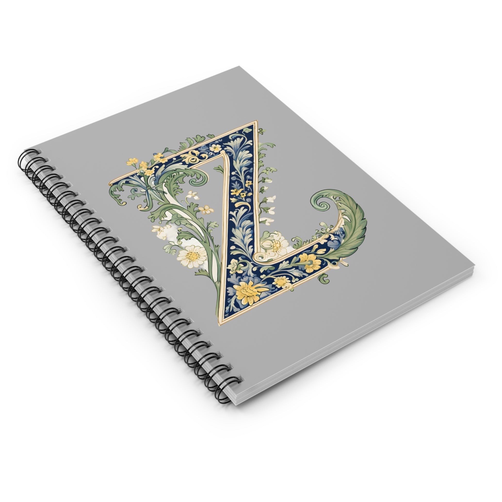 A graceful spiral notebook that brings old-world charm to everyday writing. The soft grey cover is printed with an ornate letter Z—filled with scrolling navy vines, pale yellow blooms and delicate green flourishes—so each page-turn feels like a page from a treasured journal. The 6" x 8" size slips easily into bags and hands, while the metal spiral lies flat for comfortable note-taking. Keep loose receipts, sketches, or pressed petals in the inner document pocket. Use it for daily lists, study notes, creative drafts, or as a personal keepsake that ages beautifully with your thoughts.
