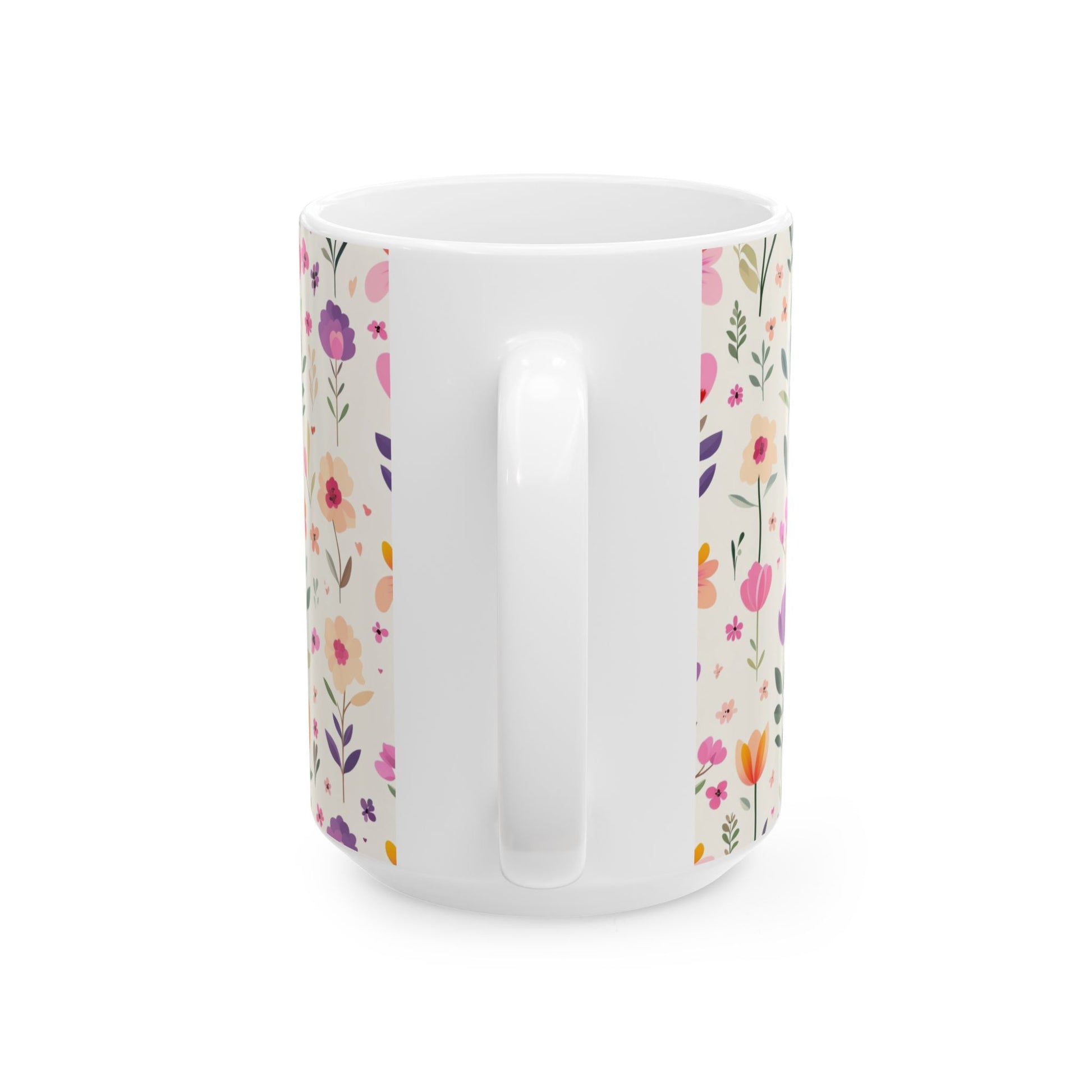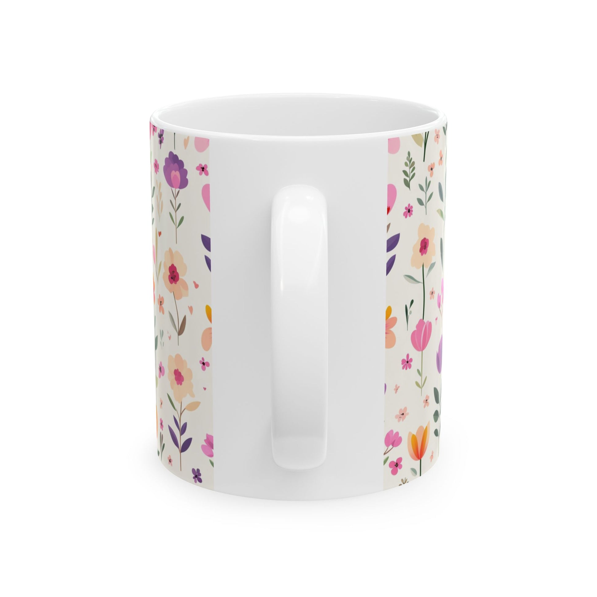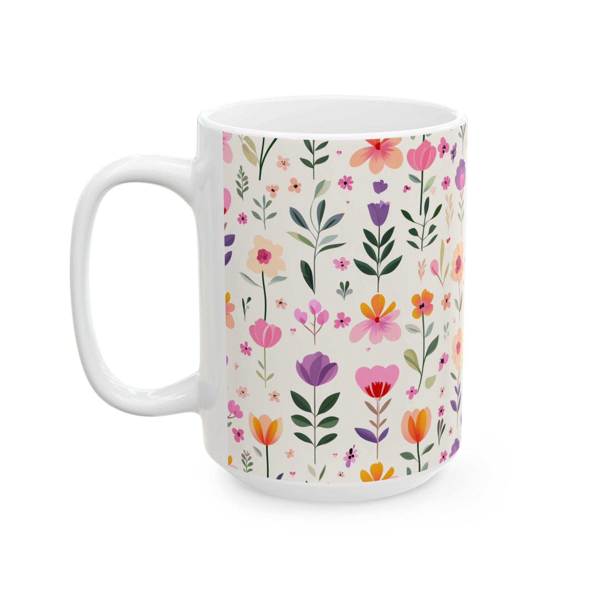 Bright, cheerful ceramic mug wrapped in a hand-drawn wildflower pattern. Soft pinks, purples, oranges and leafy greens bloom across a glossy white surface, bringing a gentle, uplifting moment to morning coffee or an afternoon tea break. The comfortable C-handle and shiny finish make each sip feel a little more intentional — like stealing five minutes in a sunlit garden. It pairs naturally with cozy routines, desk corners filled with notebooks, or slow weekend mornings when you want something pretty and familiar by your side.