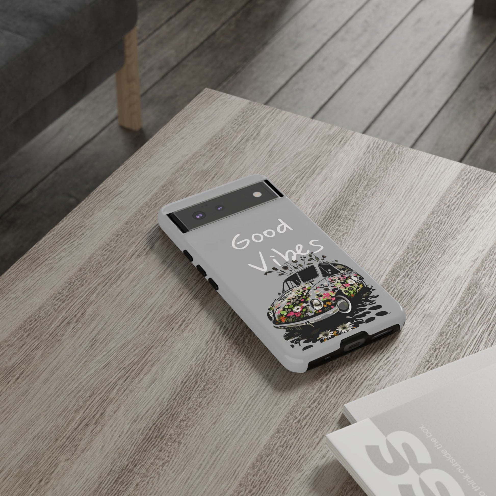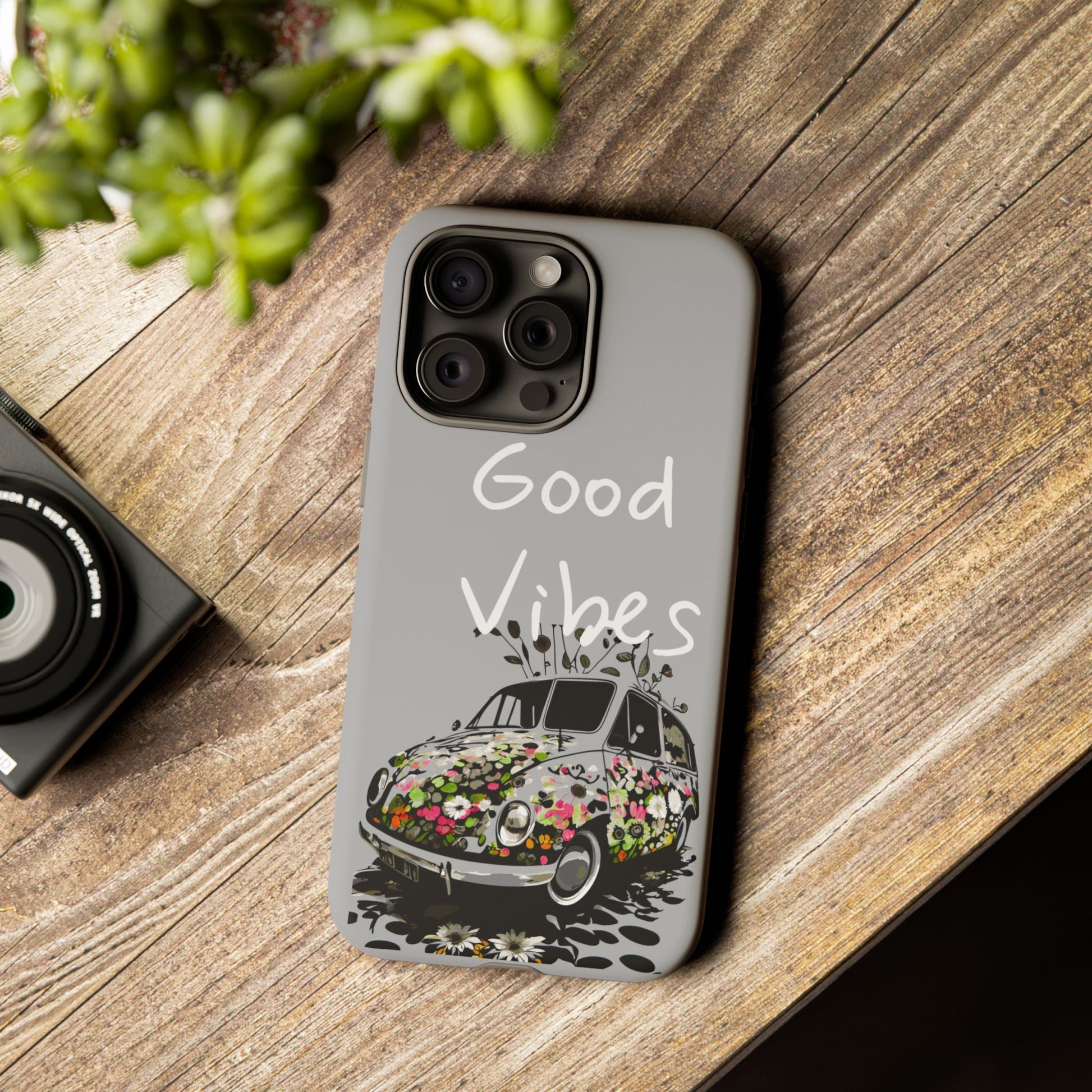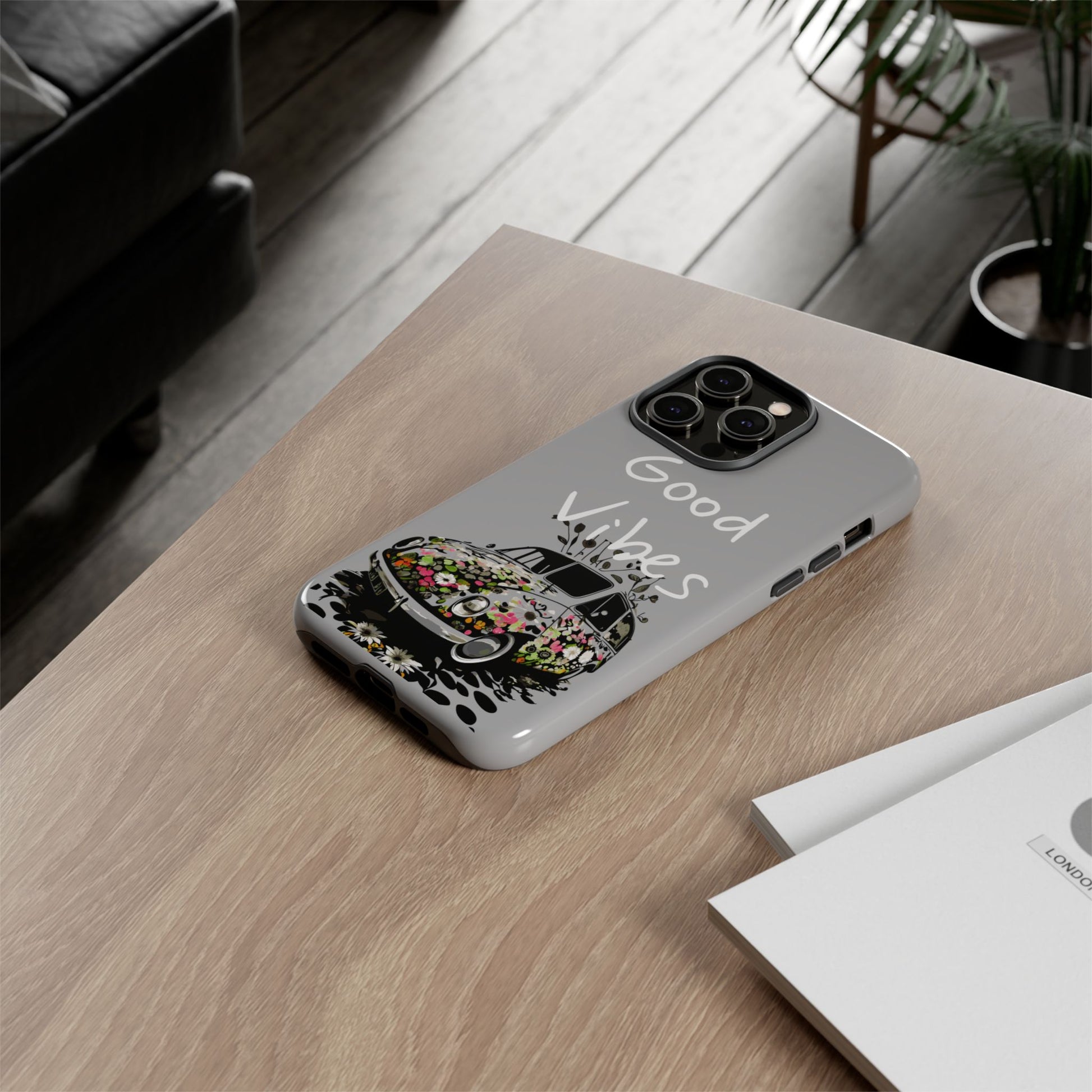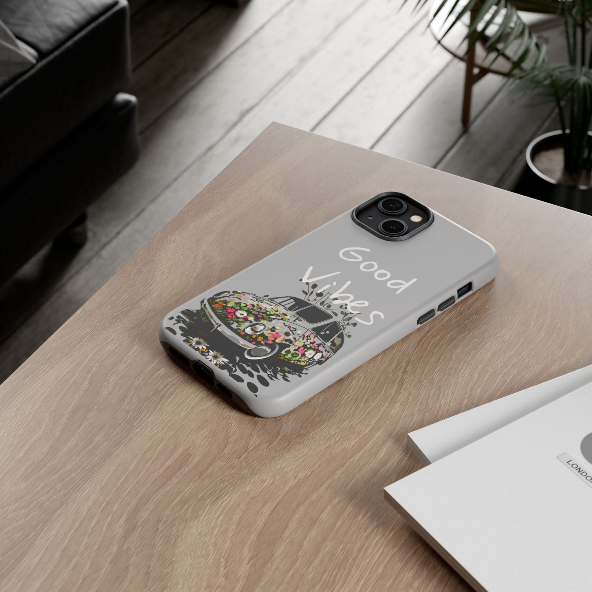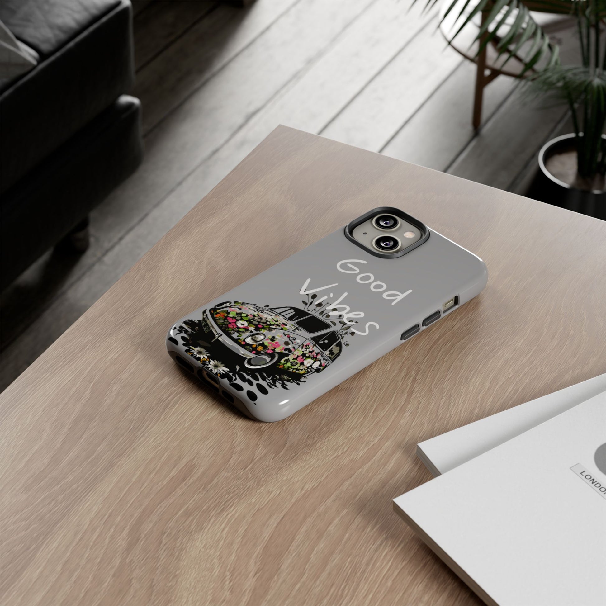Introducing our protective phone case, designed to make a statement while keeping your device safe. With a fun and vibrant design featuring a colorful floral van and the encouraging phrase 'Good Vibes,' this phone case is perfect for anyone who embraces positivity and creativity. It caters to young adults and those young at heart who appreciate unique accessories that reflect their personality. This phone case not only adds a splash of color to your everyday life but also provides top-notch protection for your phone. It's an ideal gift for birthdays, holidays, or just to treat yourself. Let your phone stand out while being safe from daily bumps and drops!