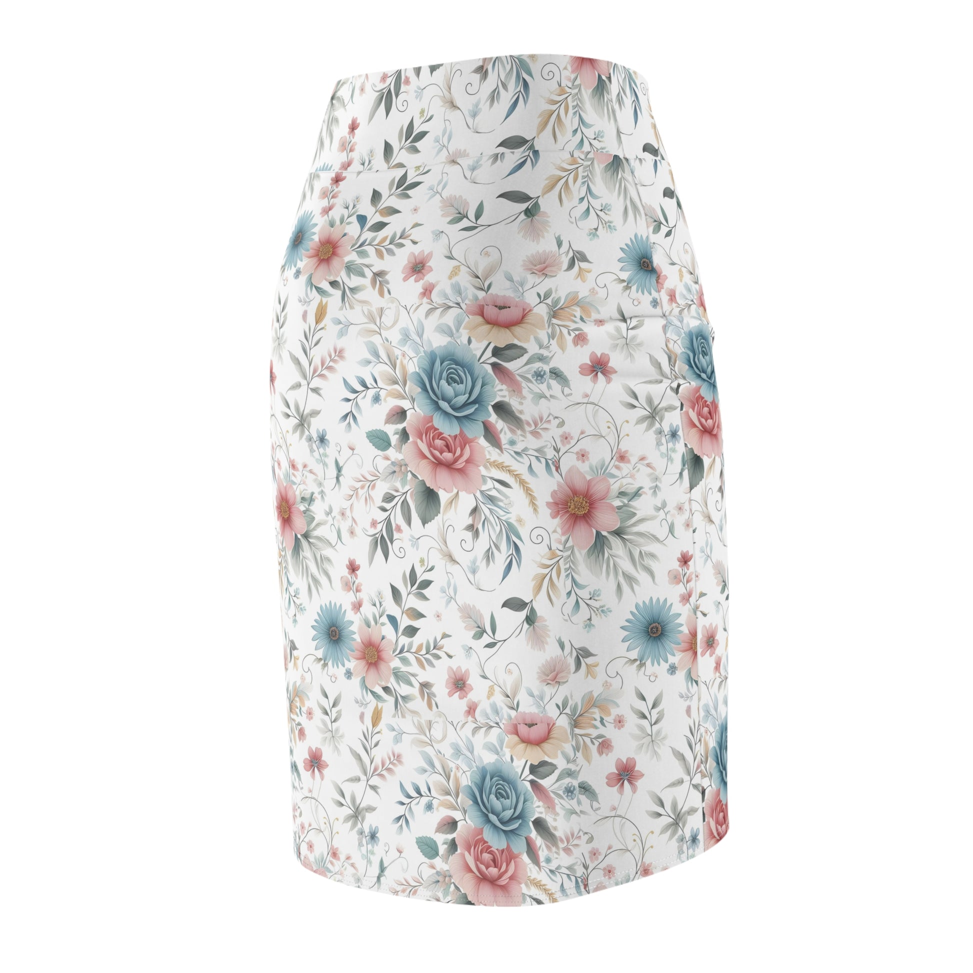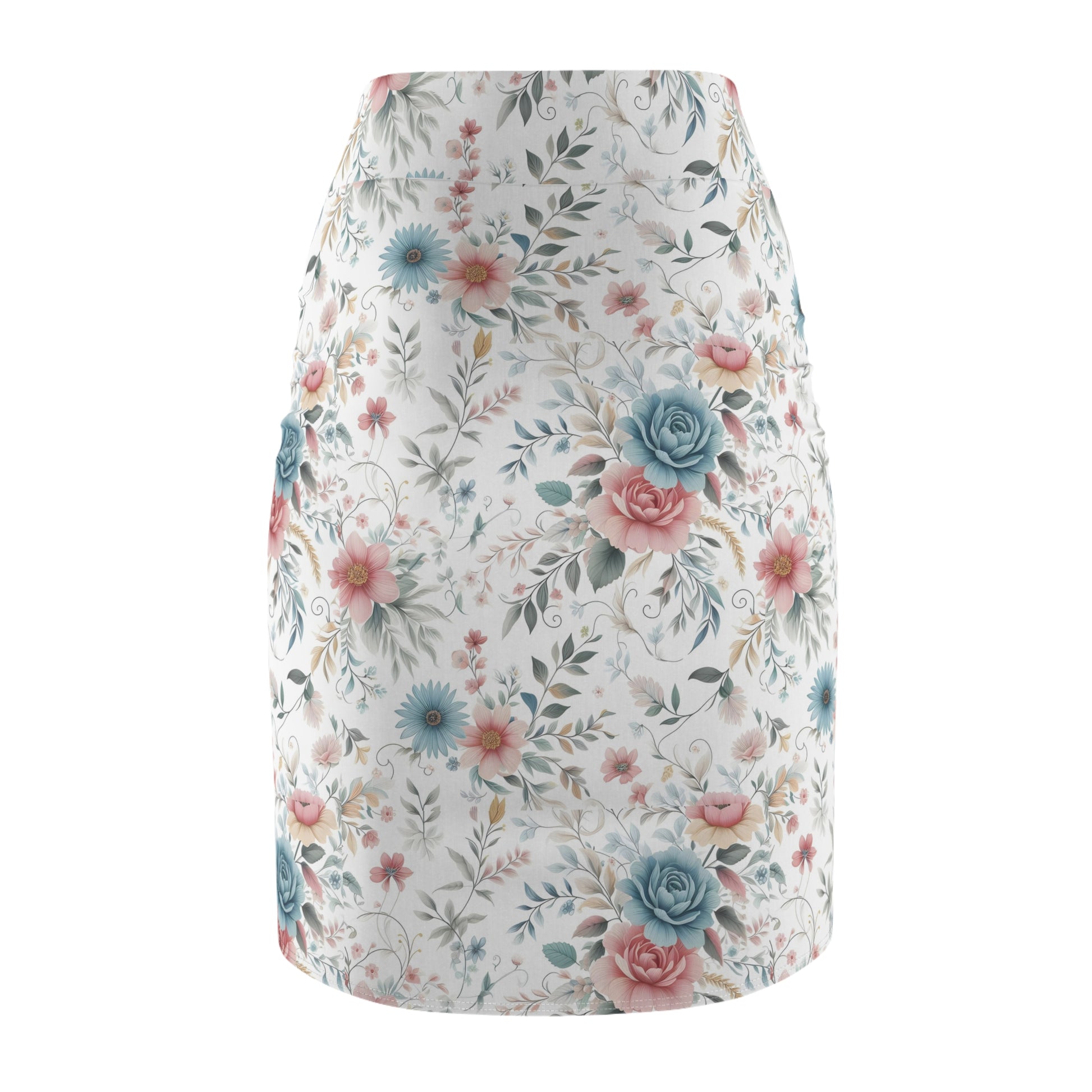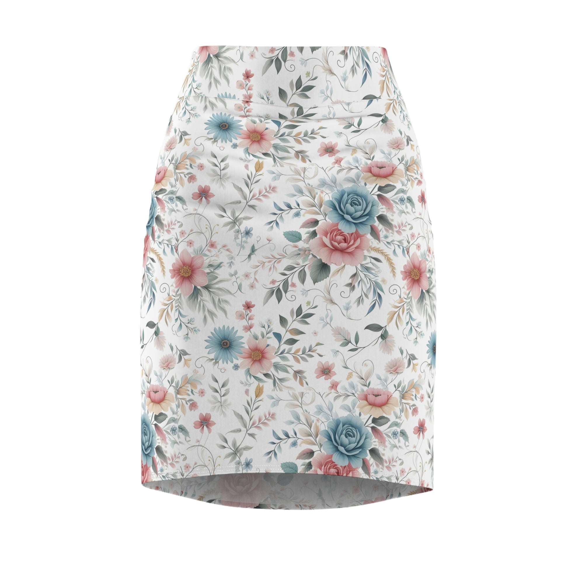 This mid-waist pencil skirt wraps you in a soft, vintage floral story. Lightweight 4-way stretch fabric skims the body while allowing movement, and the all-over roll-to-roll print gives the delicate roses and sprigs a painterly, watercolor feel that reads like a sunlit garden. Flatlock seams keep the silhouette smooth under layers, and subtle white stitching and a printed care label preserve the clean, refined look. Wear it on slow mornings with a tucked blouse or pair with boots and a knit for an evening stroll — the skirt moves with you, not against you.