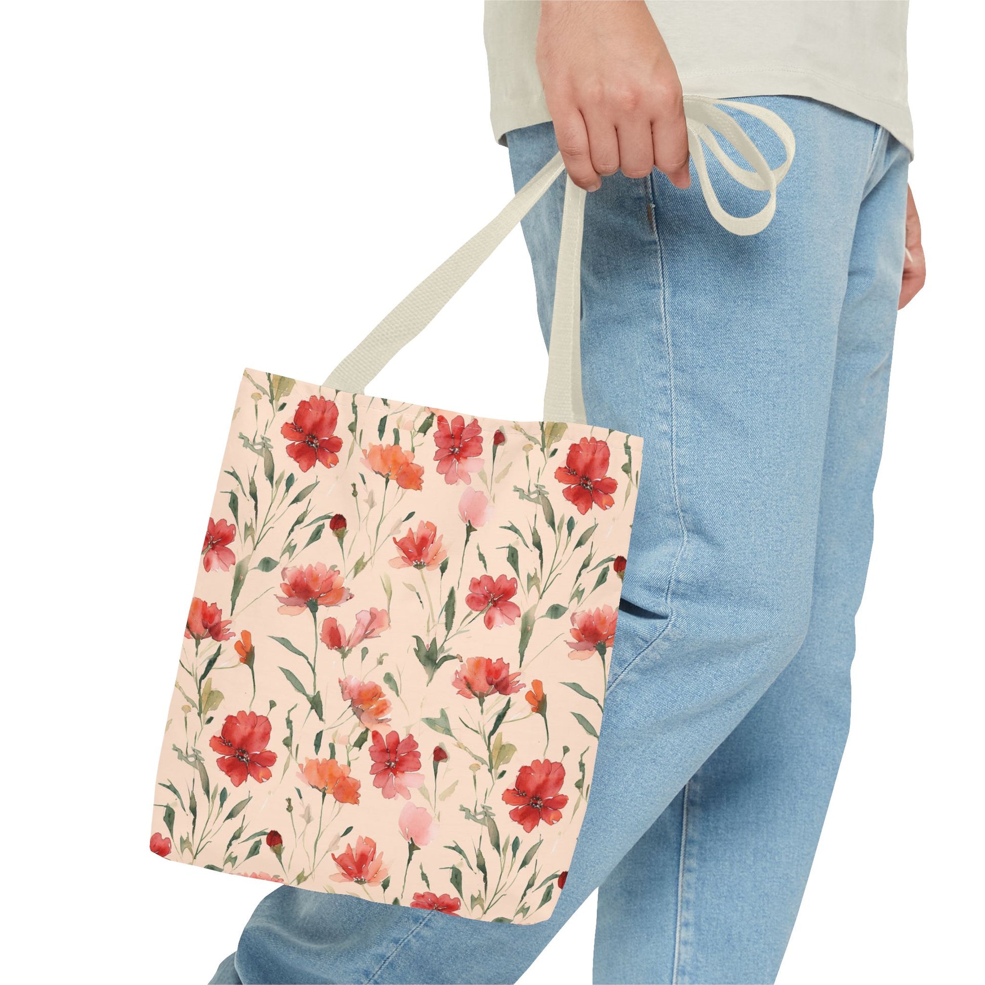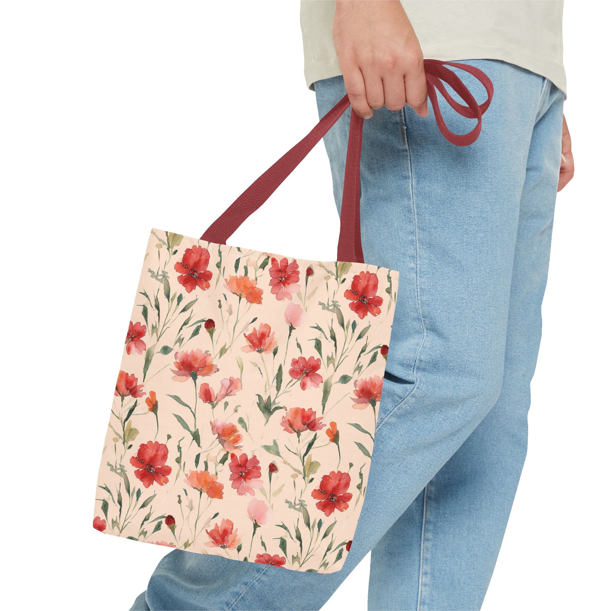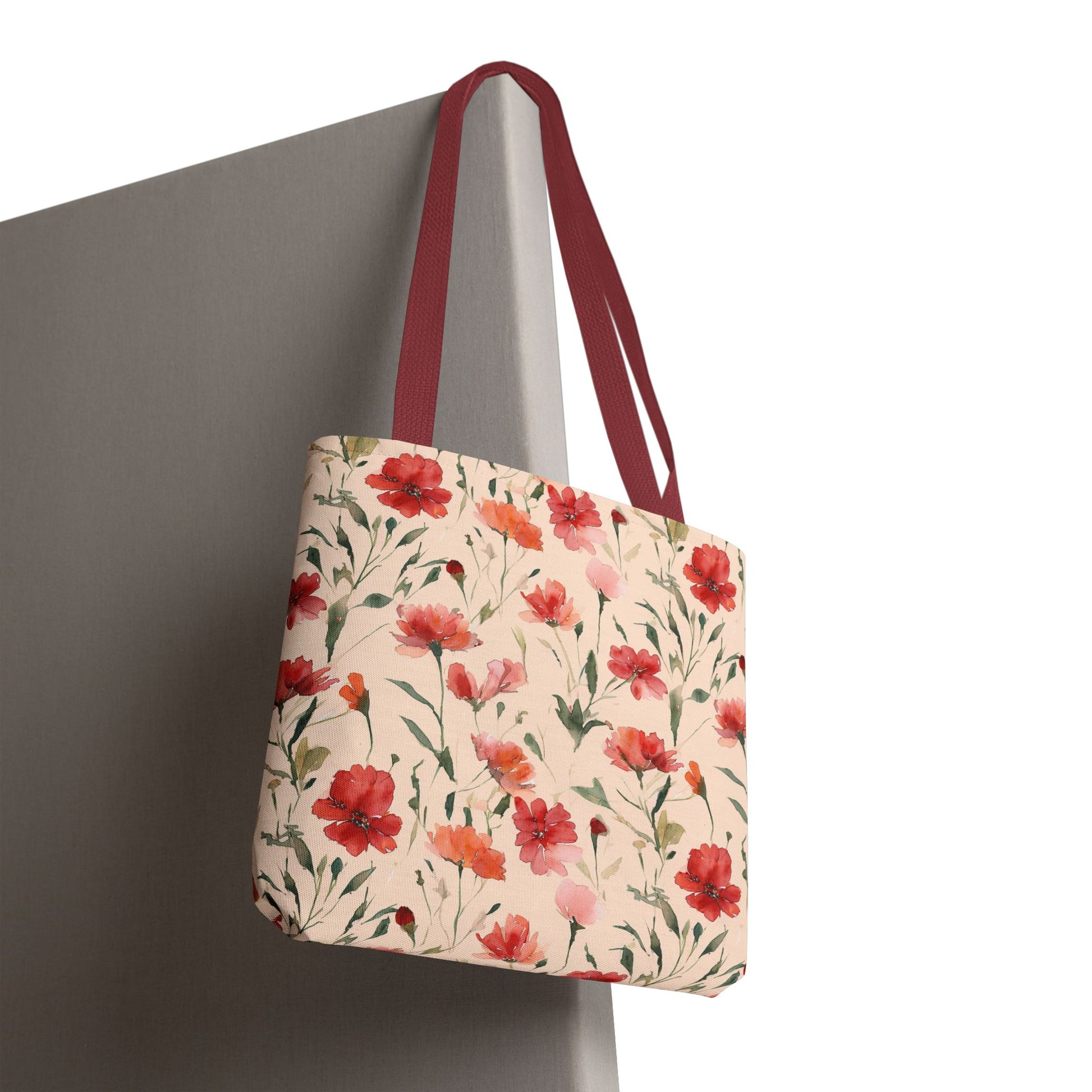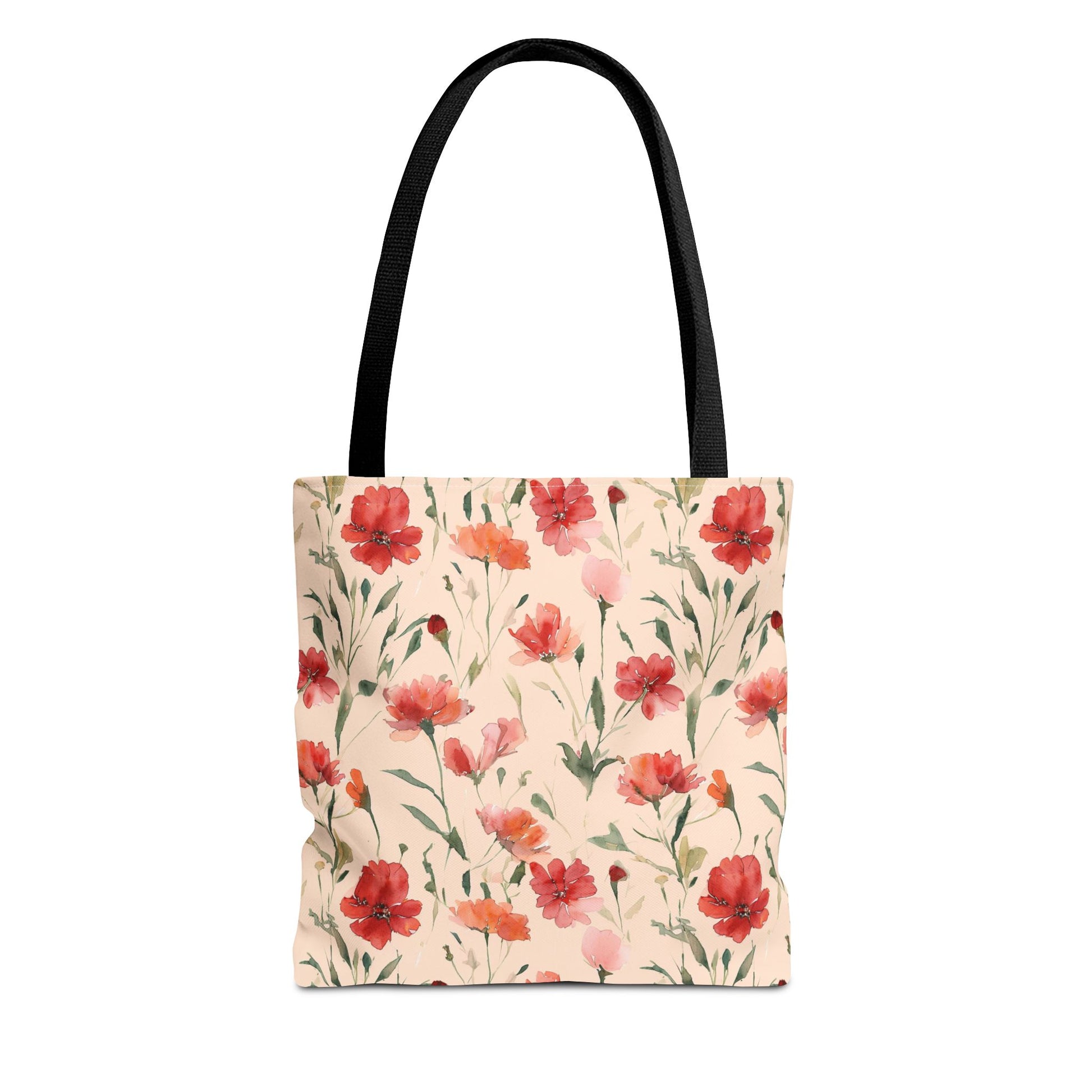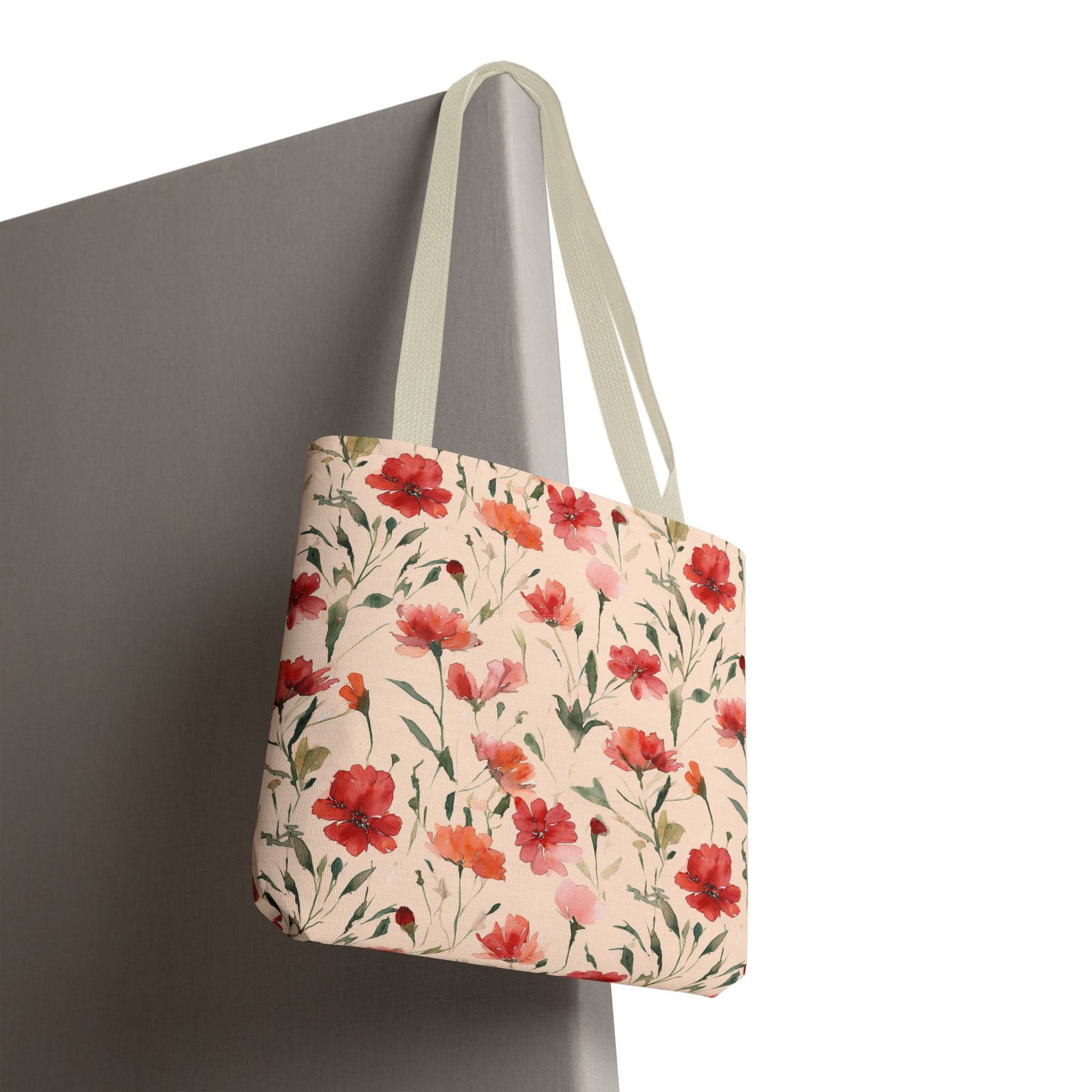 Floral Watercolor Tote Bag — Pink Red Poppy Pattern All-Over Print