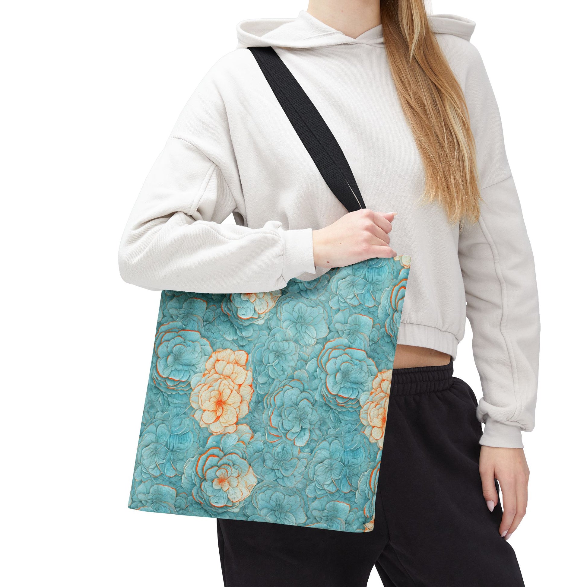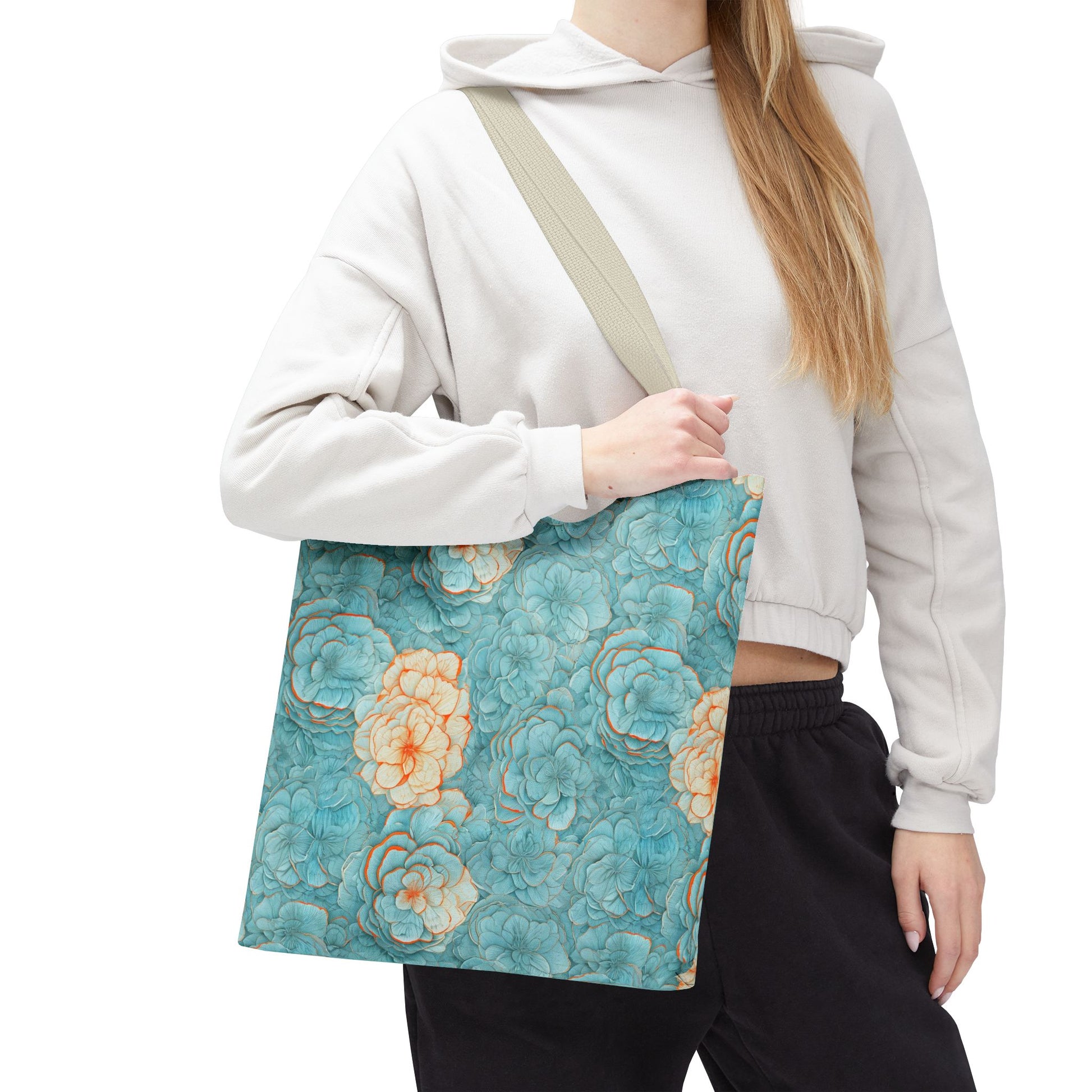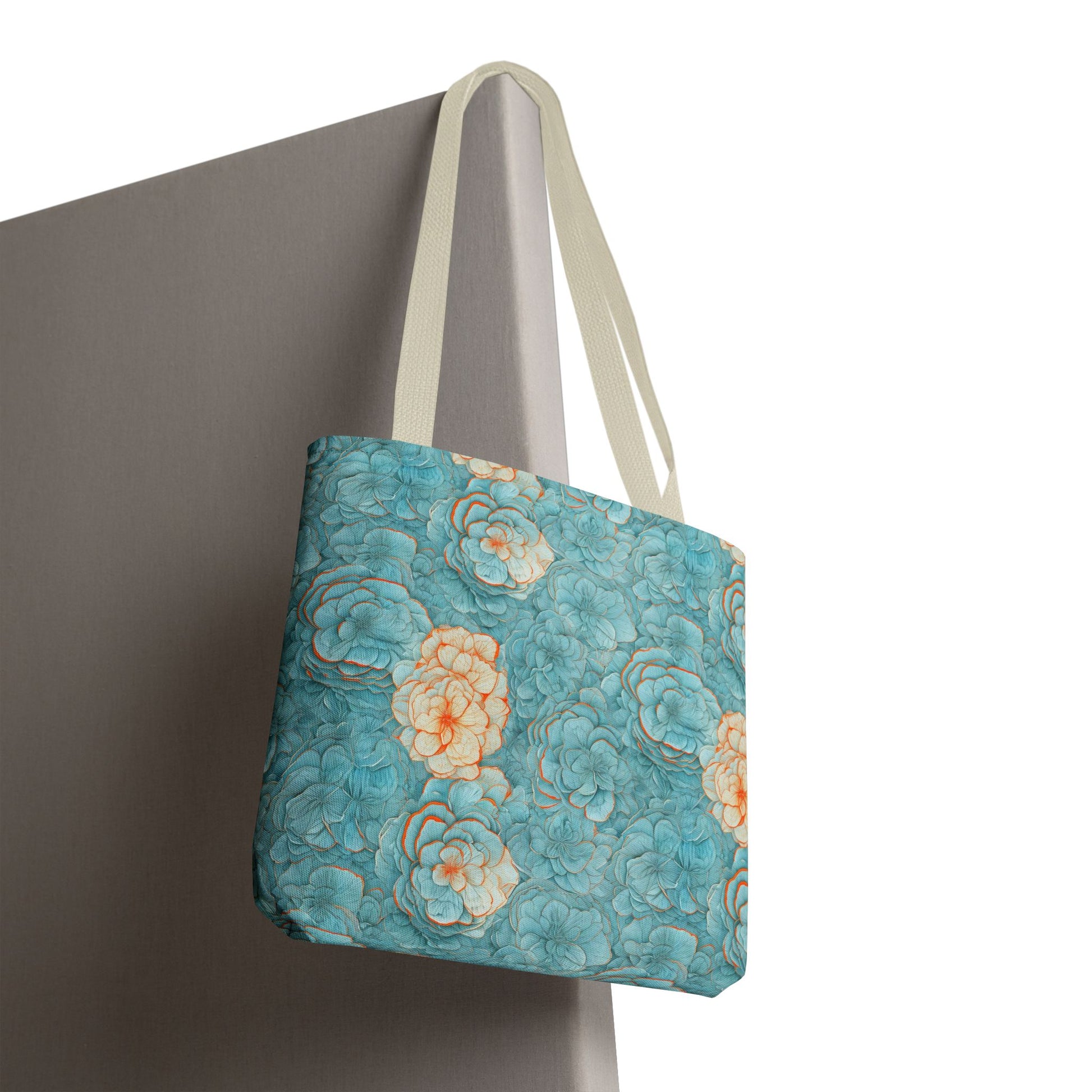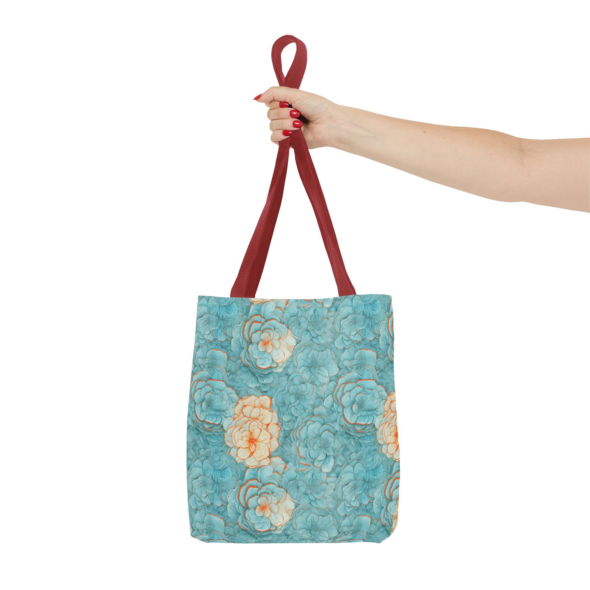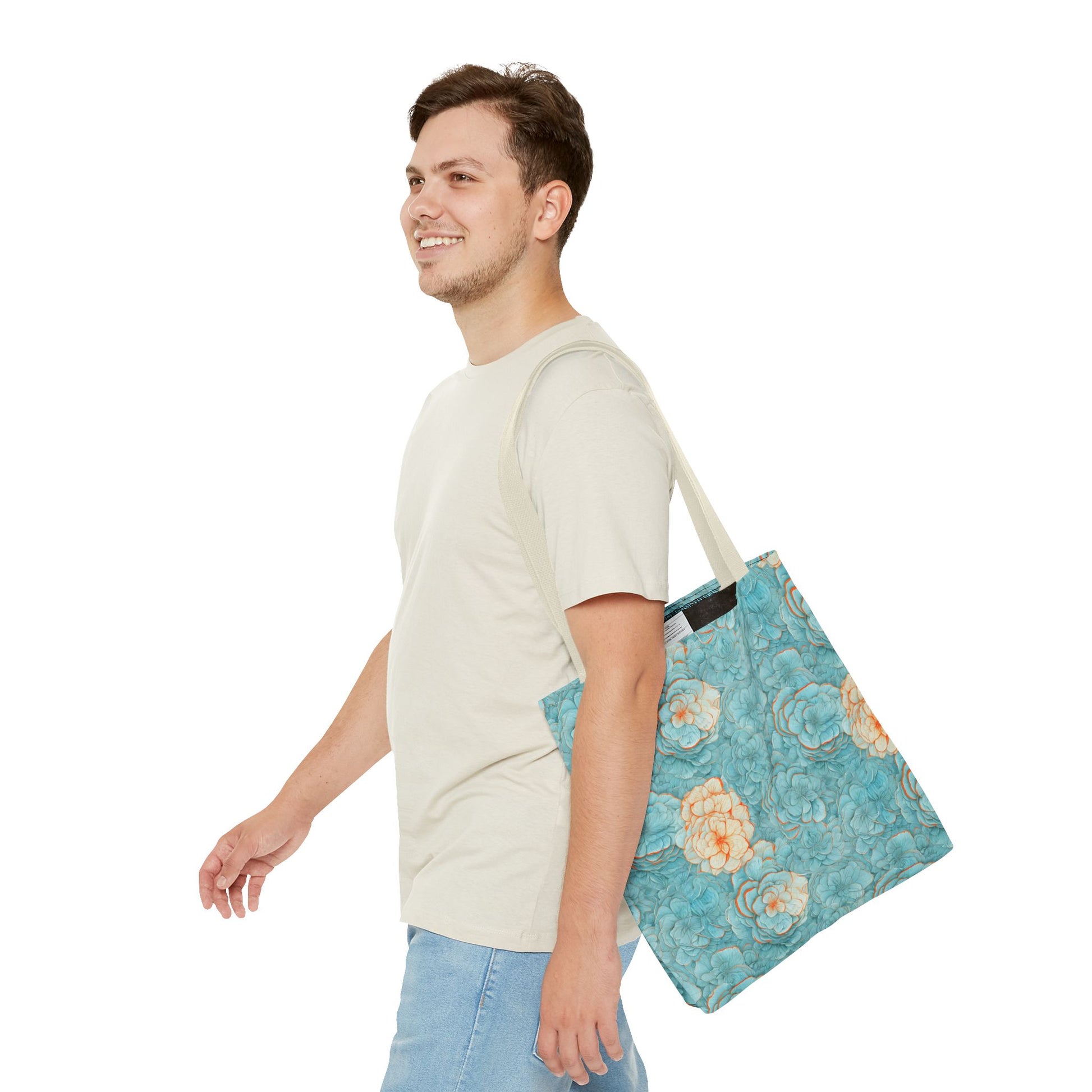 A soft, artful tote that carries a calm, coastal mood. The all-over print shows layered, painterly succulents in sea-glass blues with warm cream accents — it feels like a seaside sketchbook folded into fabric. The lightweight polyester holds the print’s watercolor texture while the boxed corners and reinforced handle stitching give it honest day-to-day strength. Use it to hold market finds, work notebooks, or a light beach bundle; it drapes comfortably from the shoulder and keeps its shape after repeated use. The subtle black inner seams and choice of handle colors let you personalize the look without interrupting the tranquil pattern.