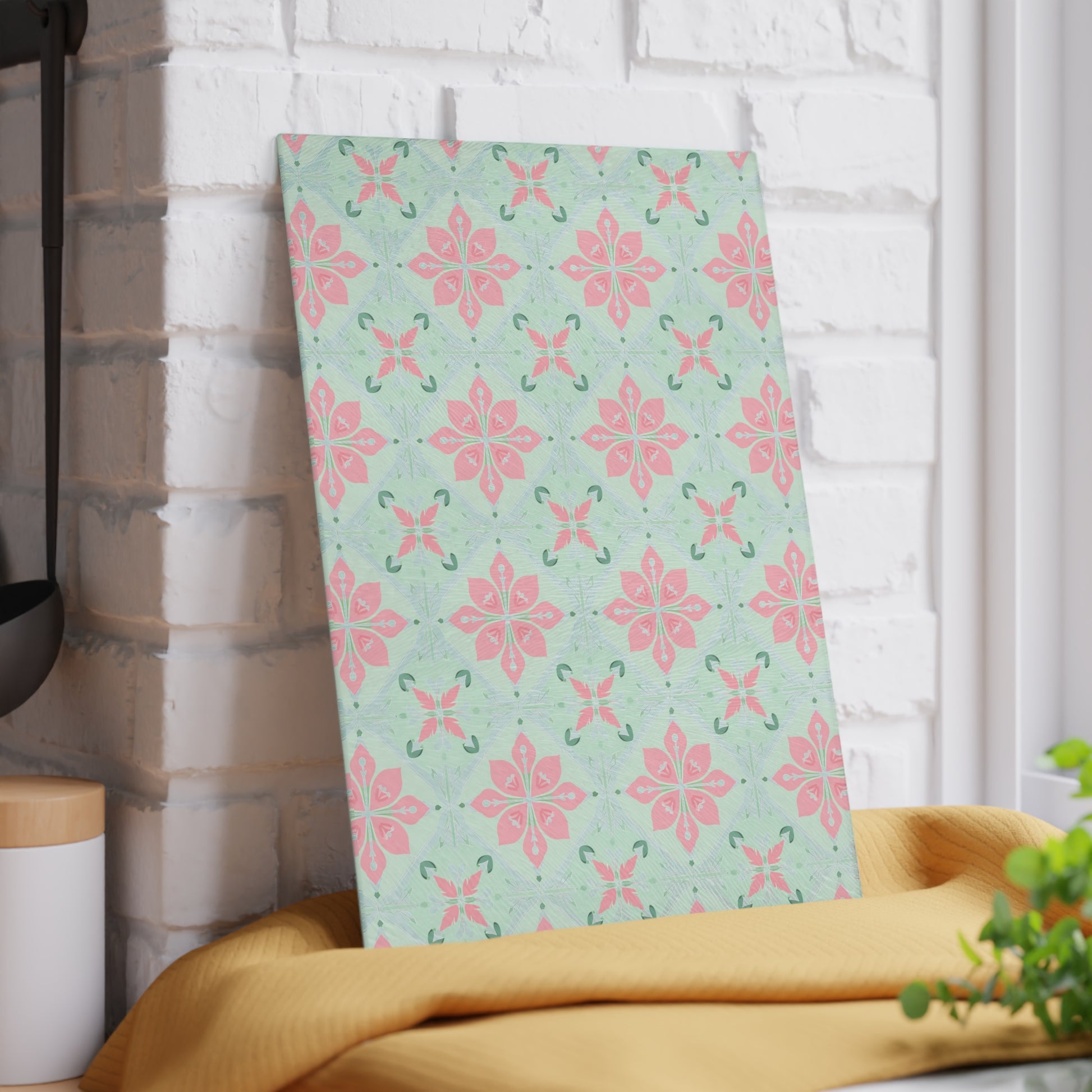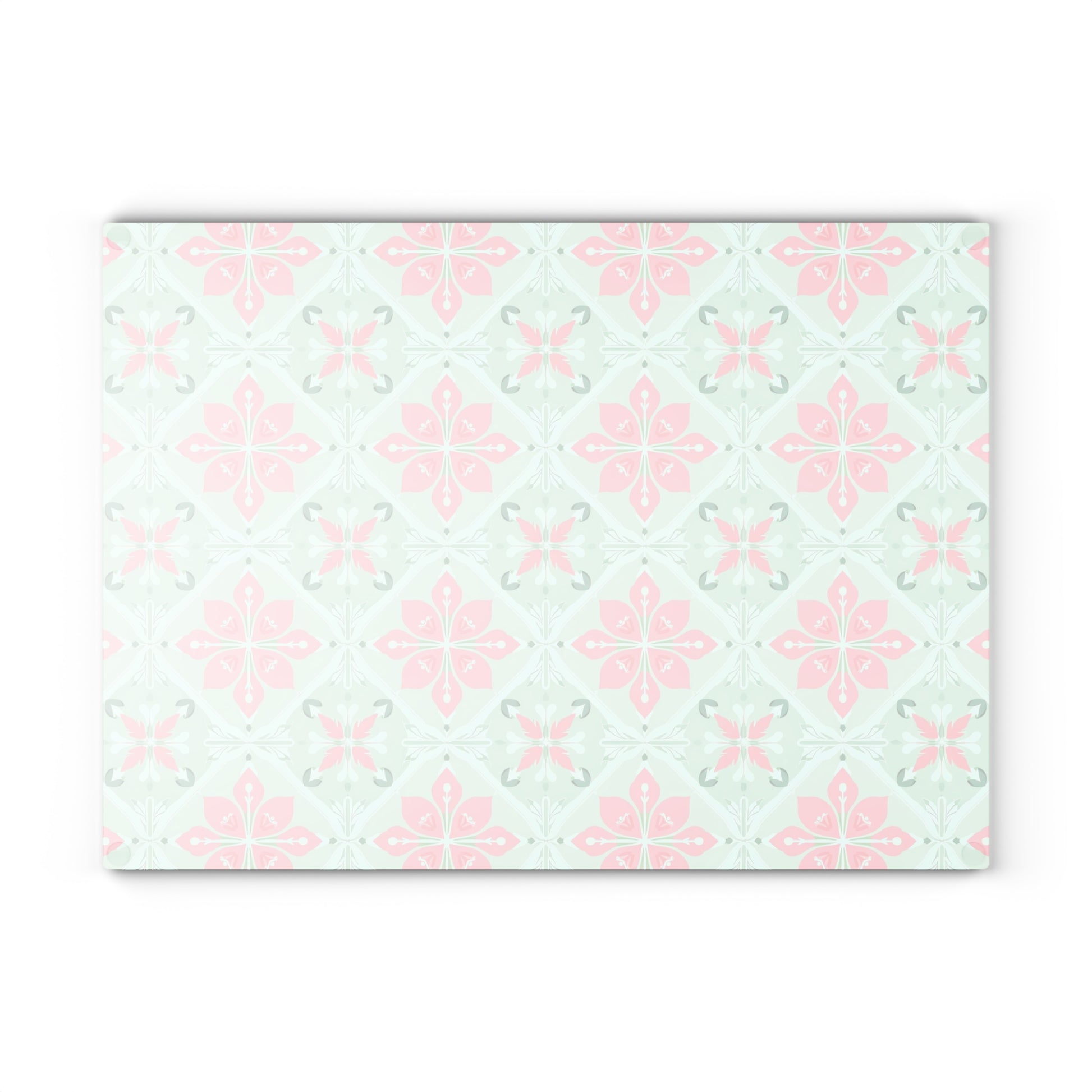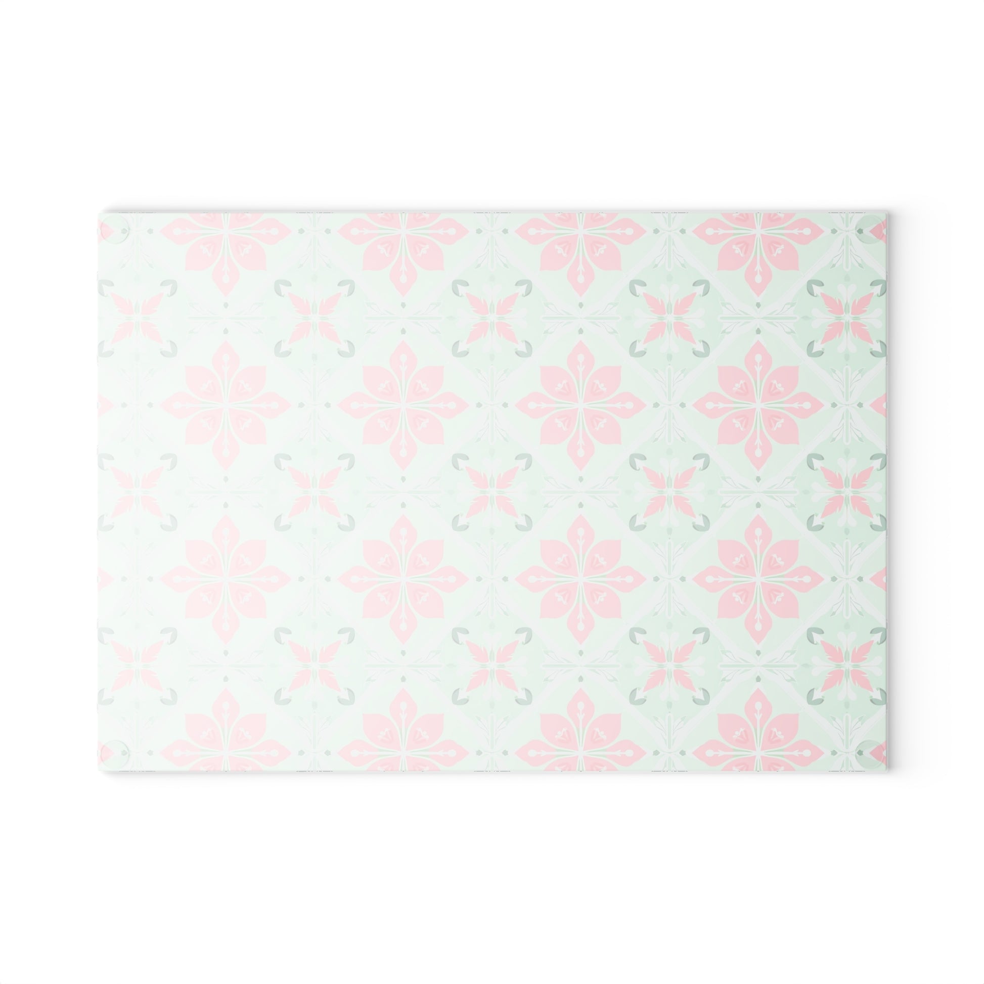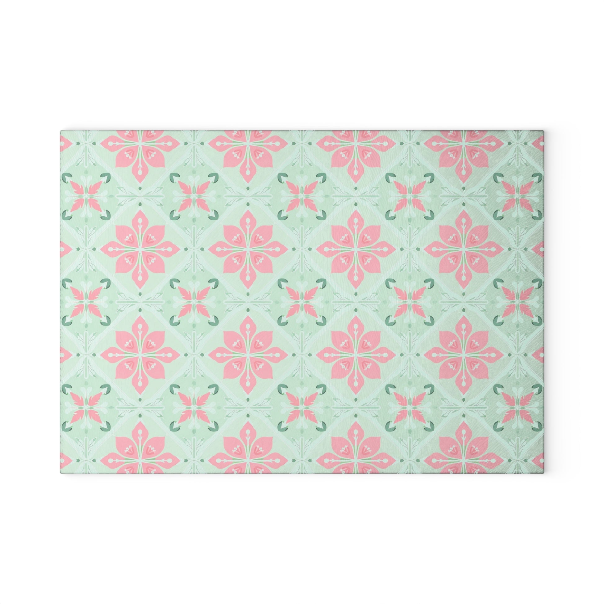 A delicate tempered glass cutting board patterned with soft mint and blush motifs. The textured surface and durable print bring a subtle vintage-meets-modern look to everyday meal prep. Lightweight and nonporous, it stays sanitary and resists stains and odors, while four rubber feet keep it steady on counters. Choose the smaller board for quick prep or the larger size for family meals — both brighten the kitchen with gentle color and an artful tile-inspired design. Hand wash recommended to preserve the vibrant print and finish.