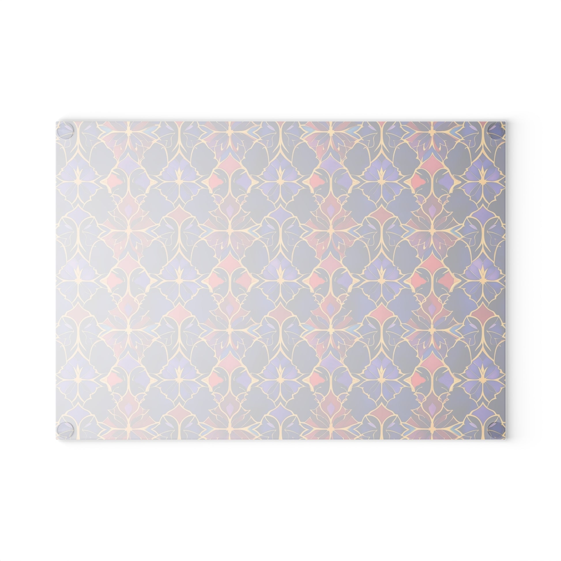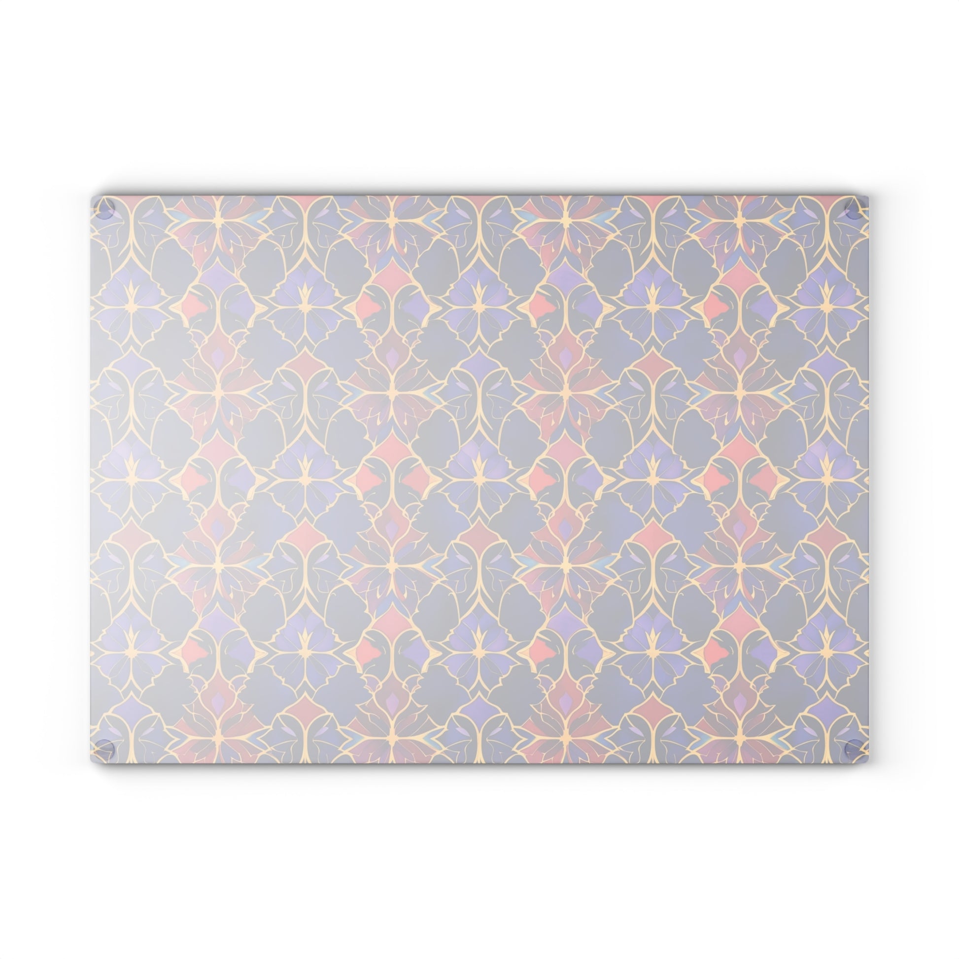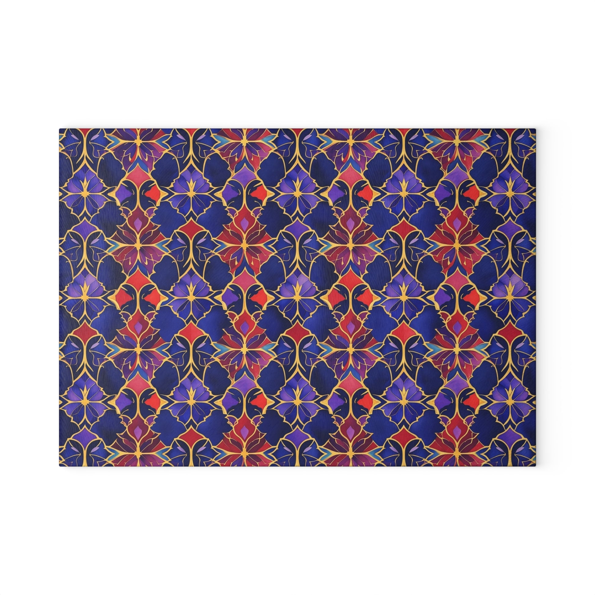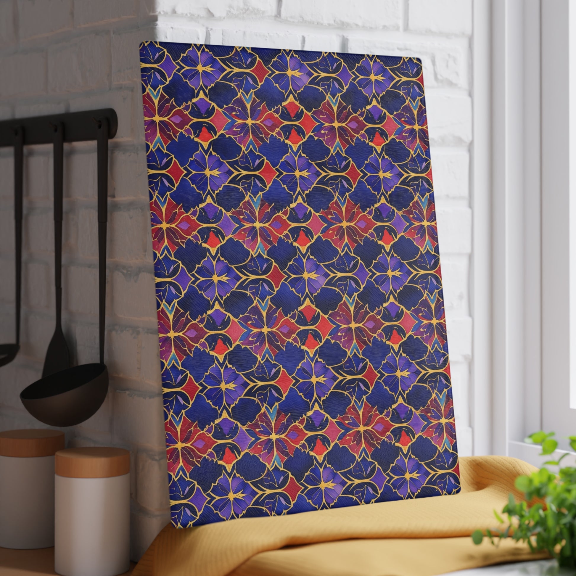 This tempered glass cutting board brings bold, jewel-toned patterning into your kitchen — a lively mosaic of deep purples, ruby reds, and fine golden lines that catch the light. It’s slim and stable, with a textured surface and four rubber feet that keep it anchored while you slice, chop, and serve. The durable print is bonded into the glass so the design stays vivid even with regular use. Choose the smaller board for quick prep or the larger size for sprawling charcuterie spreads. Hand-wash to preserve the colors and finish.