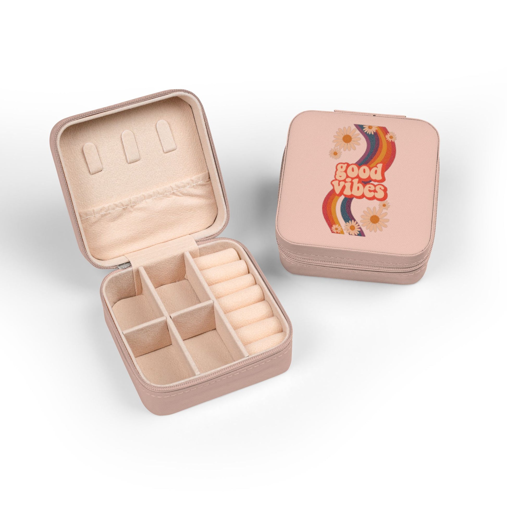 A compact, travel-ready jewelry case designed to keep delicate pieces safe and beautifully organized on the go. The soft PU leather exterior and plush interior cradle rings, studs, necklaces, and bracelets without scratching. Inside, divided compartments, ring rolls and necklace hooks create a tidy system so everything stays in place during transit. The square zip-around design closes securely, and the small footprint slips easily into a purse or carry-on. The cheerful retro “good vibes” motif and UV-printed decoration add personality while the durable construction stands up to frequent travel.