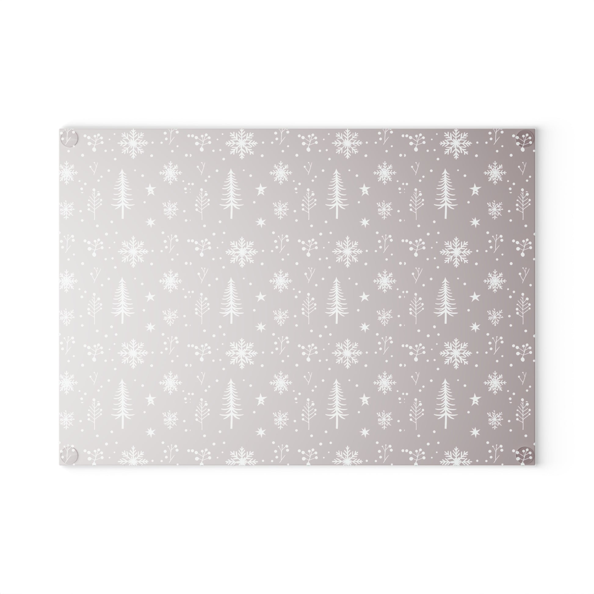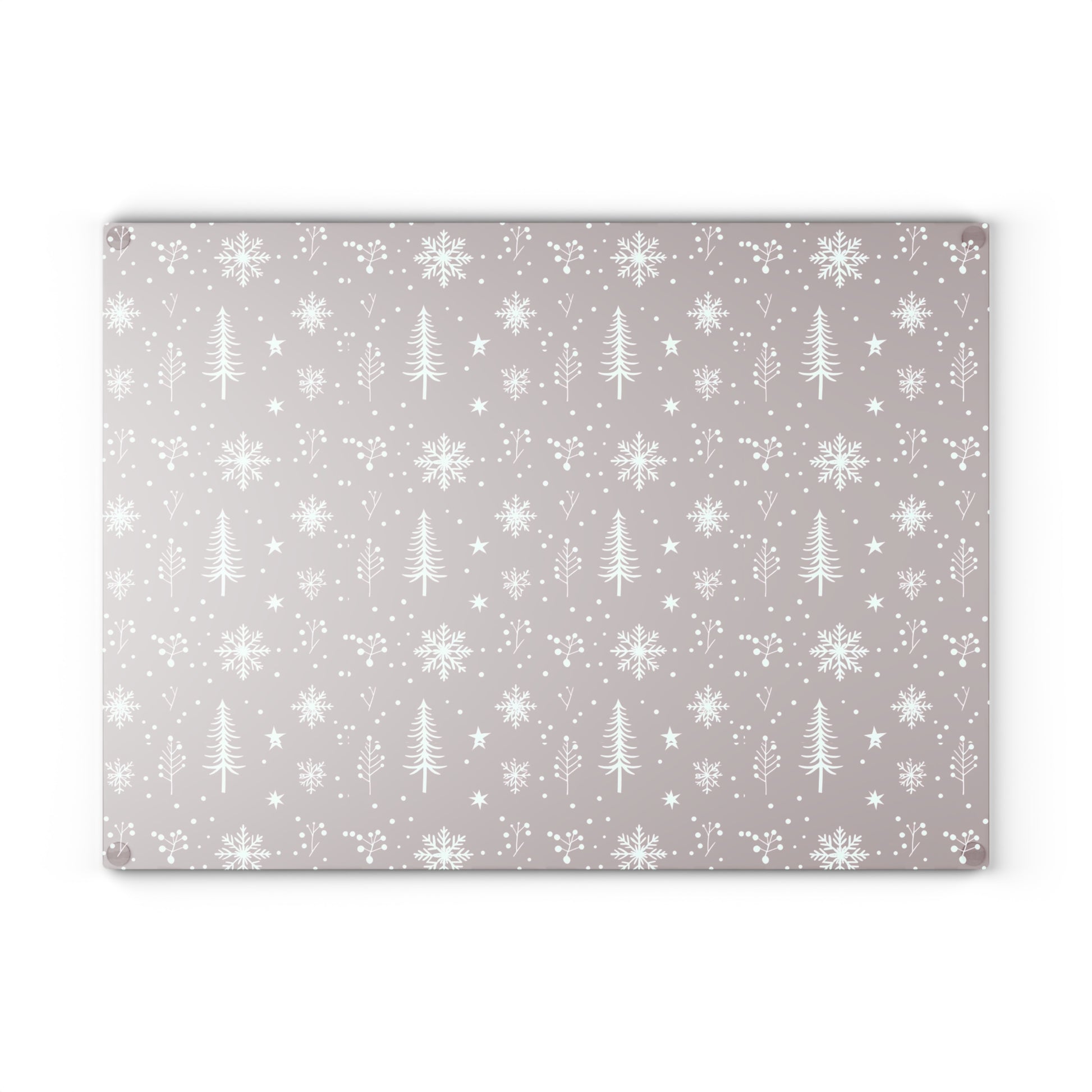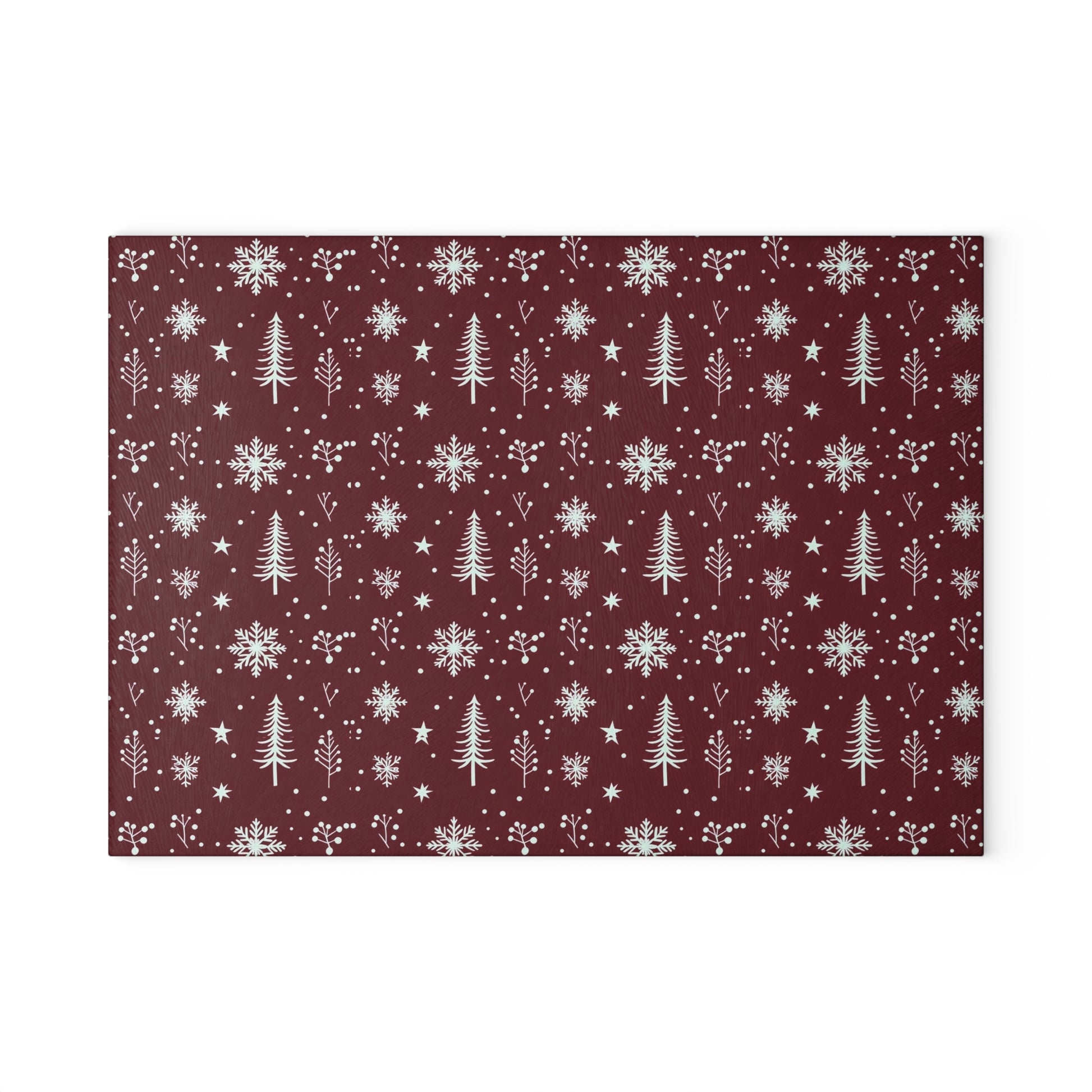 Give your kitchen a quiet, wintry charm with this tempered glass cutting board. The delicate repeat pattern of evergreen silhouettes and snowflakes rests on a warm burgundy field, bringing a calm, seasonal mood to counters and prep stations. The textured, tempered surface handles chopping and slicing while keeping colors crisp beneath the print. Small rubber feet keep the board steady on tile or wood. It washes up easily by hand and doubles as a pretty serving or cheese board when guests arrive. Bring a gentle, Nordic-inspired accent to holiday meals and cozy nights in.