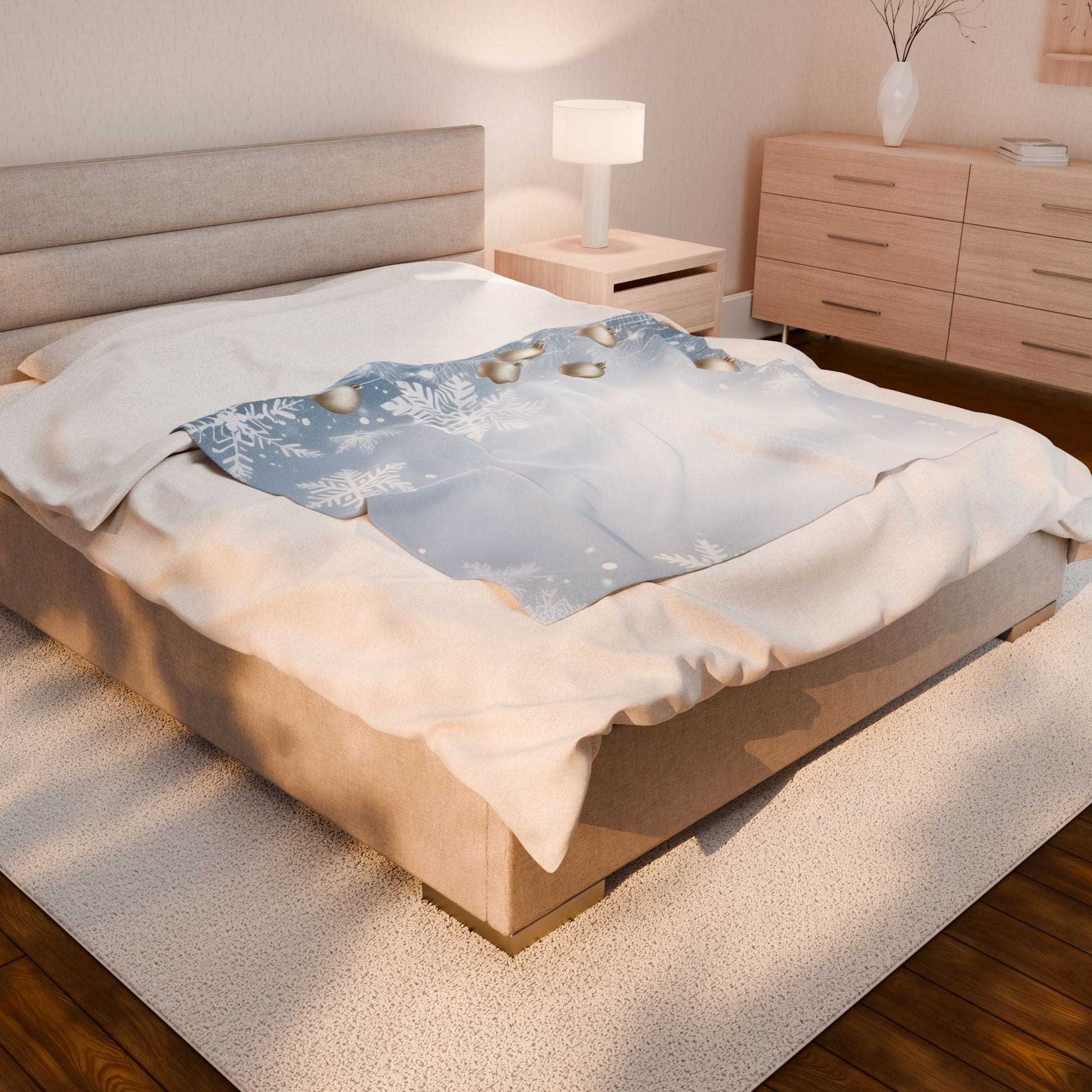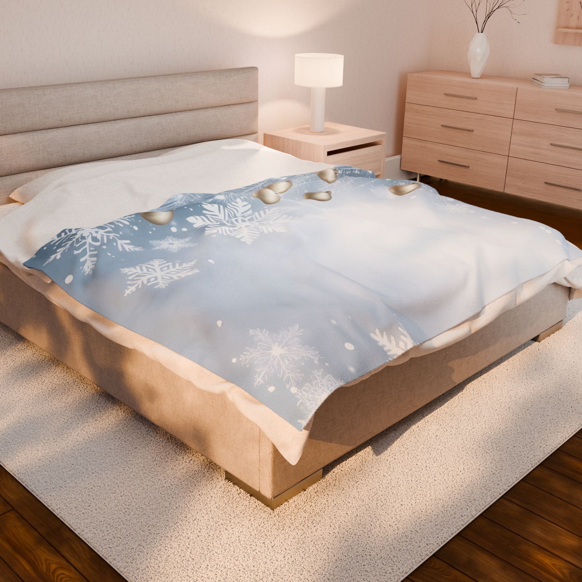 This plush velveteen blanket wraps you in a soft, wintry hush. Frosted snowflakes drift across a pale blue field while satin gold ornaments hang like quiet memories along the edge. The fabric is plush and slightly weighted, giving a cozy, comforting drape that invites slow evenings with a mug and a book. It settles easily across laps or couches, bringing a subtle, elegant holiday mood without shouting. Use it to soften chilly mornings, add layered texture to your living room, or bring a calm, seasonal touch to holiday gatherings.
