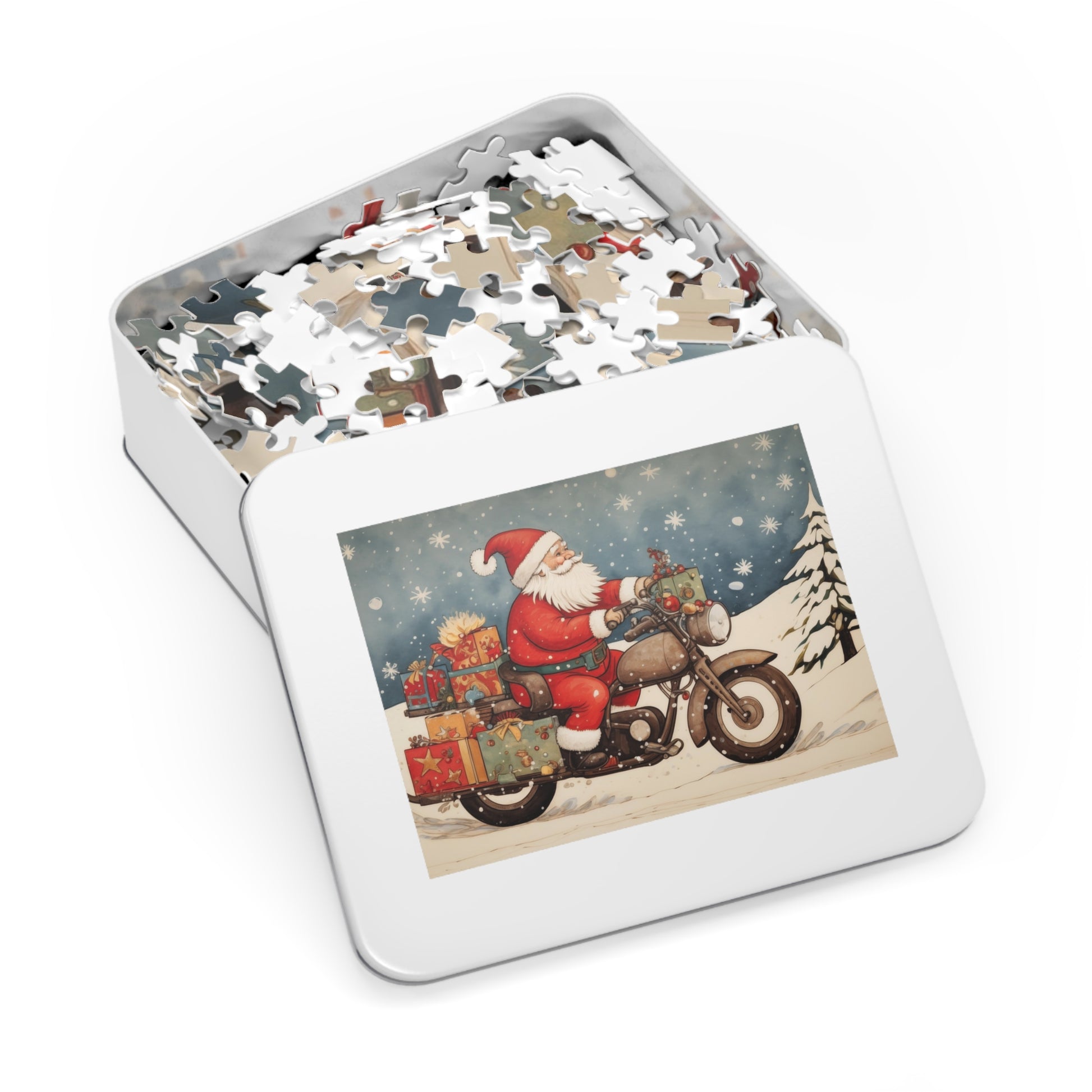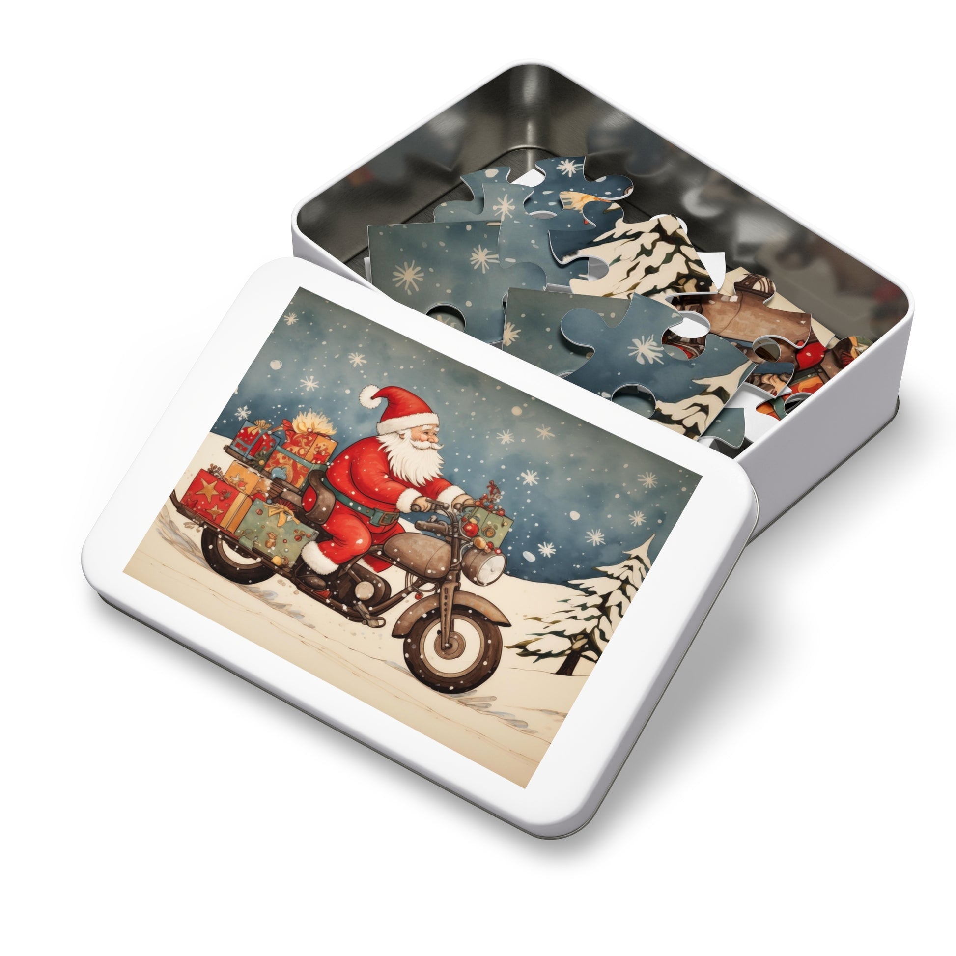 .: Custom puzzle made with pre-die-cut chipboard .: Glossy finish .: 30, 110, 252, 500, 1000, or 2000 precise-interlocking pieces .: Uniformly cut non-edge pieces .: Comes in a white metal tin box .: Finished image on the tin box cover .: Please note: The puzzle box features a full-bleed design, while elements outside the safe area on the puzzle itself may be cut off