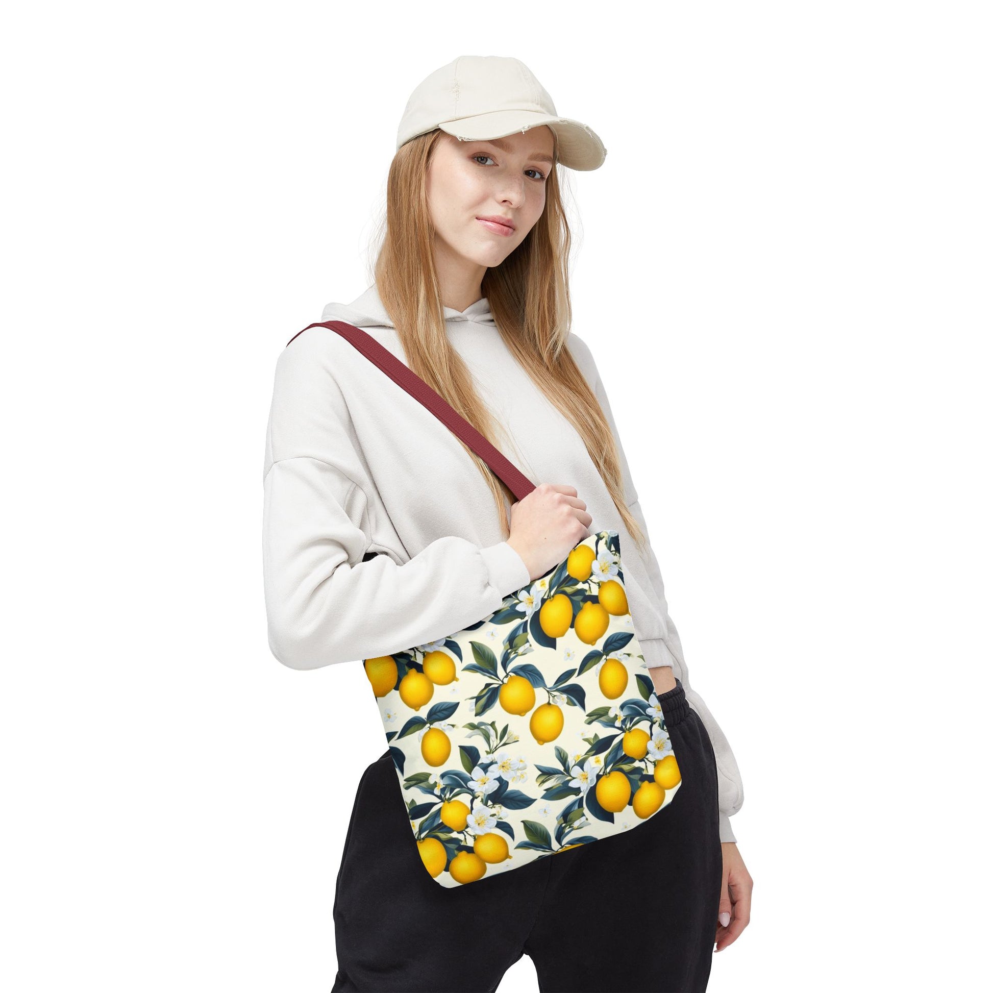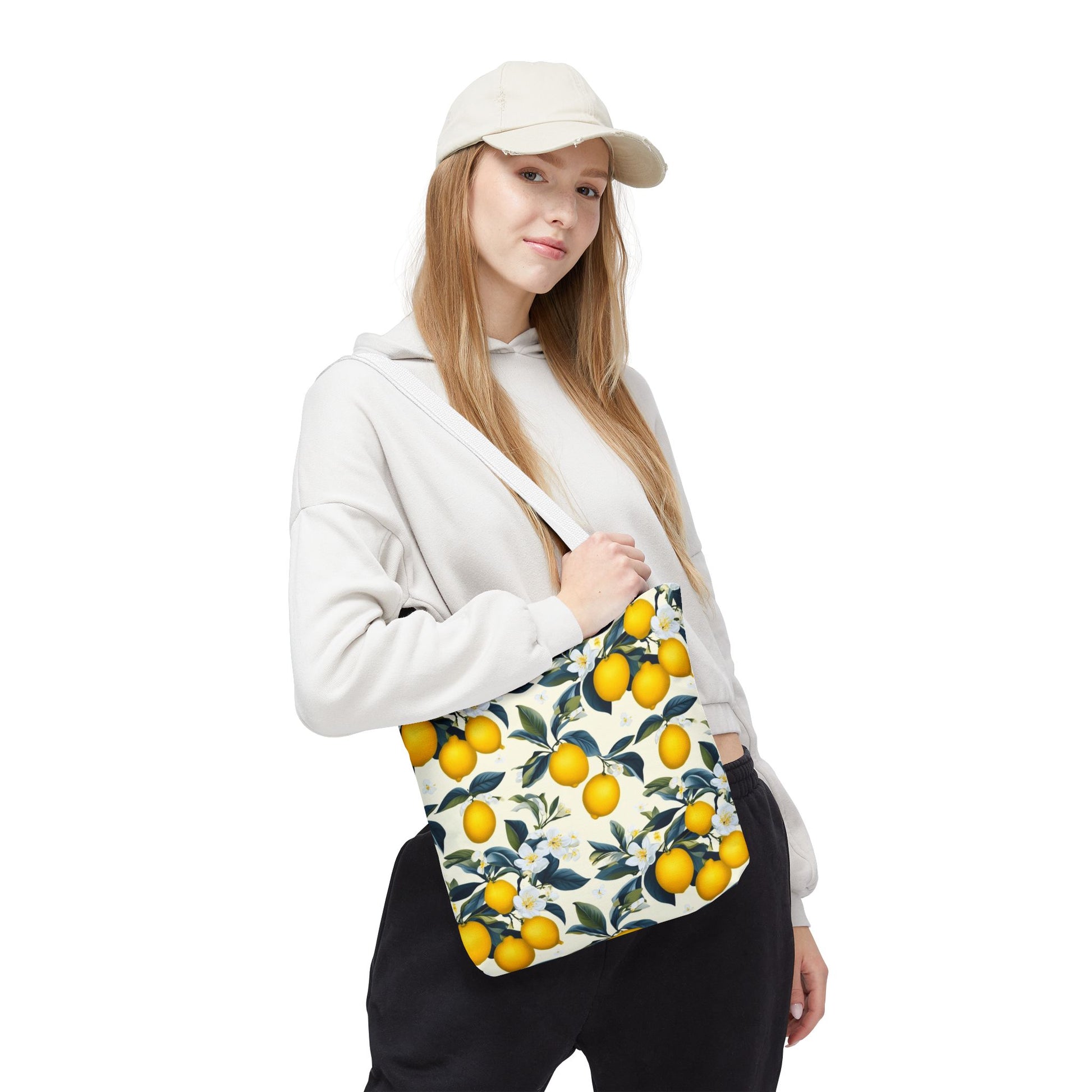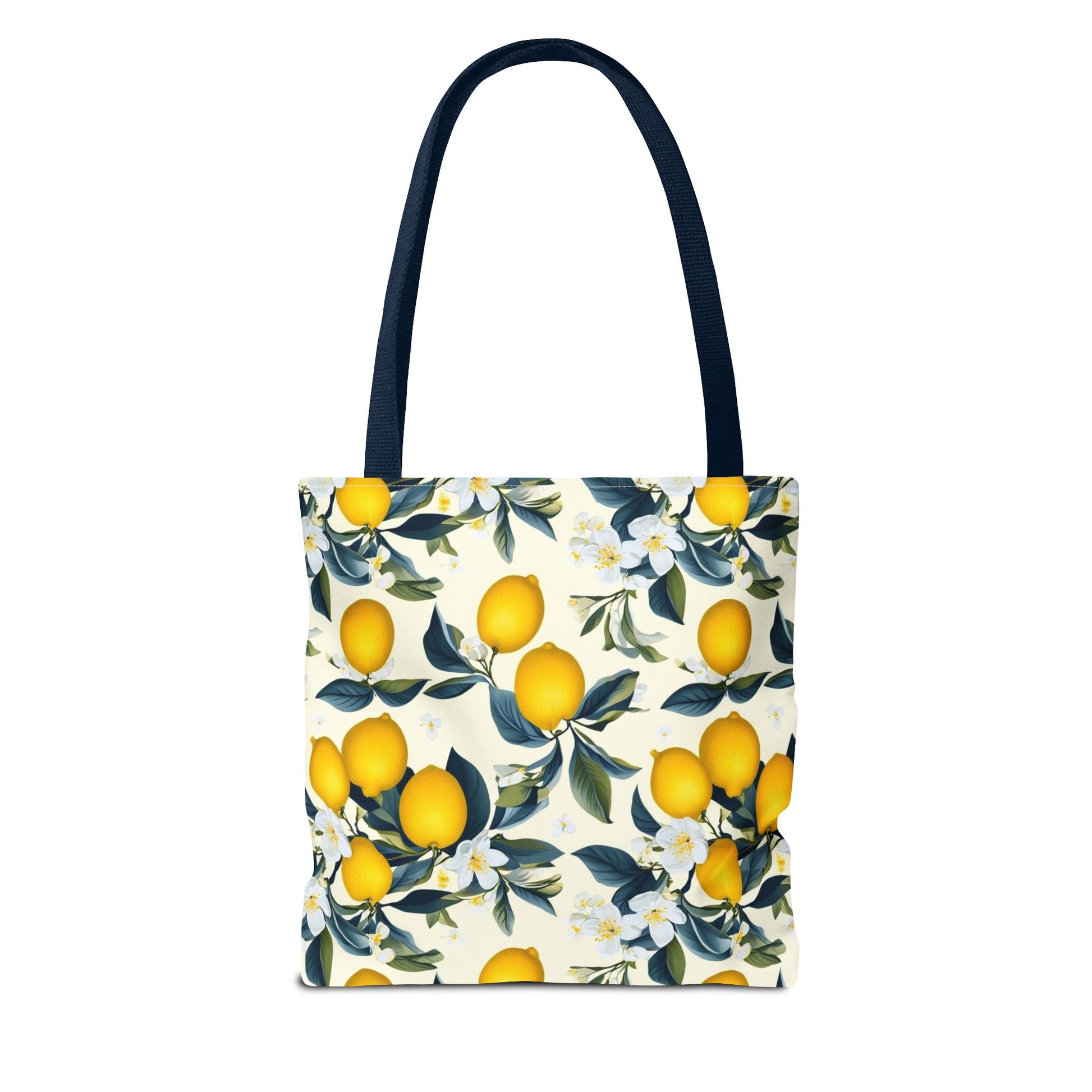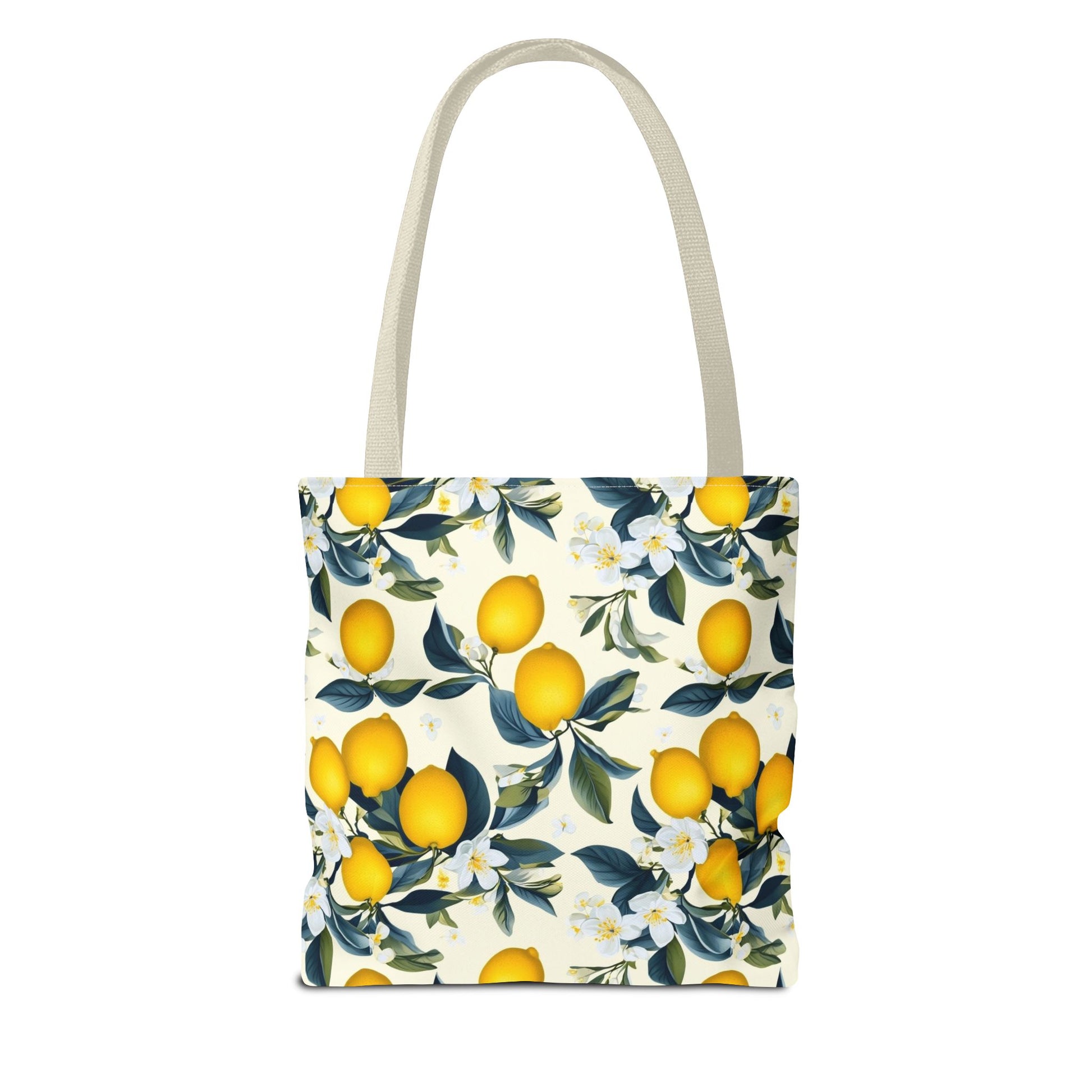 Bright, sun-warmed citrus prints bring a fresh, hand-painted charm to everyday carry. This sturdy polyester tote holds its shape while staying lightweight — roomy boxed corners add usable space and reinforced handles stand up to repeated use. The lemon-and-blossom pattern pops against a soft cream background, turning grocery runs, market strolls, or library stops into small moments of joy. Choose a handle color to match your mood and pick the size that fits your routine. Simple to care for and quick-drying, this tote becomes the go-to companion when you want a splash of color and dependable performance.