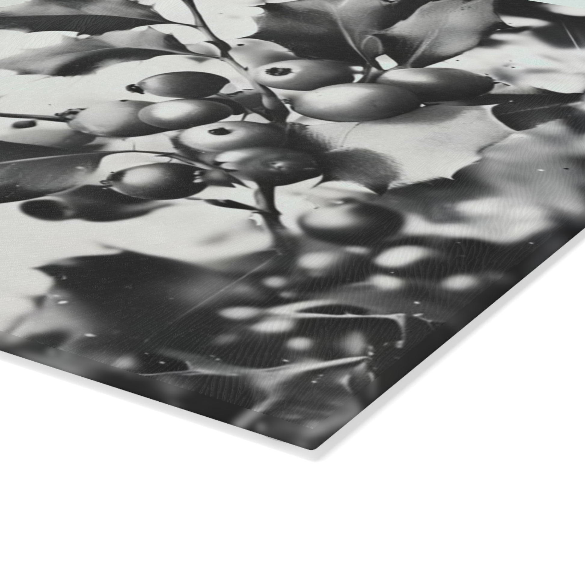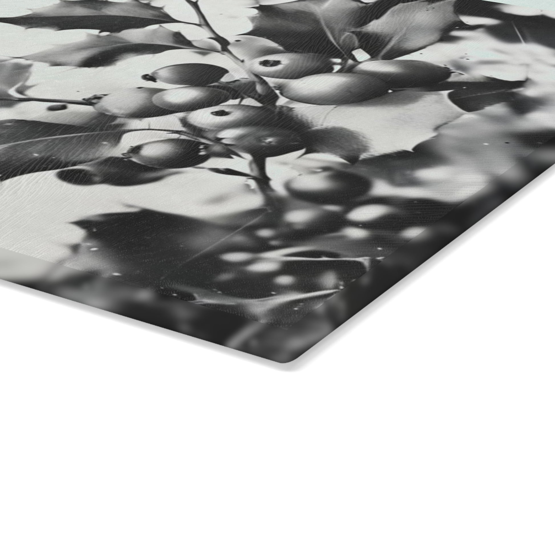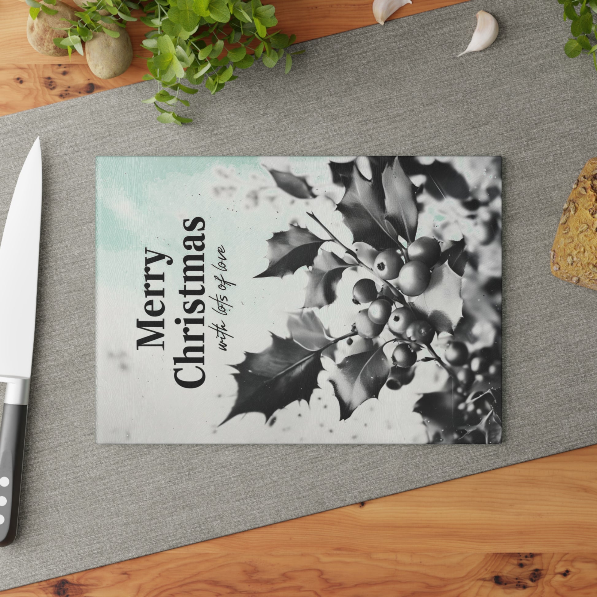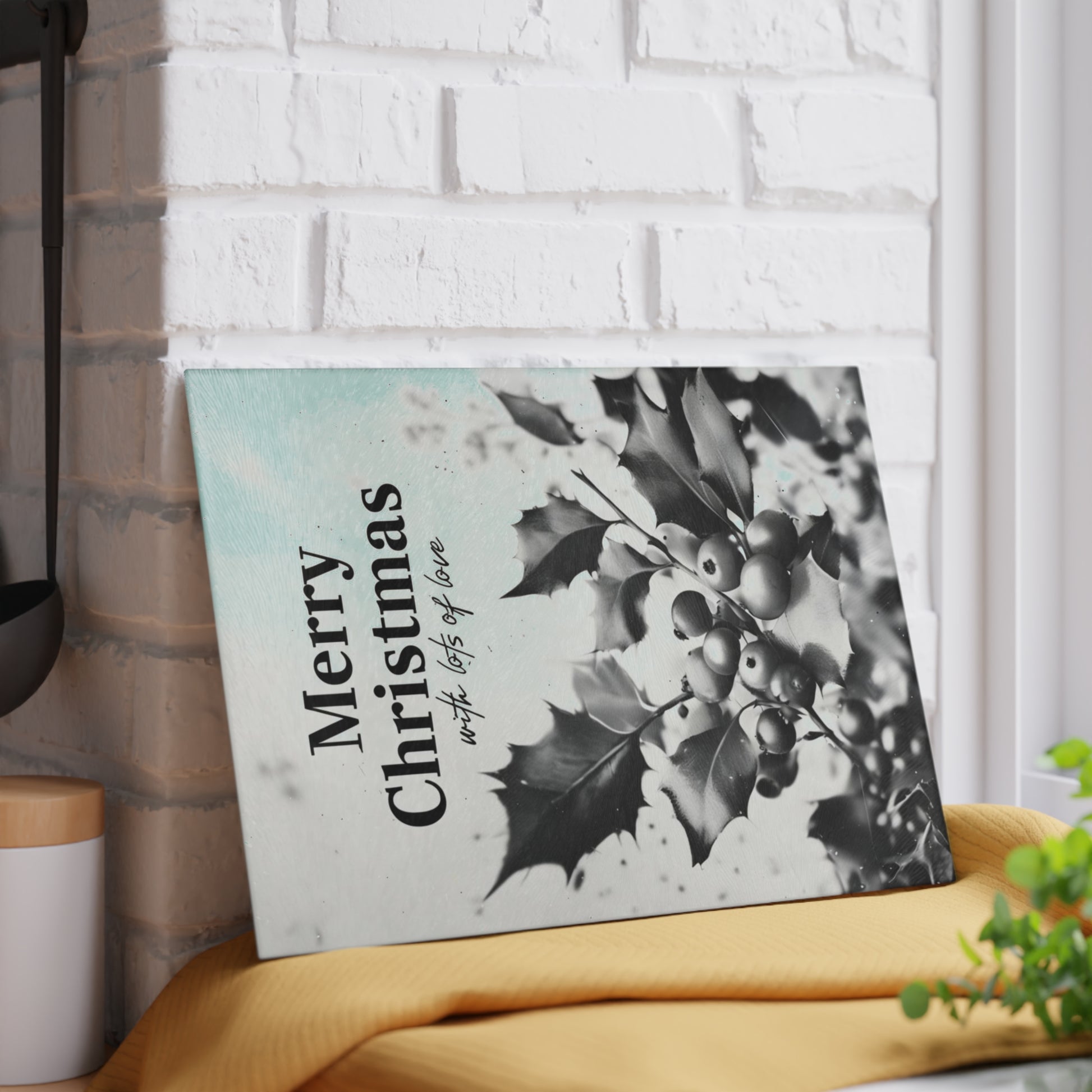Bring a quiet, classic holiday mood to your kitchen with this tempered glass cutting board. A soft monochrome holly illustration and gentle “Merry Christmas” lettering create a calm, slightly vintage atmosphere that sits well on counters or by the stove. The textured tempered glass surface feels clean and sturdy under a knife, while vibrant printing keeps the artwork crisp through everyday use. Four small rubber feet hold the board steady on countertops, and the low-maintenance finish wipes clean easily — hand wash recommended to preserve the print. Choose the smaller board for quick prep and serving, or the larger size when you want extra workspace or a festive serving surface for cookies or cheeses.
