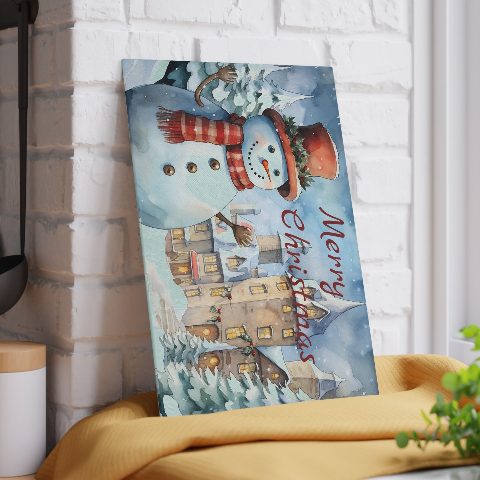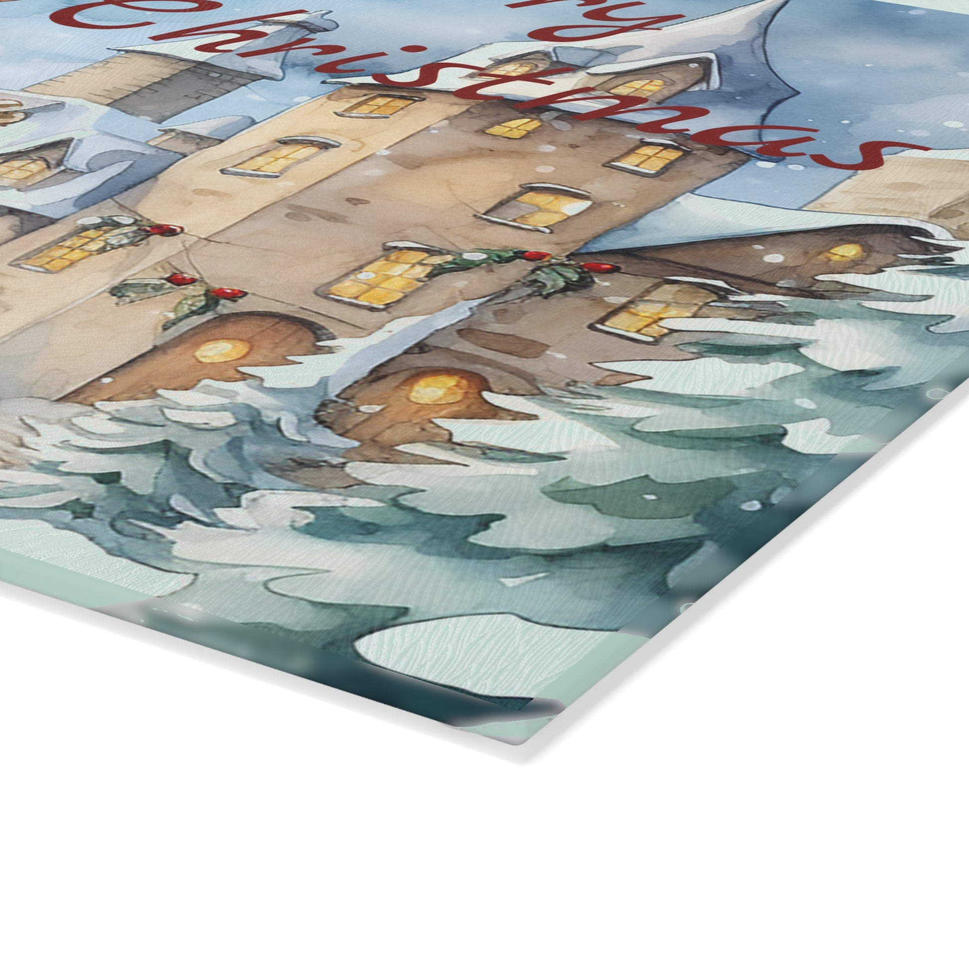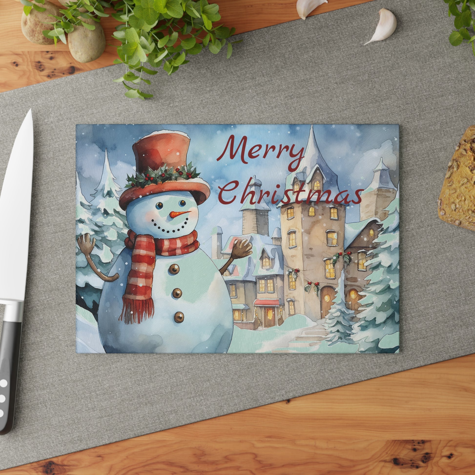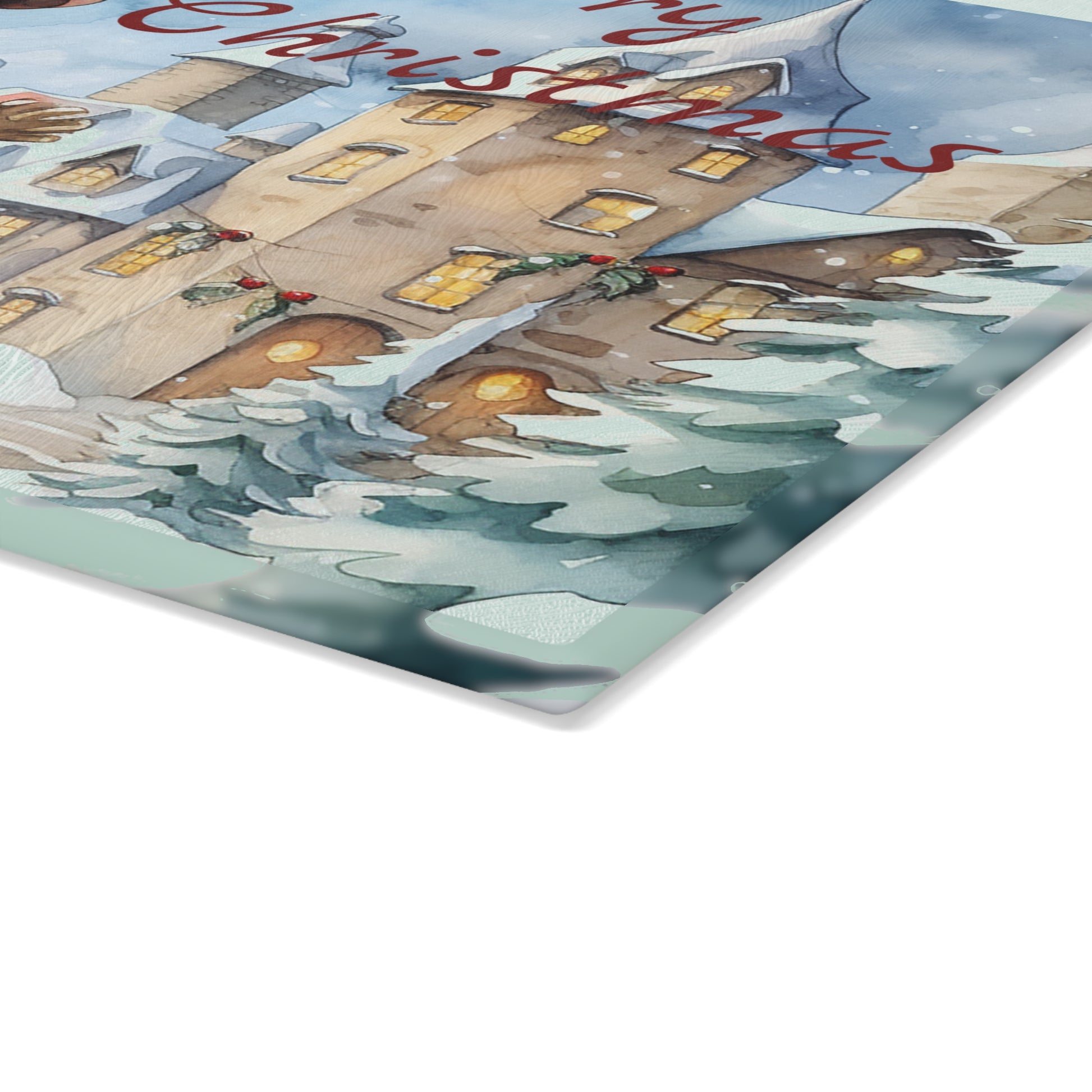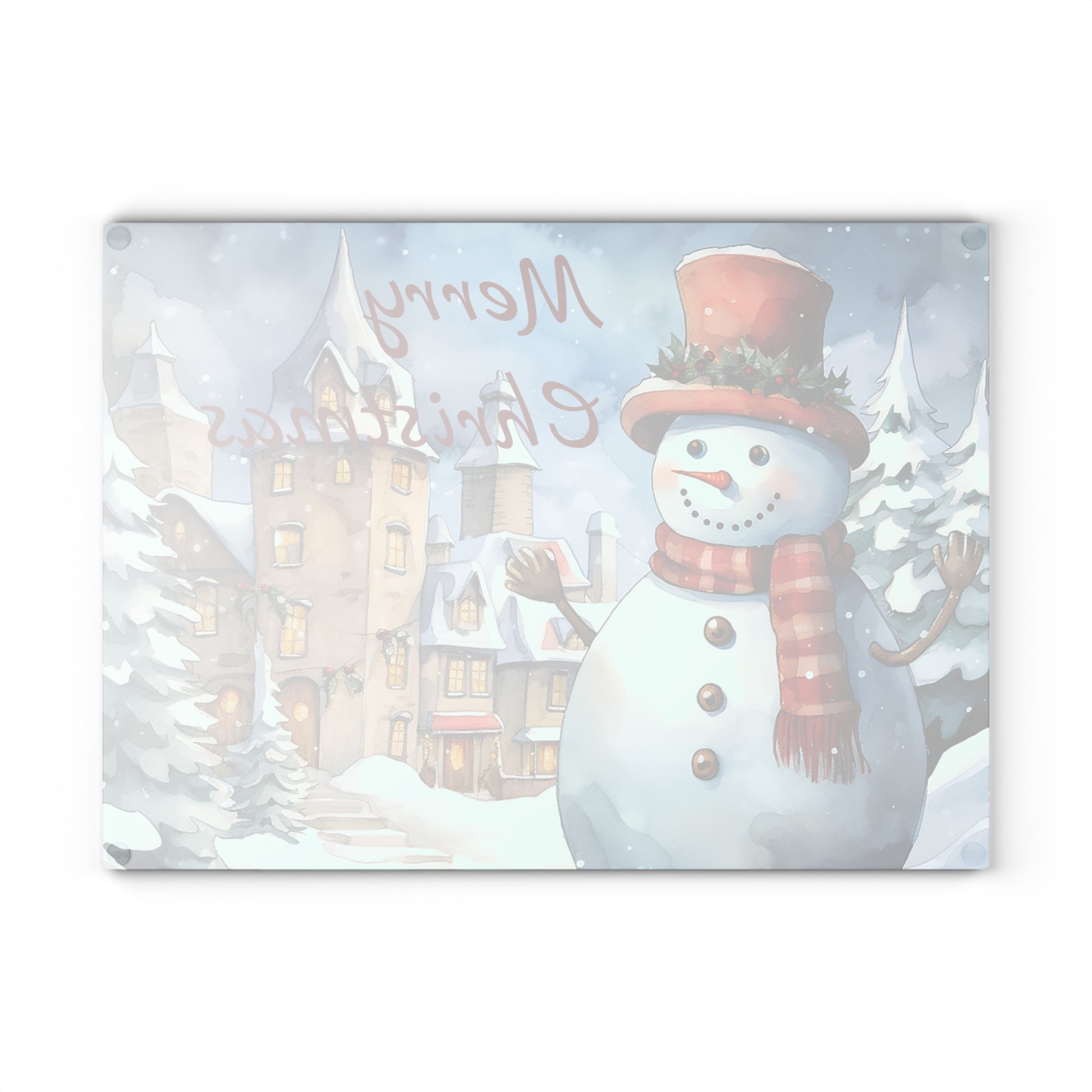 Bring a touch of cozy holiday magic to your kitchen with this tempered glass cutting board. A cheerful snowman stands before a softly lit village, snow-dusted evergreens framing a warm, nostalgic winter scene. The textured, sanitary glass surface resists stains and odors while the vivid, scratch-resistant print keeps the art looking fresh through everyday use. Small rubber feet hold the board steady on counters, so it works well for light prep or serving cookies and cheeses during festive gatherings. Hand-wash care preserves the colors and finish, keeping this piece ready to brighten holiday mornings and quiet evenings by the fire.