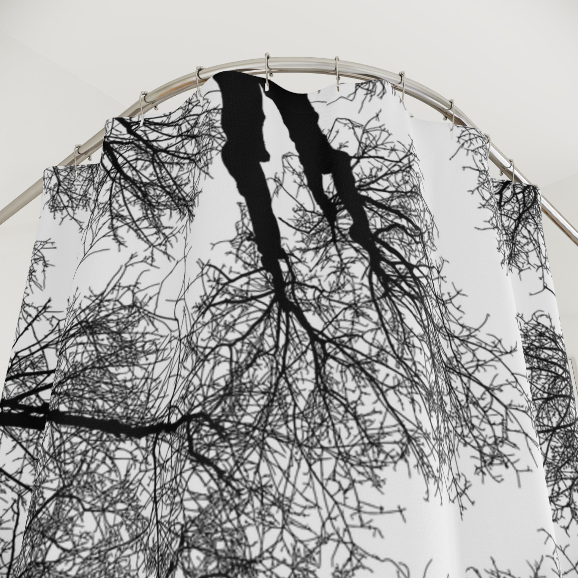 Monochrome Bare Trees Shower Curtain — Black & White Forest Canopy Bathroom Decor