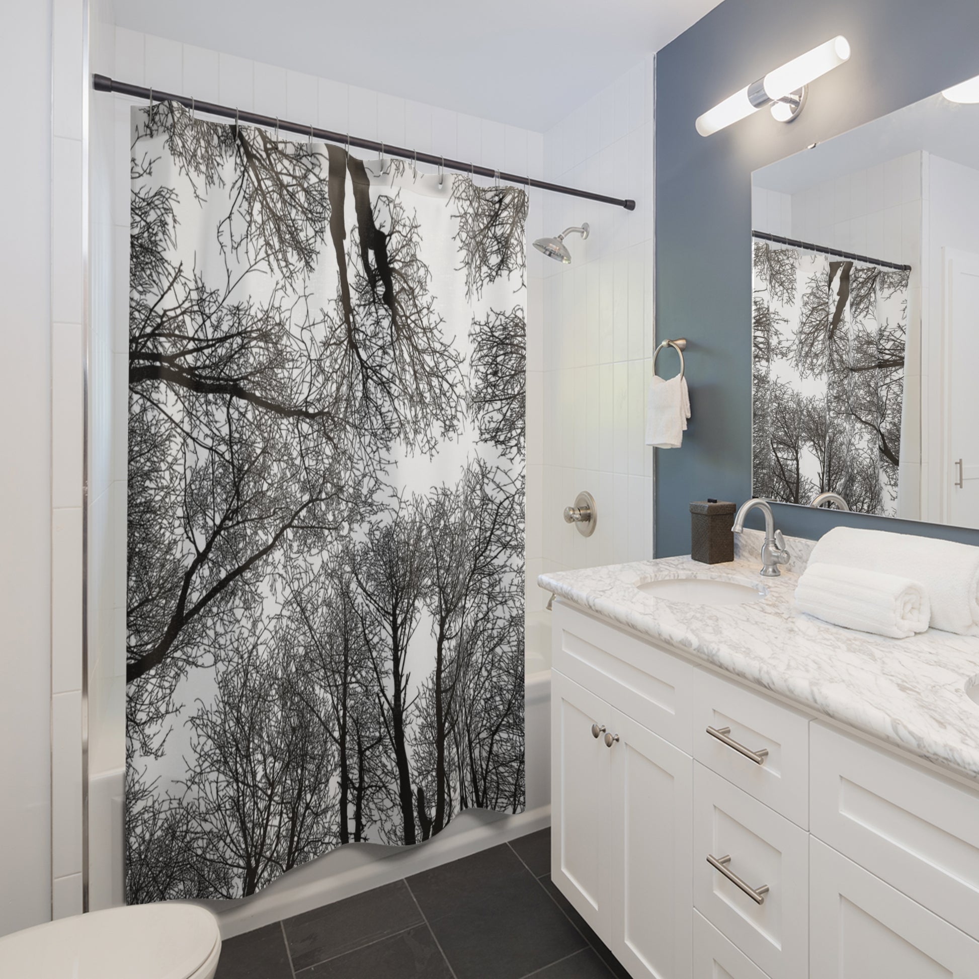 A moody, atmospheric shower curtain that brings quiet forest hours into your bathroom. The monochrome, upward-looking tree silhouettes create a sense of depth and calm — like standing beneath bare branches on a foggy morning. The one-sided print reads like a charcoal study, adding artistic contrast to neutral or minimalist bathrooms. Durable polyester fabric hangs smoothly and dries fast, keeping the scene crisp wash after wash. Let this curtain turn your daily routine into a brief, reflective moment of stillness.