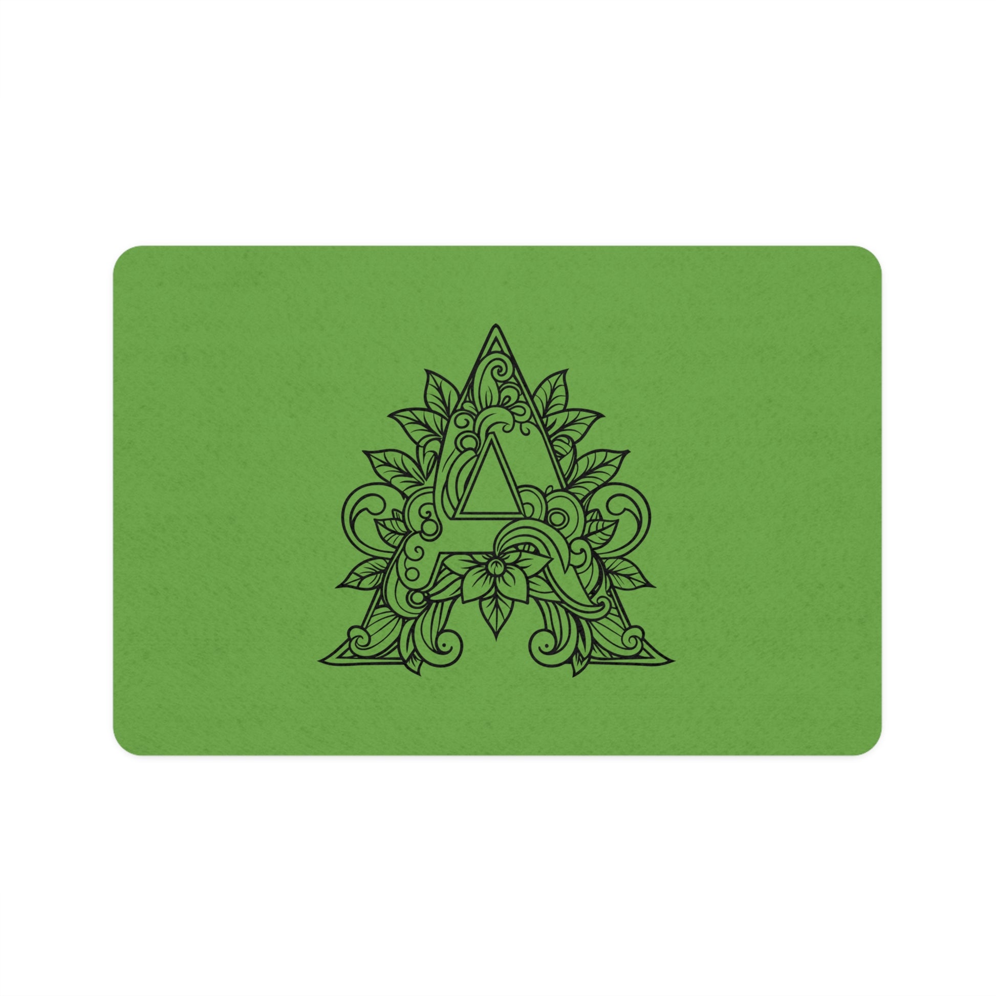 A soft, quick-drying pet food mat that brings a touch of handcrafted charm to meal time. The smooth polyester surface showcases a detailed, ornamental letter 'A' centered on a lively green field, while the neoprene rubber backing grips floors so bowls stay put. It cleans easily and keeps bright color and contrast wash after wash. This mat fits neatly beneath food and water dishes, cutting down spills and giving your pet a dedicated, stylish feeding spot that blends function with a little artistic flair.