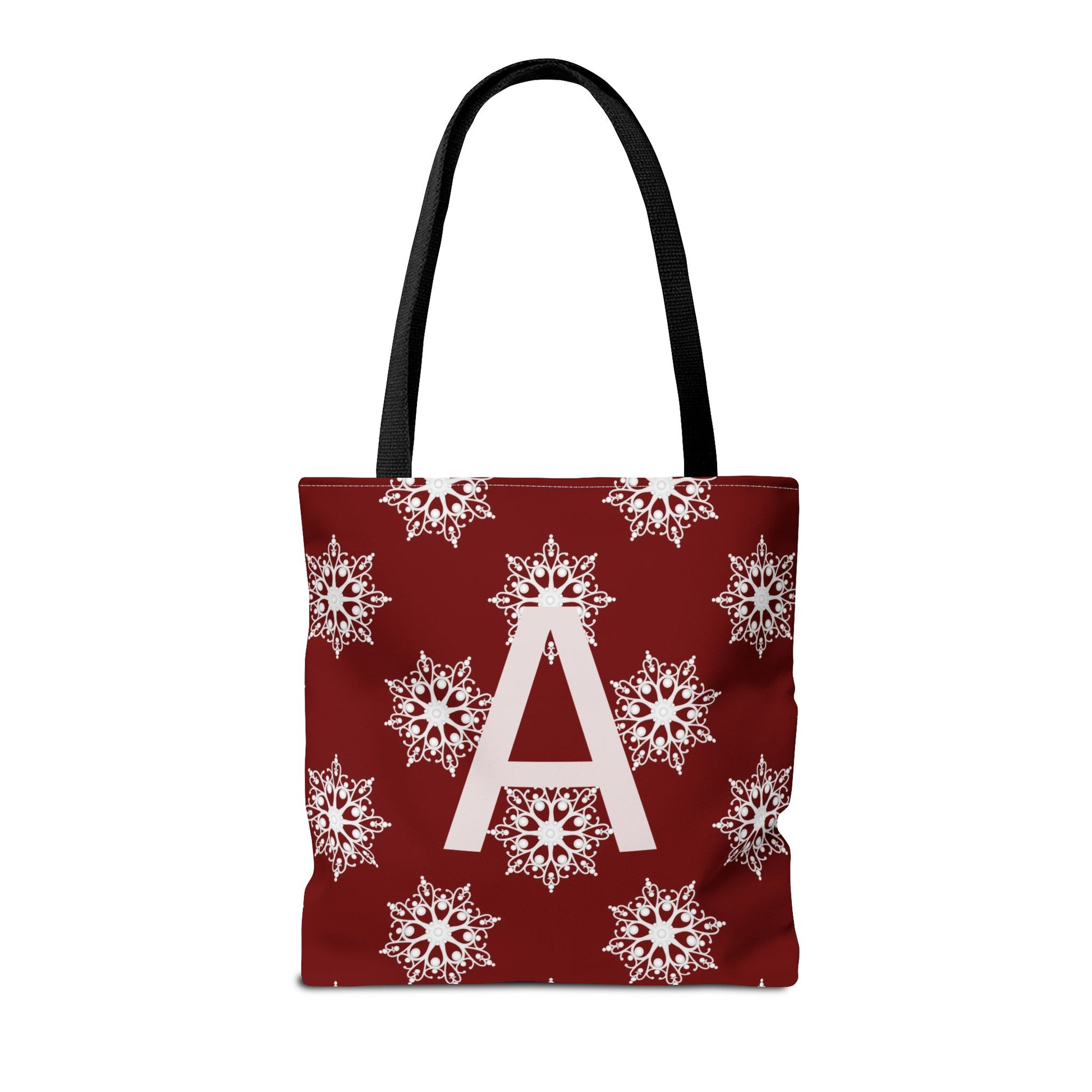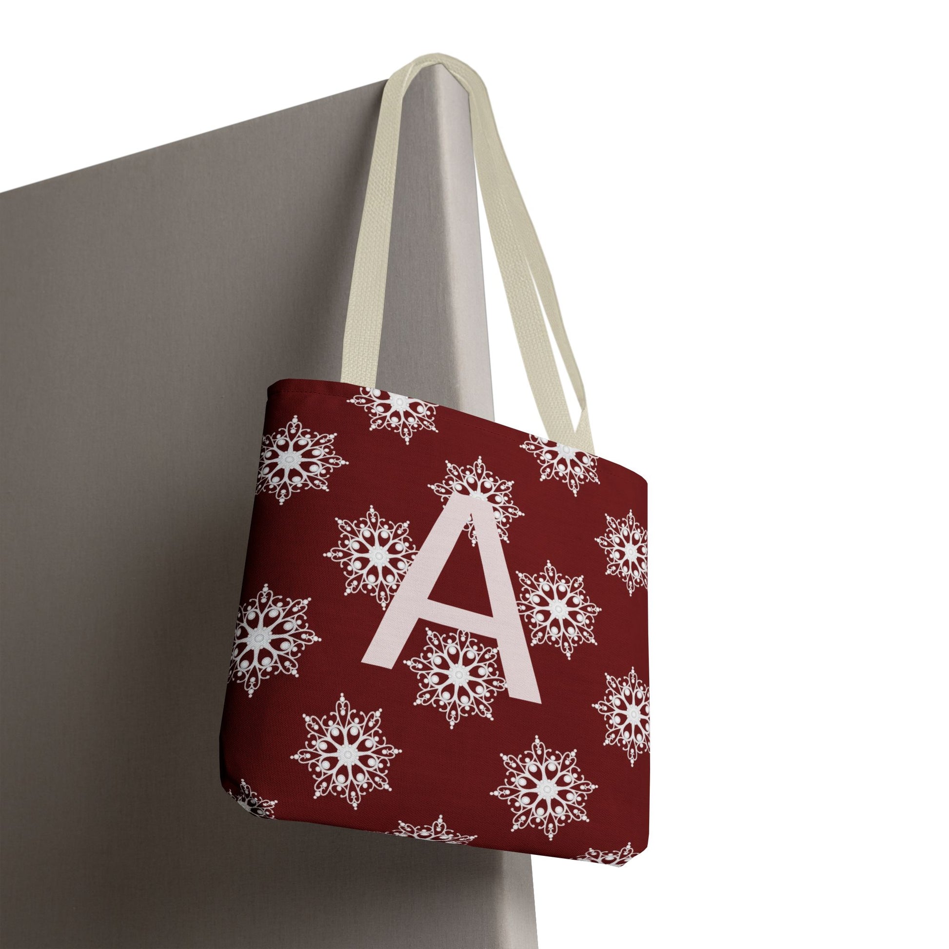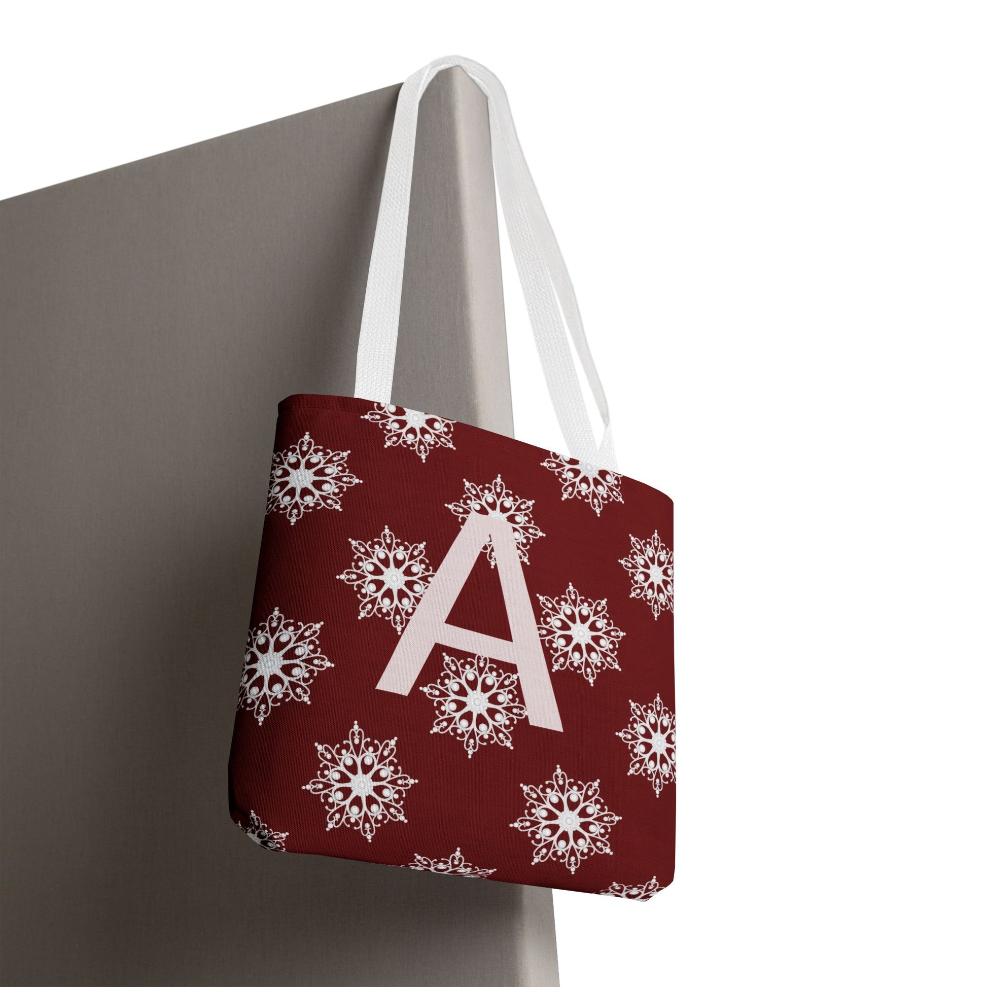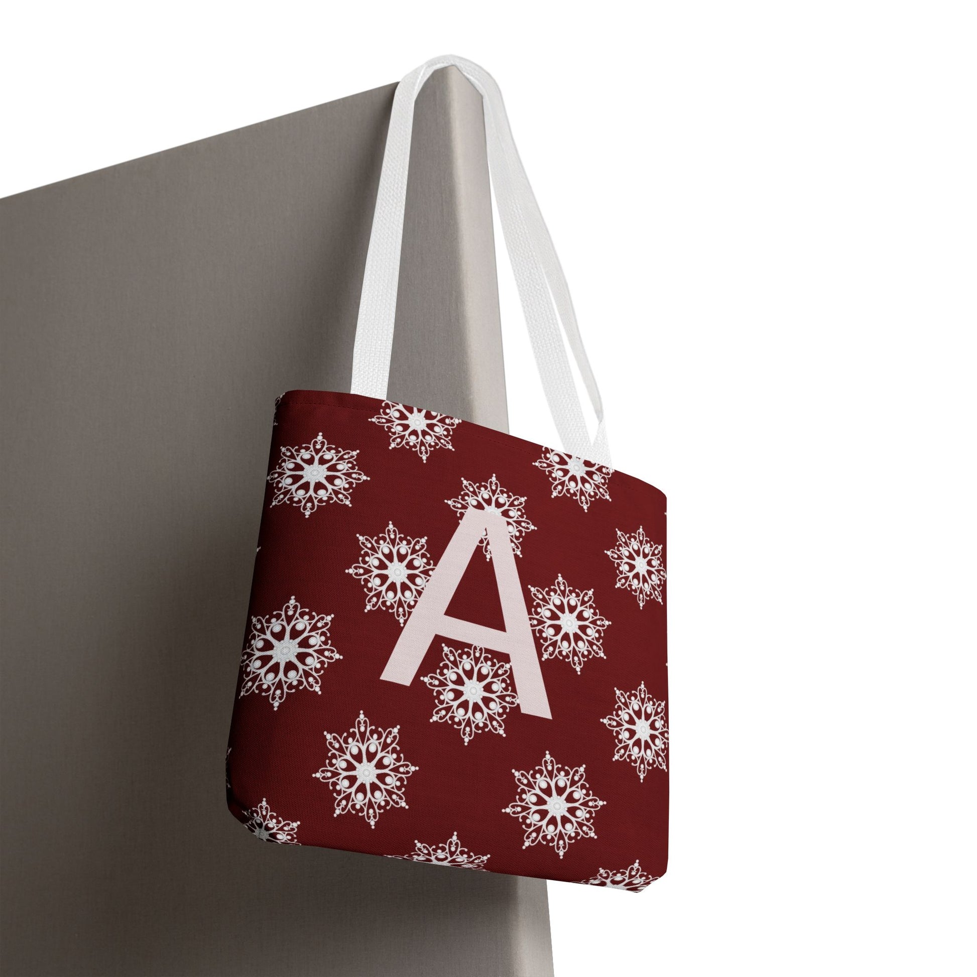 Monogram A Snowflake Tote Bag — Personalized Holiday AOP Tote